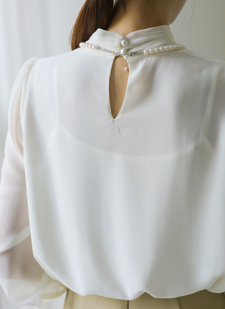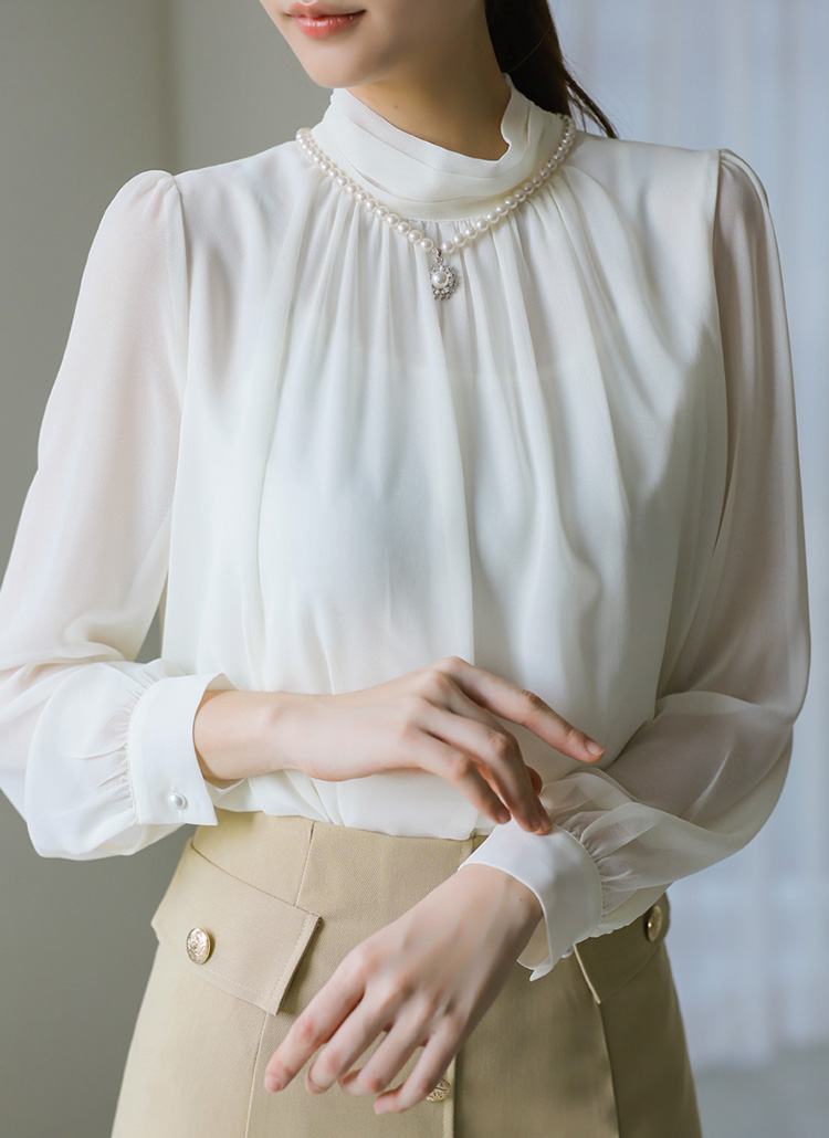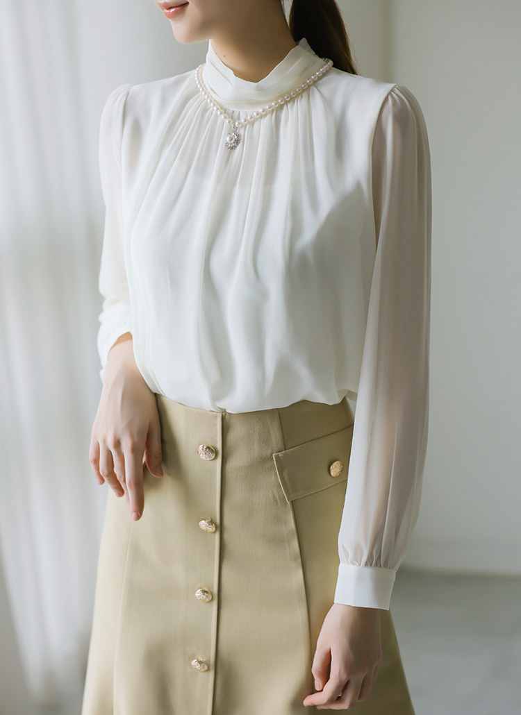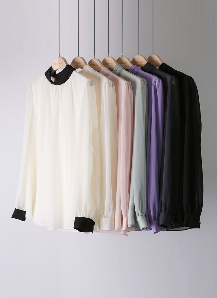 페이디 플리츠 하이넥 셔링 쉬폰 블라우스