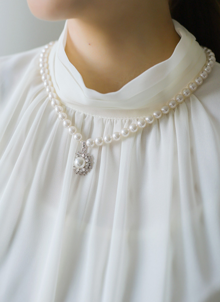 잔잔한 셔링과 플리츠 하이넥으로 우아한 페미닌 무드를 연출하는