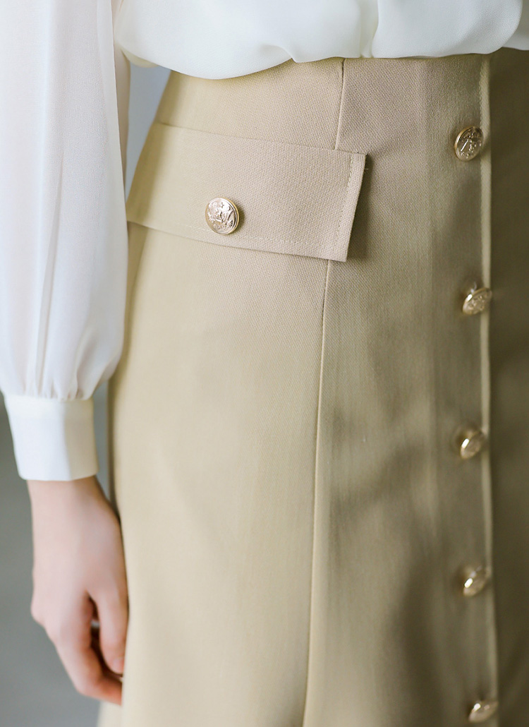 리모어 골드 버튼 절개 머메이드 플레어 라인 미디 스커트