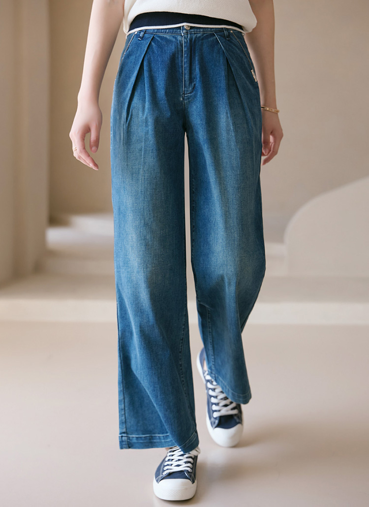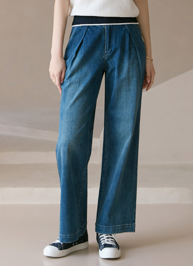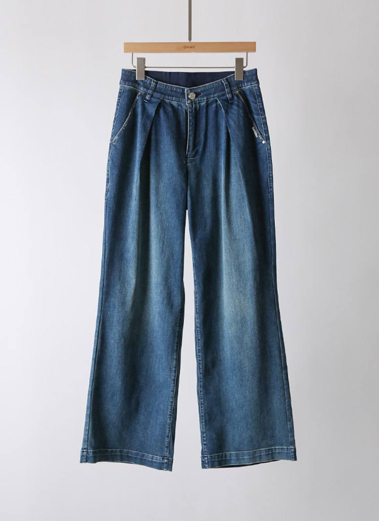 다니모 블링 라인 맞주름 핀턱 세미 와이드 데님 팬츠