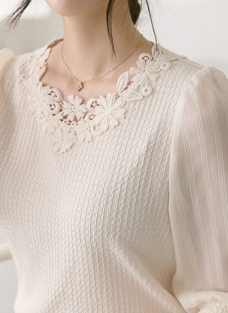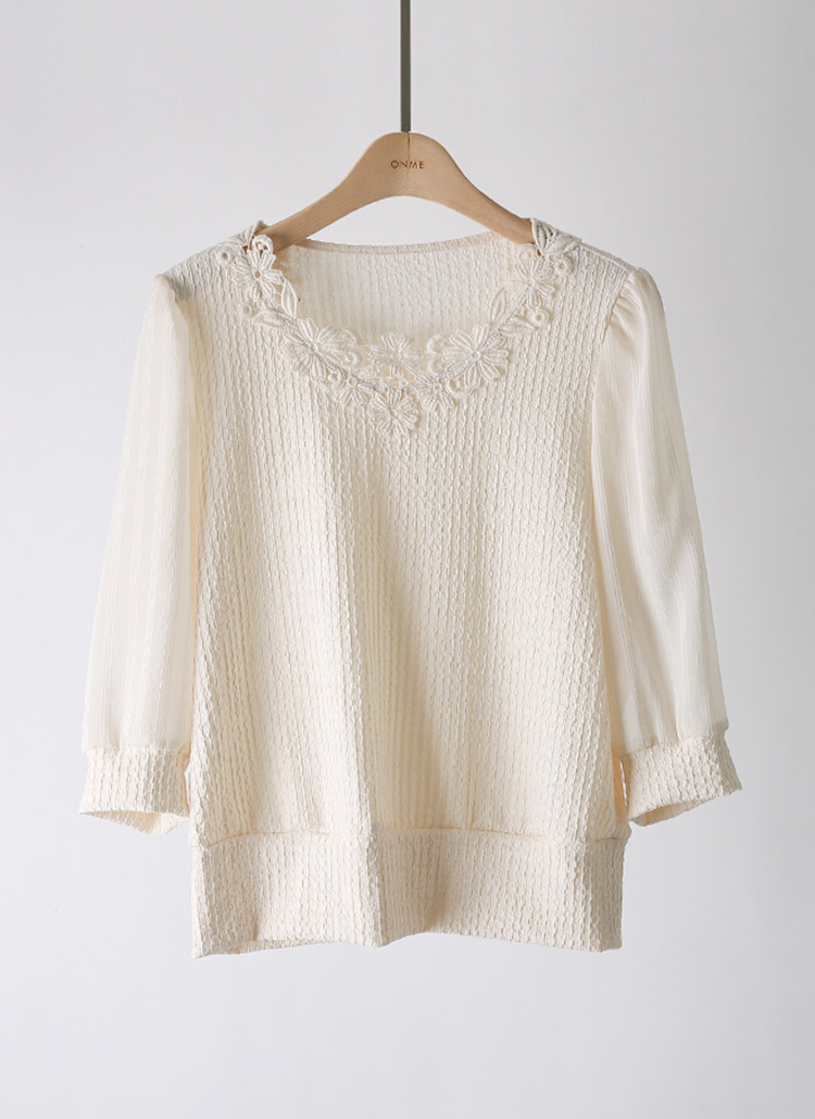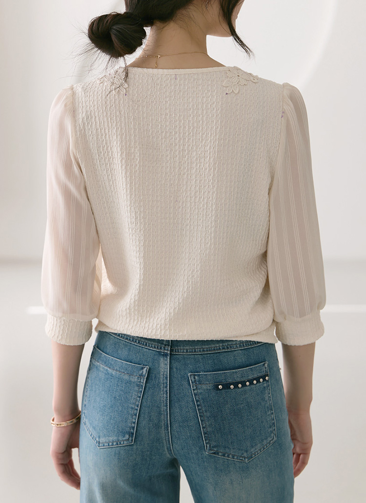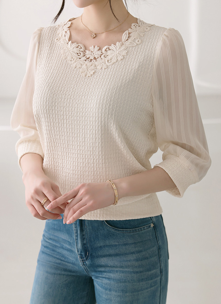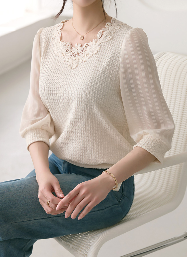 [LouisAngel] 이젤 모티브 플라워 레이스 쉬폰 소매 배색 쟈가드 블라우스 티