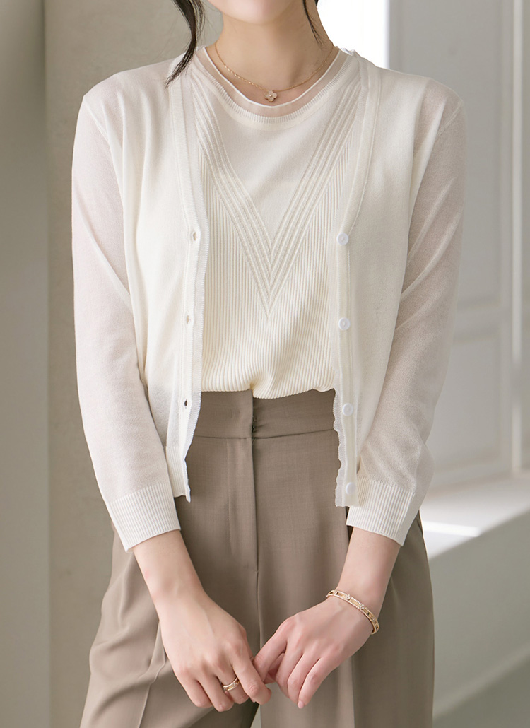 에스트 시스루 라인 배색 V 쟈가드 골지 니트 나시
