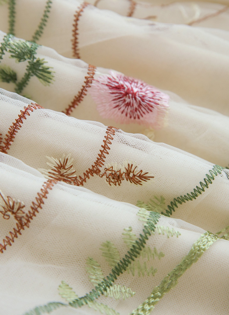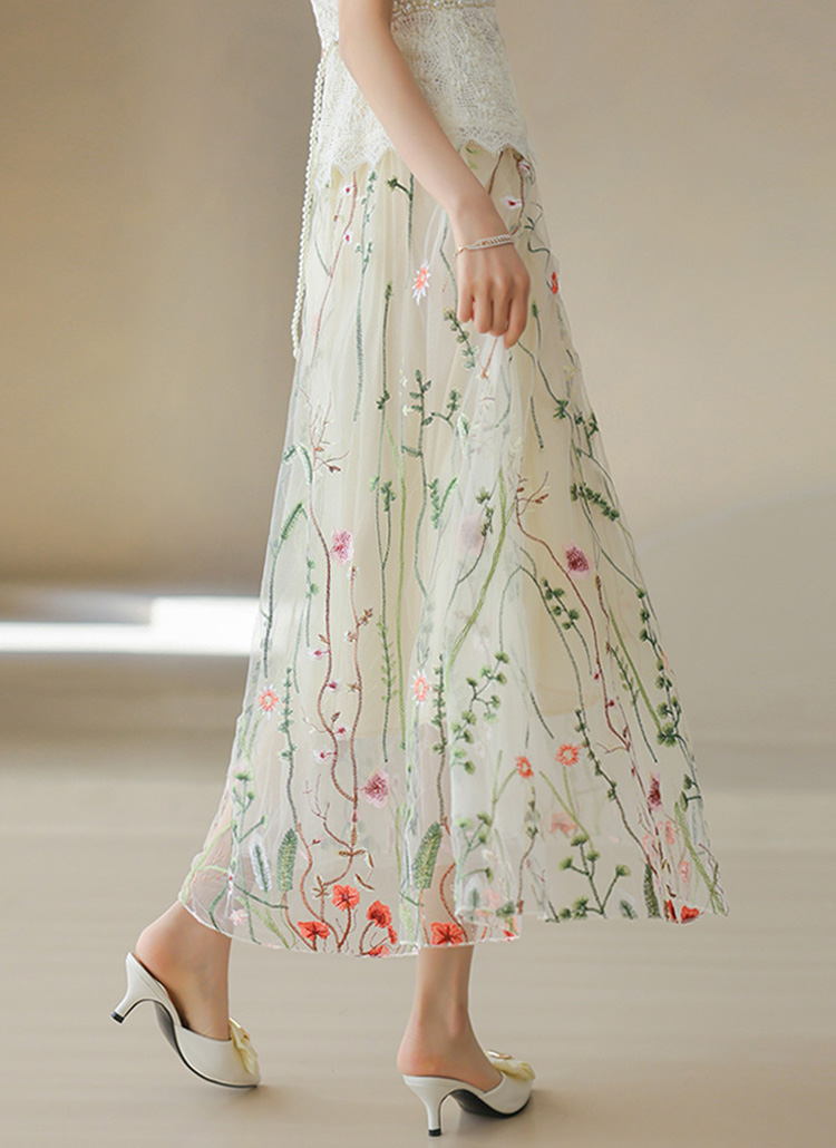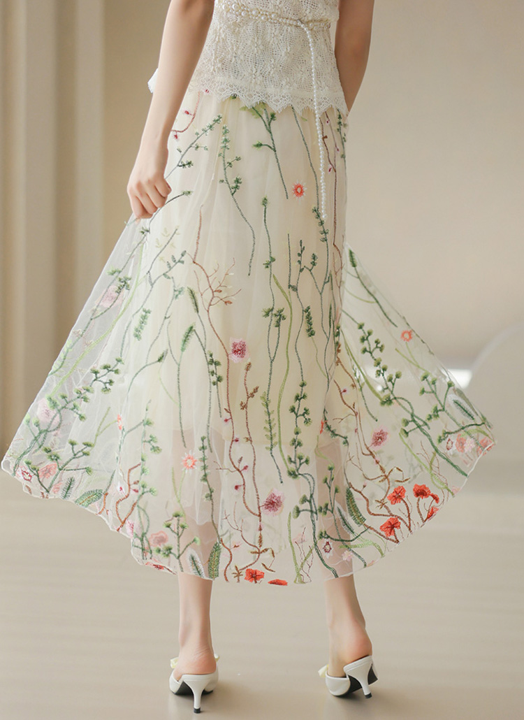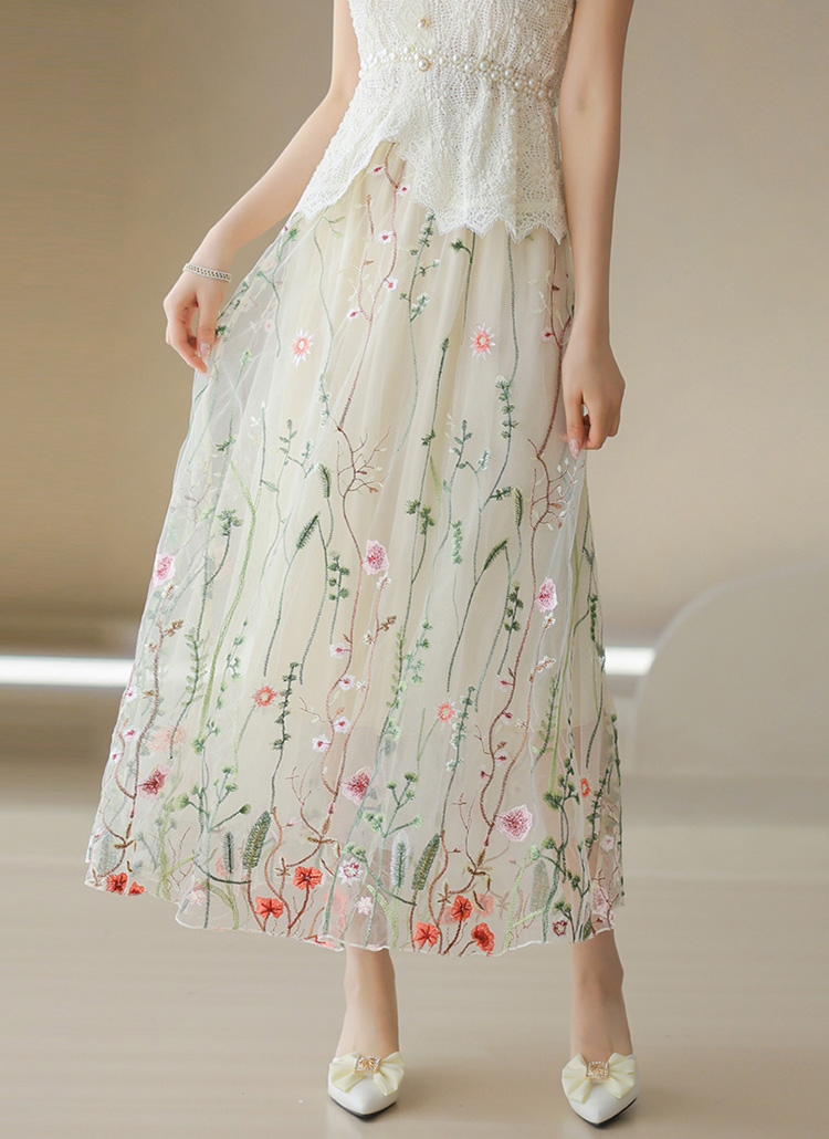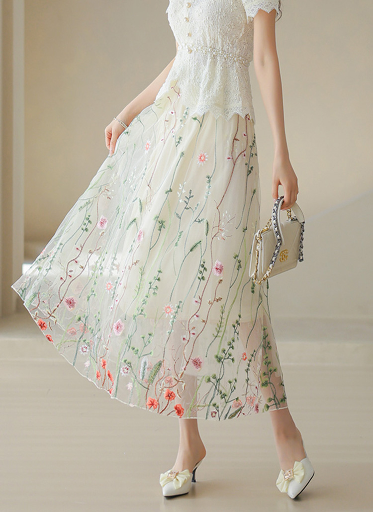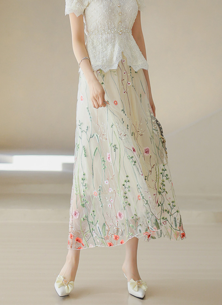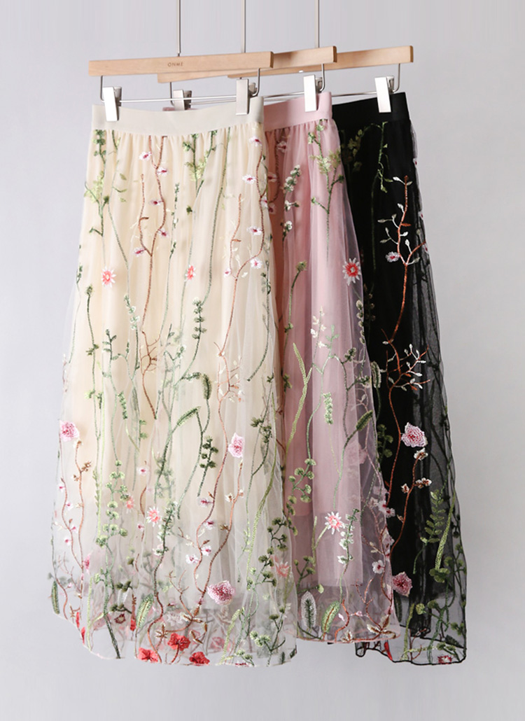 벨라 플라워 가든 컬러 자수 디테일 샤 레이스 A라인 롱 스커트