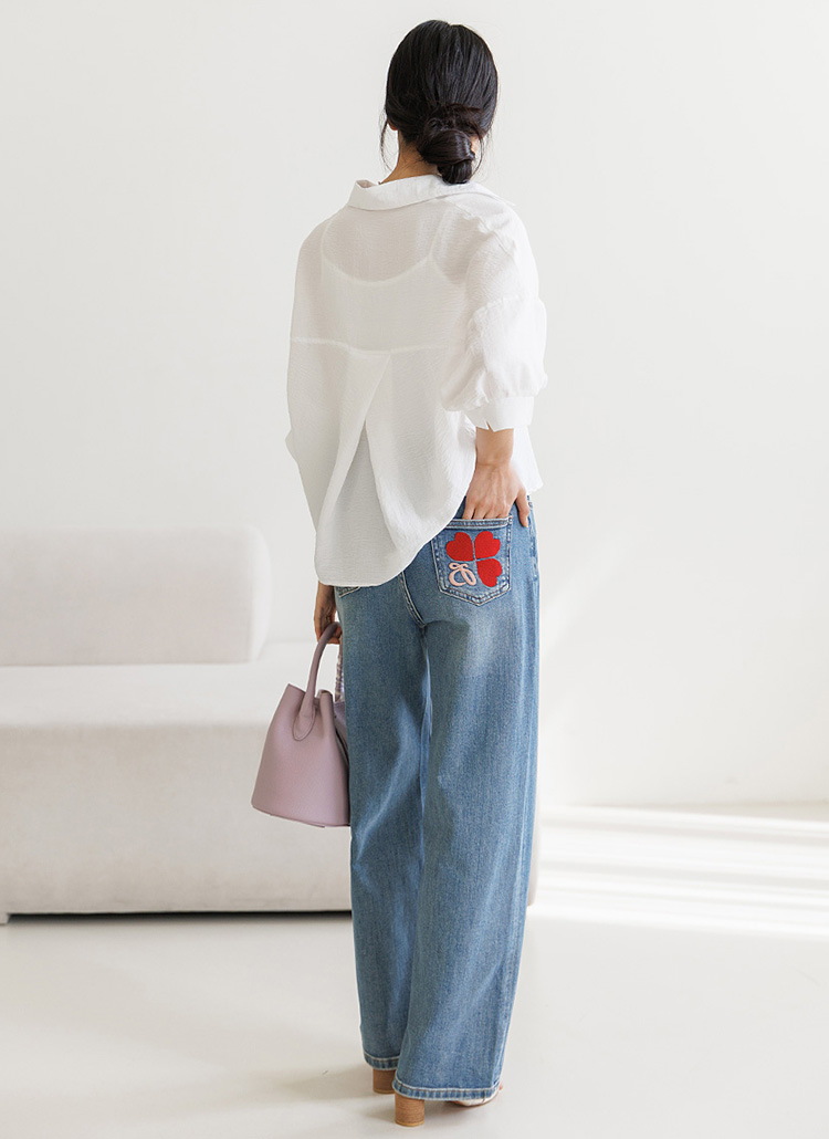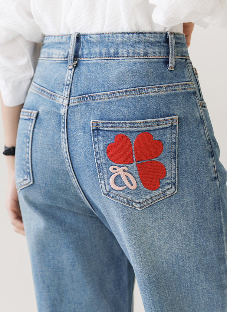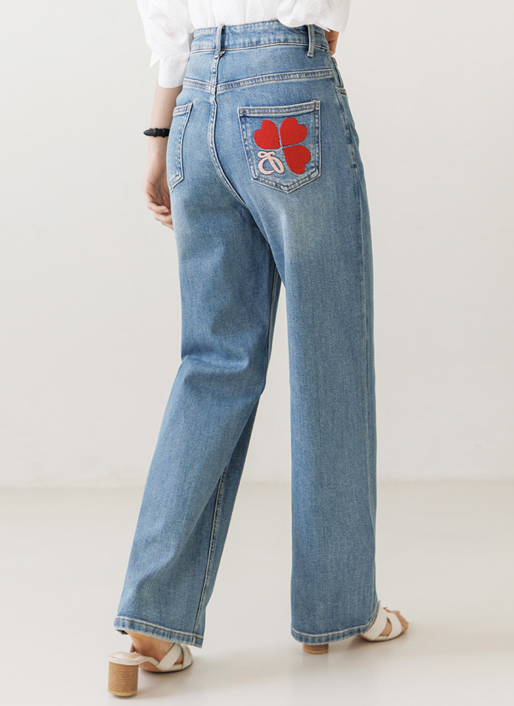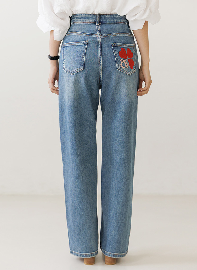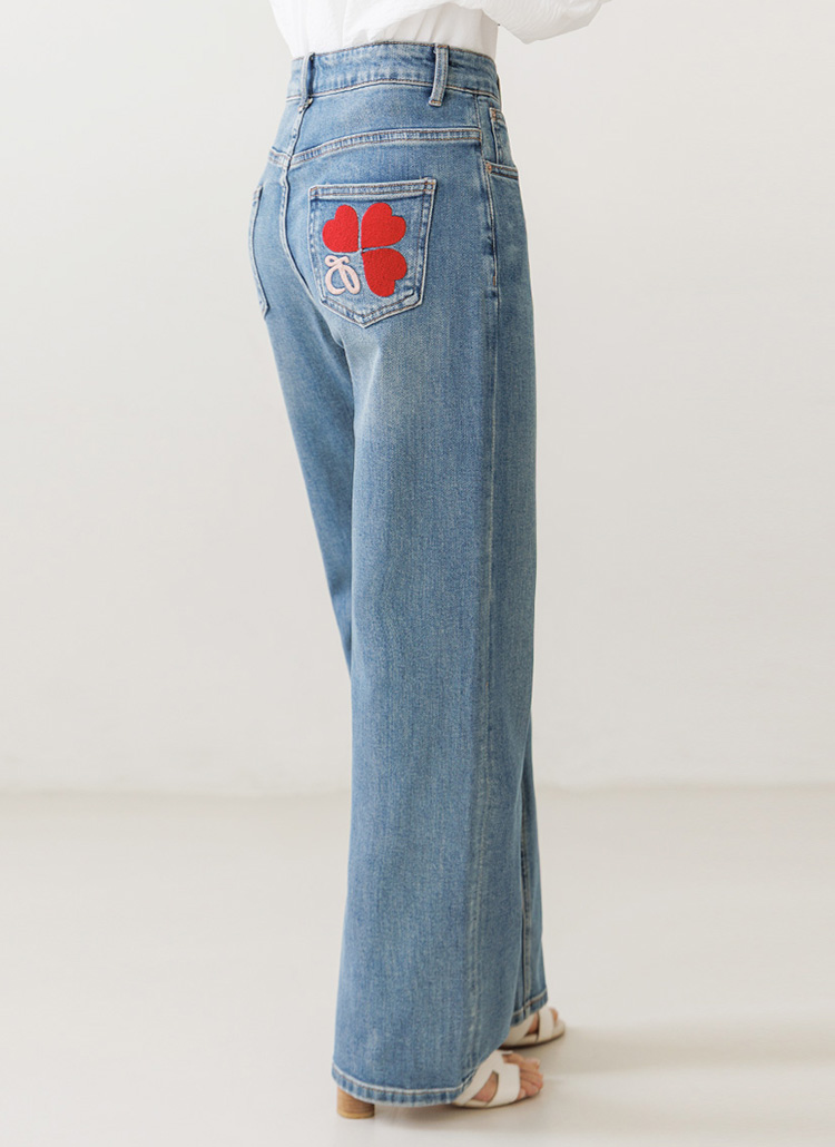 [Theonme] 레드하트 힙포켓 자수 세미와이드 데님 팬츠