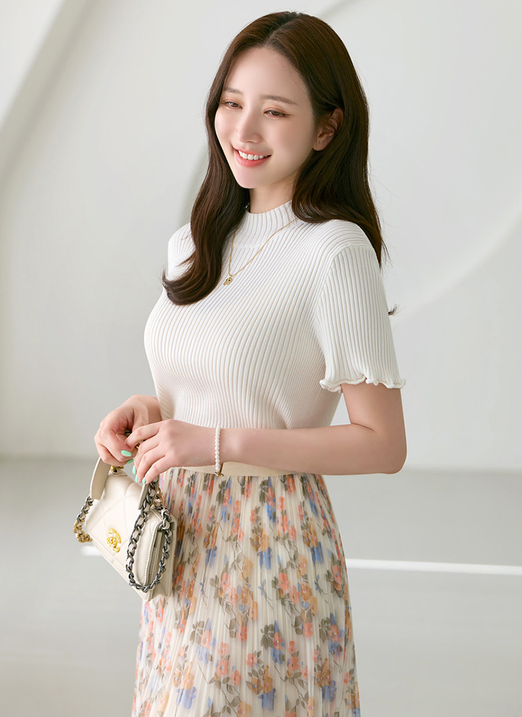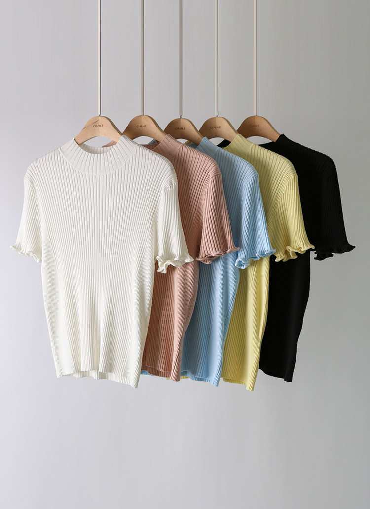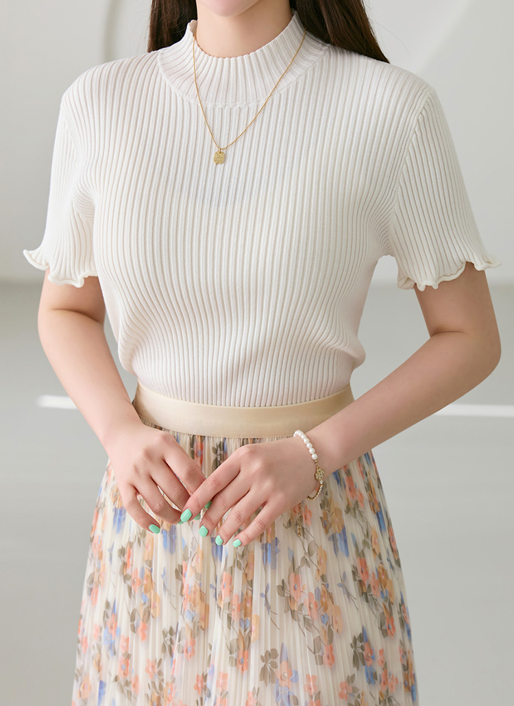 쿠알로 러플 소매 비스코스 반목 슬림 골지 니트