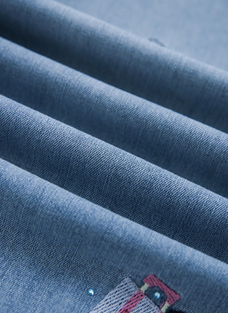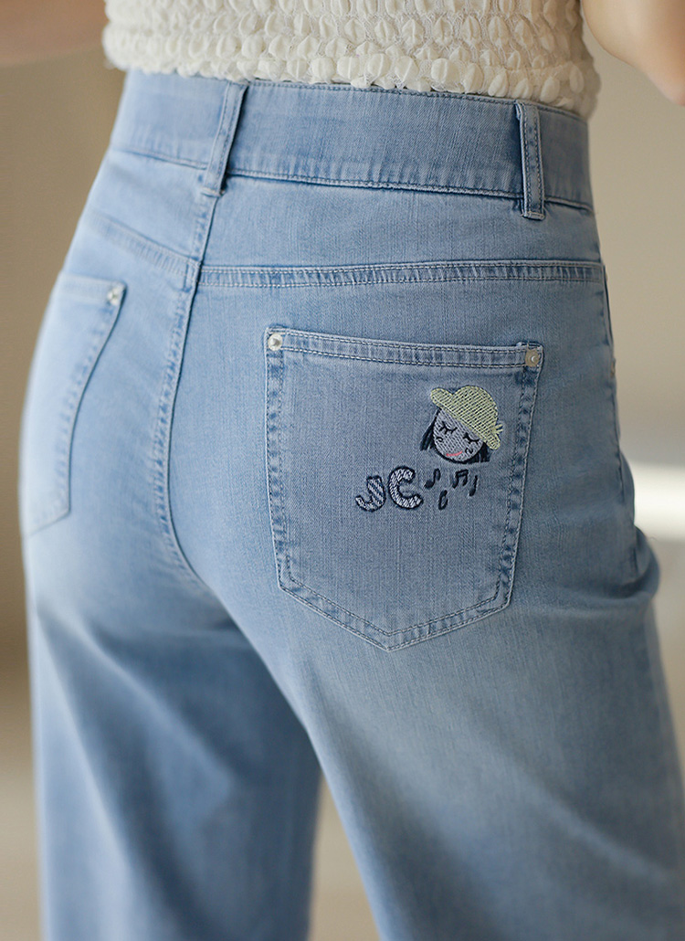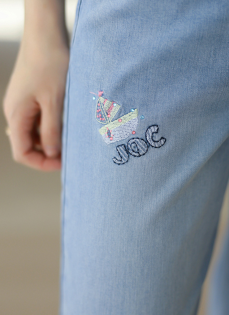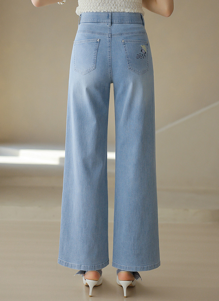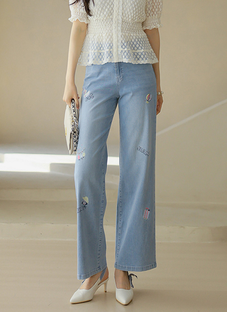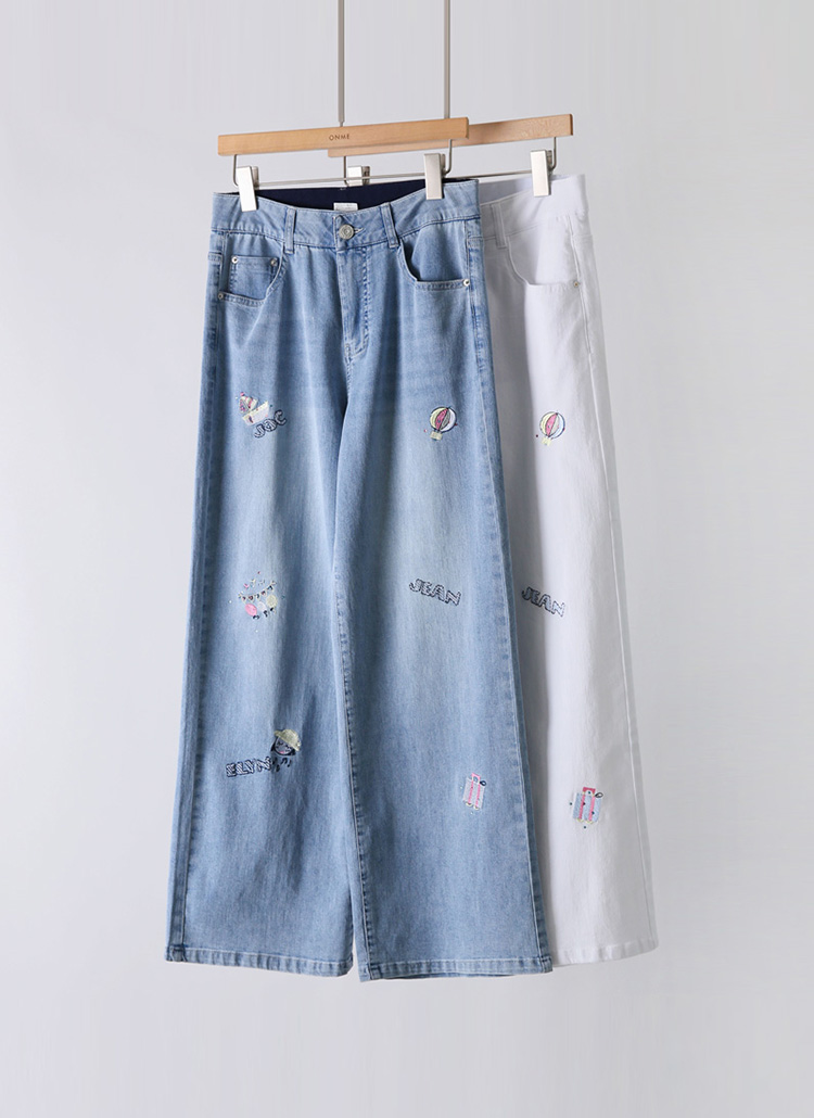 트래블리 컬러팝 자수 핫픽스 디테일 세미 와이드 데님 팬츠