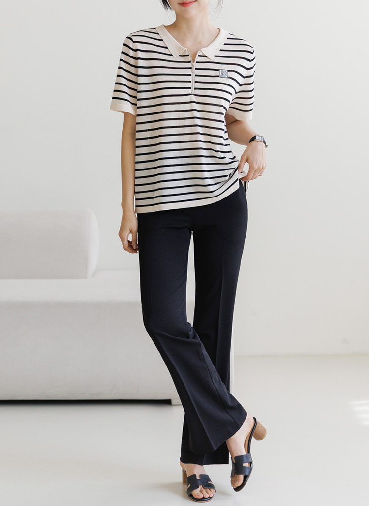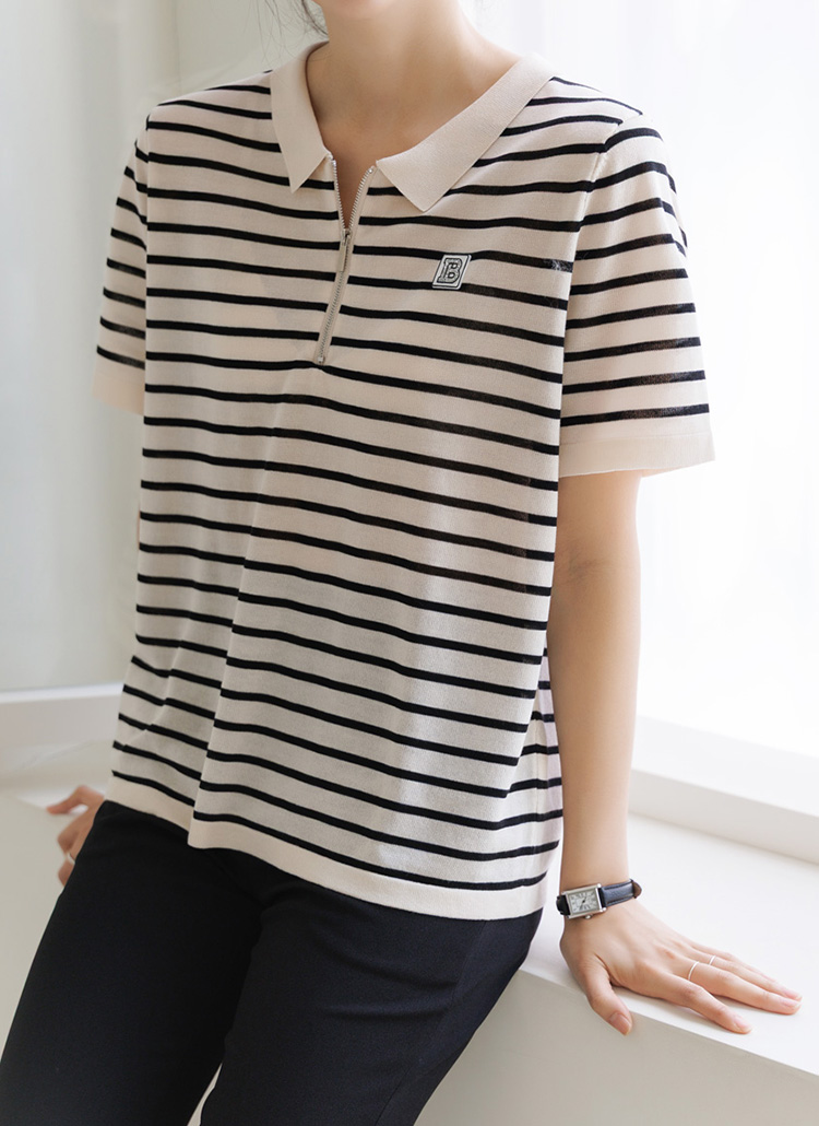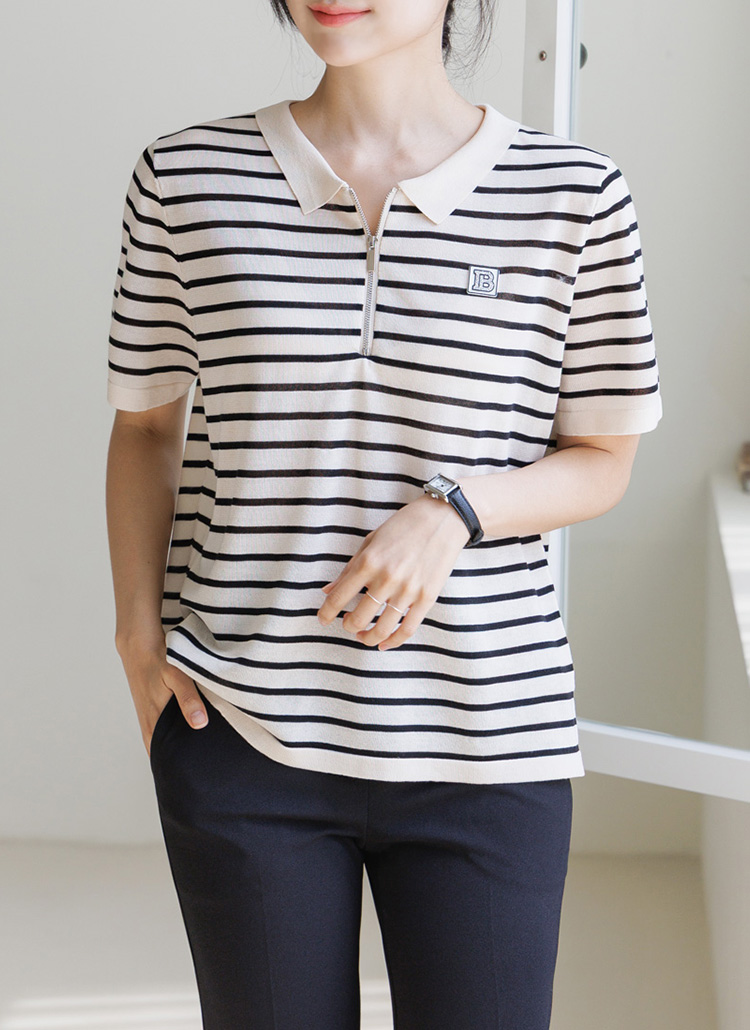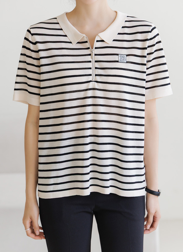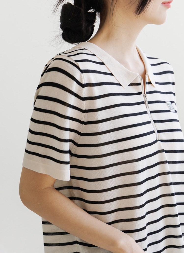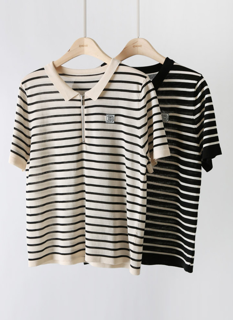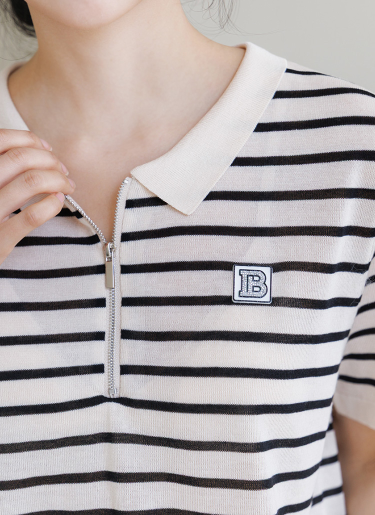[Theonme] 비즈 레터링 패치 스트라이프 반집업 니트