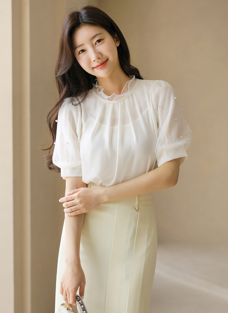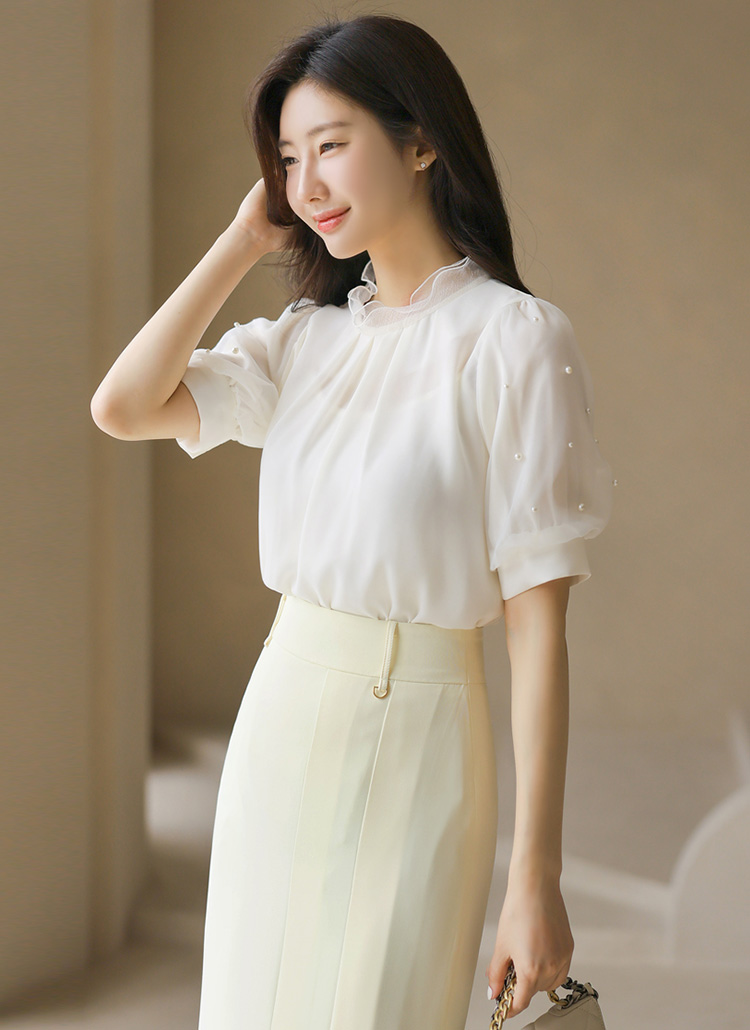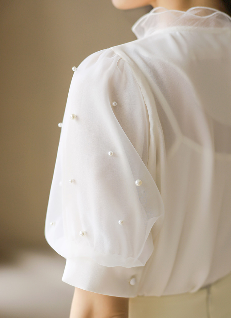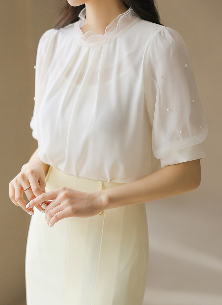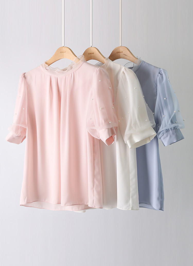 로에블 진주 퍼프소매 시스루 러플넥 블라우스