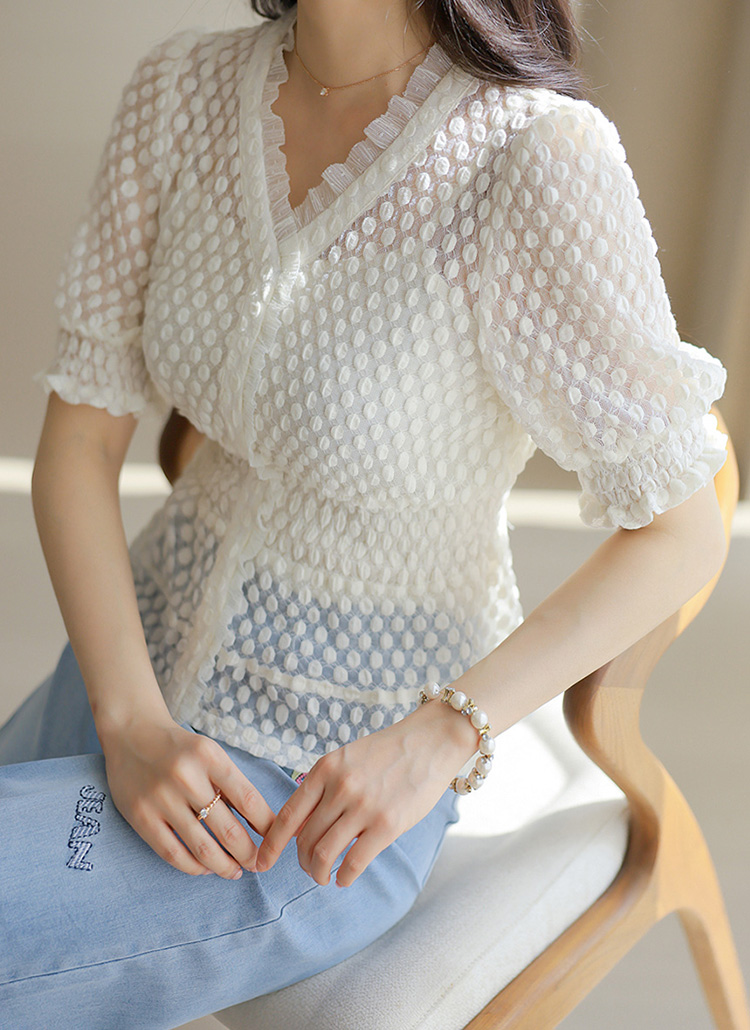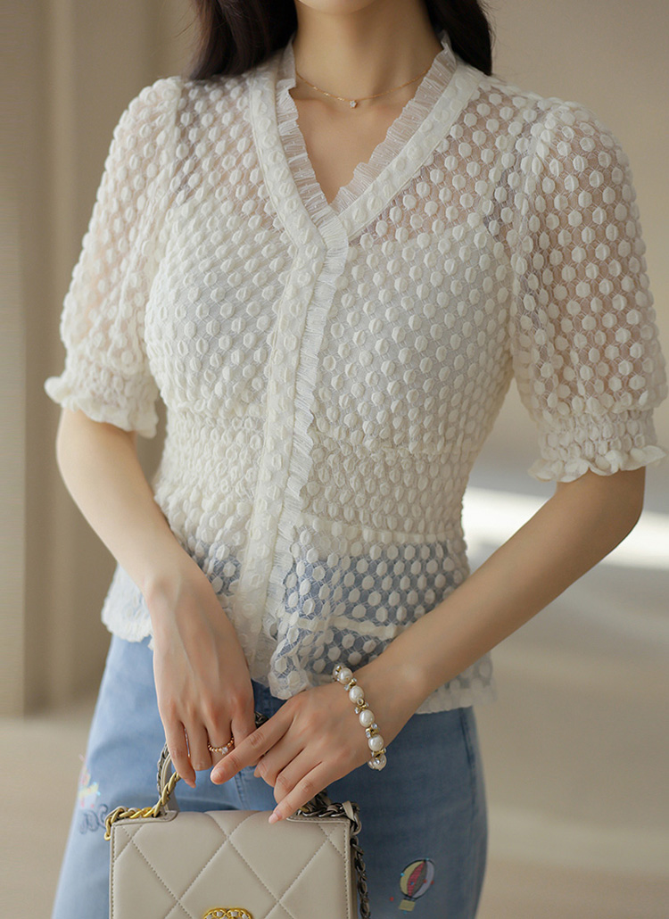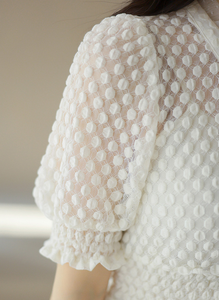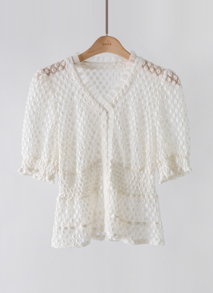 [LouisAngel] 멜리아 시스루 엠보 도트 쟈가드 레이스 허리 스모킹 페플럼 블라우스