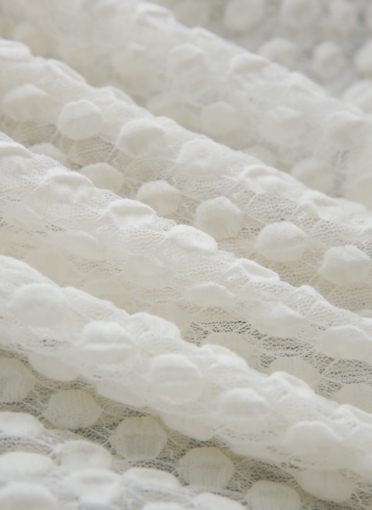 시스루한 도트 패턴에 아래로 셔링지며 퍼지는 페플럼 디자인으로