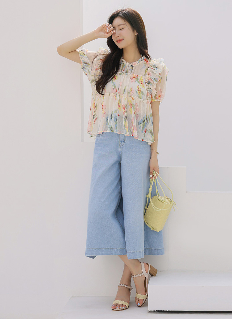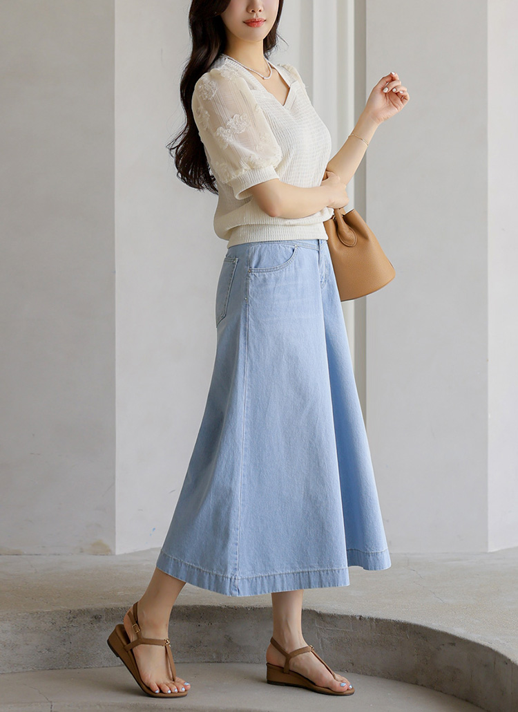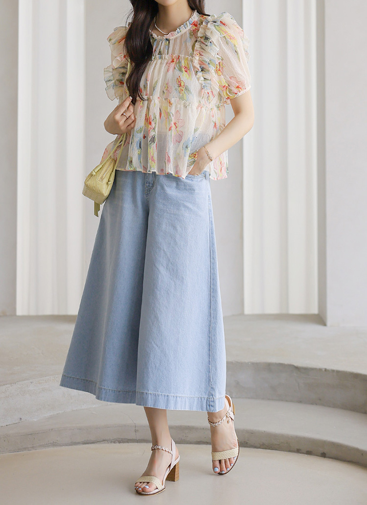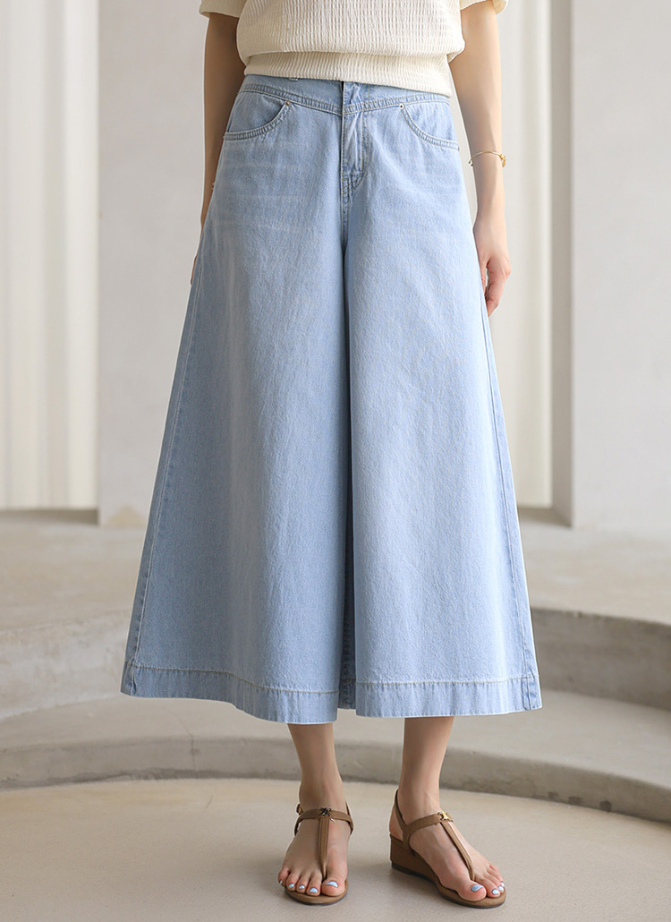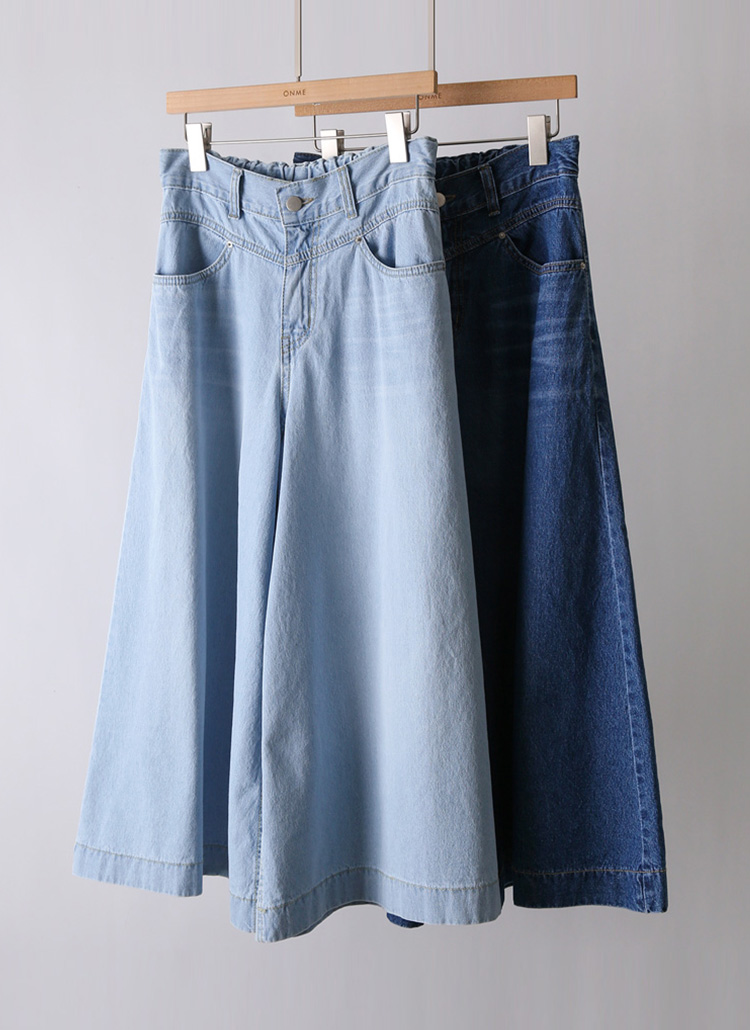 치마바지처럼 연출되어 페미닌한 무드가 돋보이는 데님 팬츠에요 :)