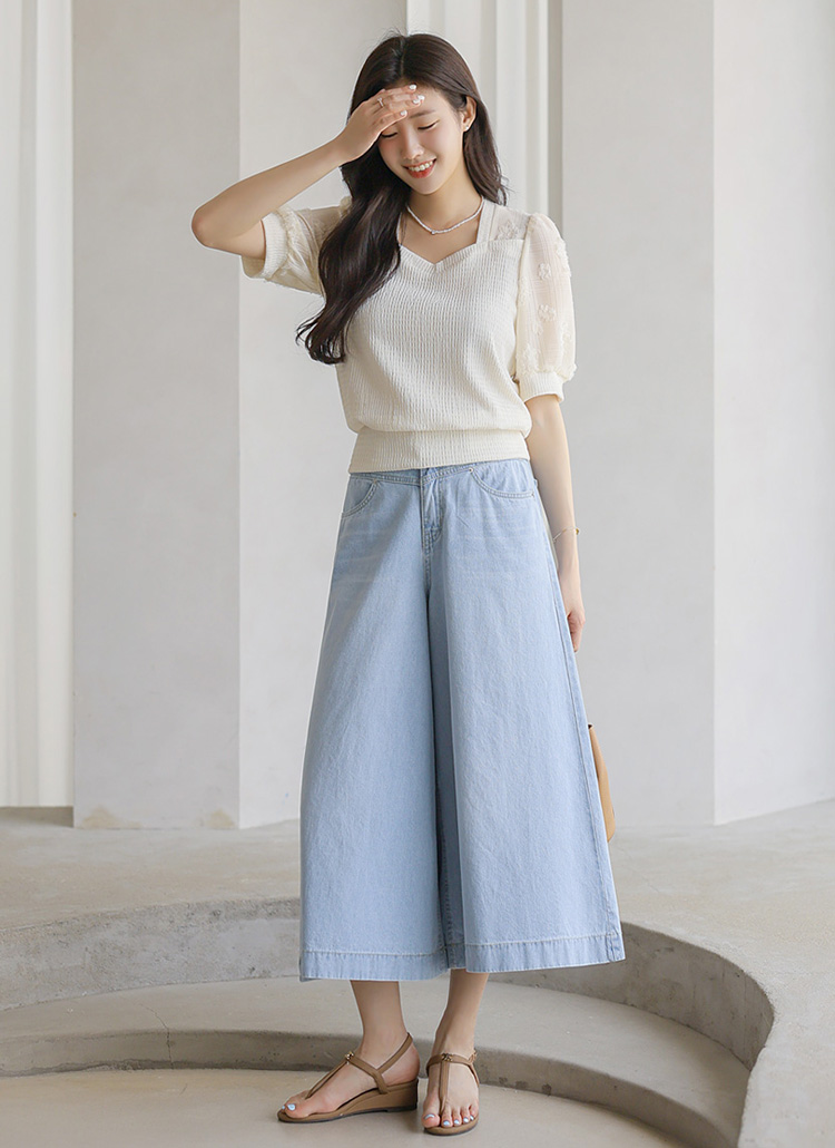 치마바지처럼 연출되어 페미닌한 무드가 돋보이는 데님 팬츠에요 :)