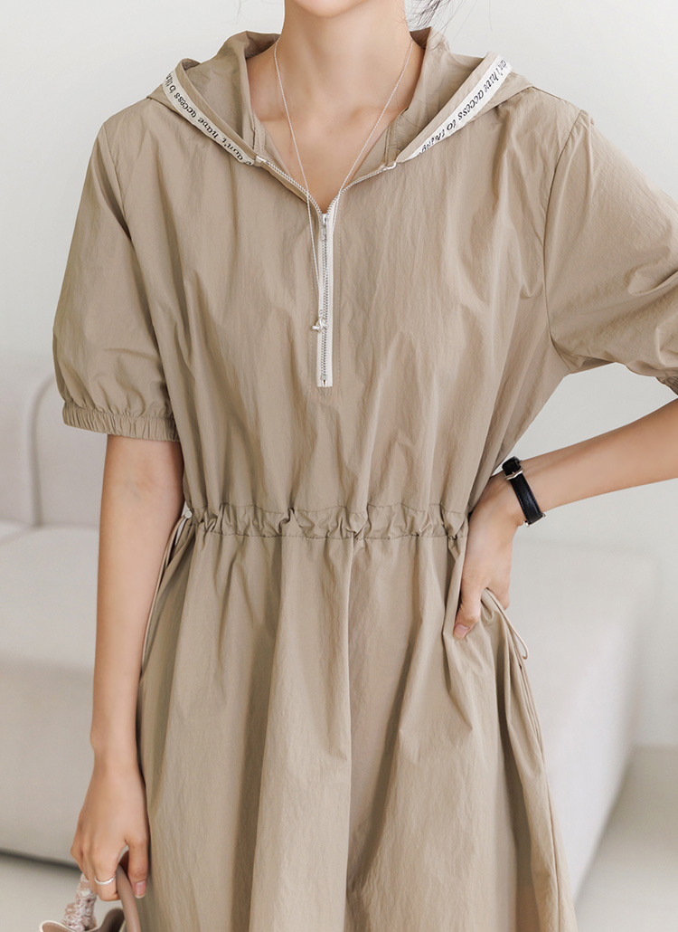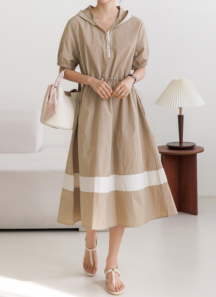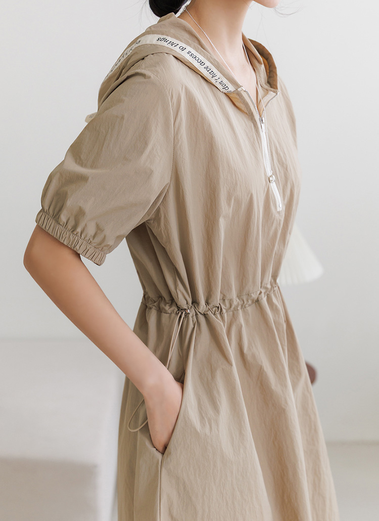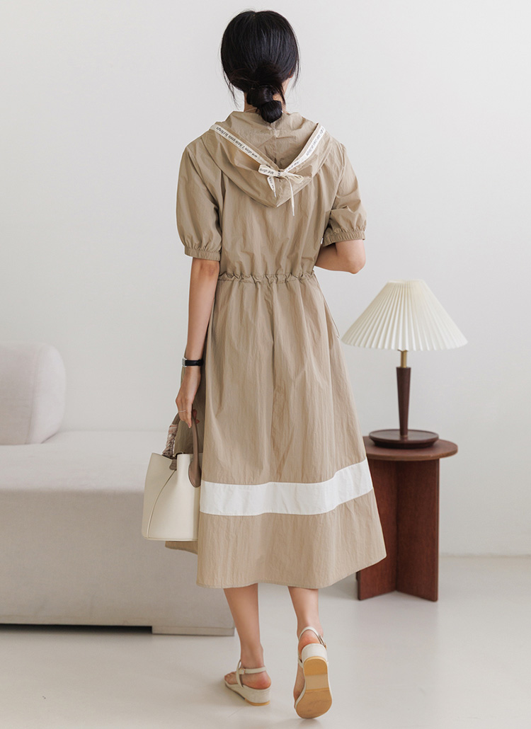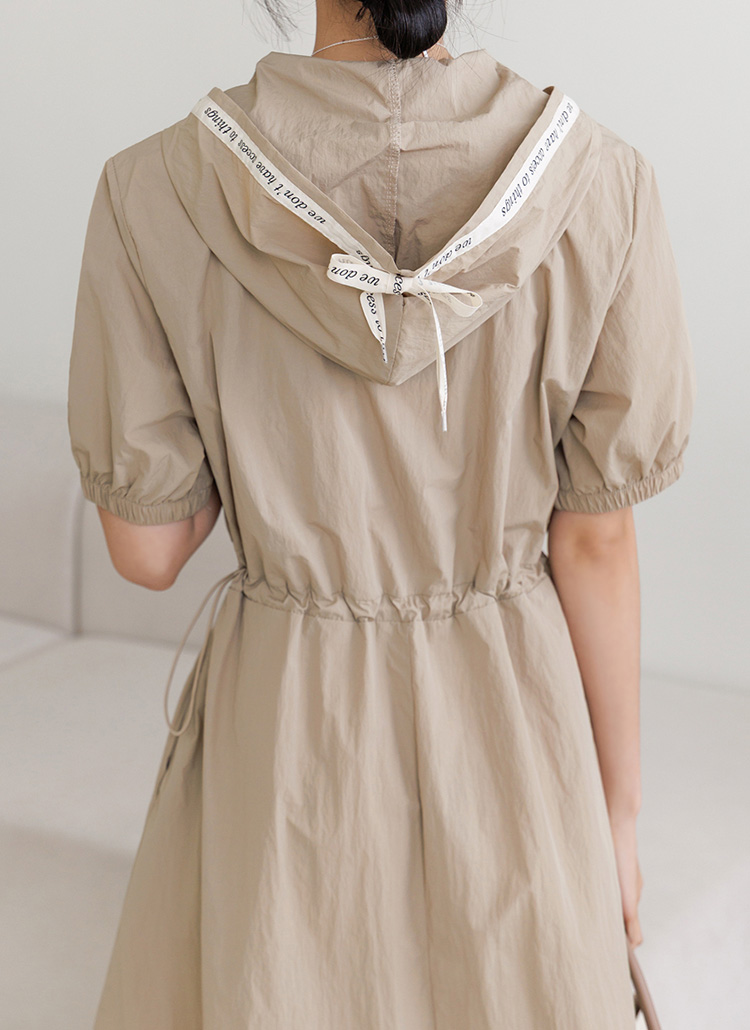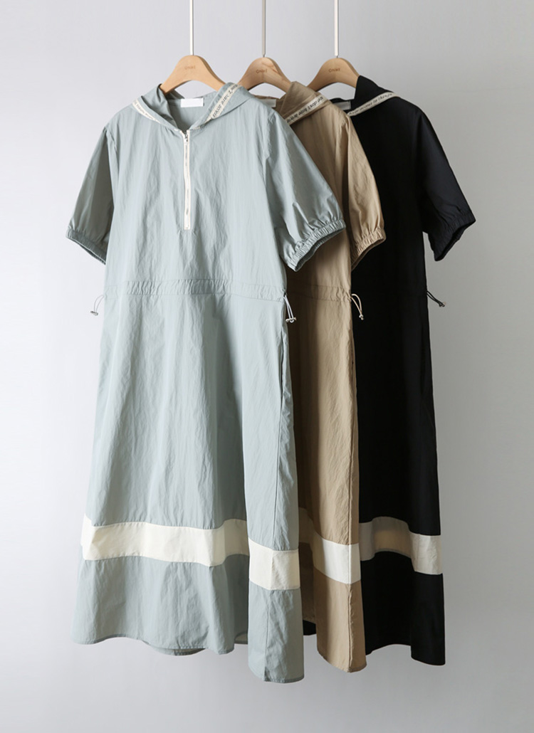 [Theonme] 테이핑 리본 후드 배색 나일론 반집업 원피스
