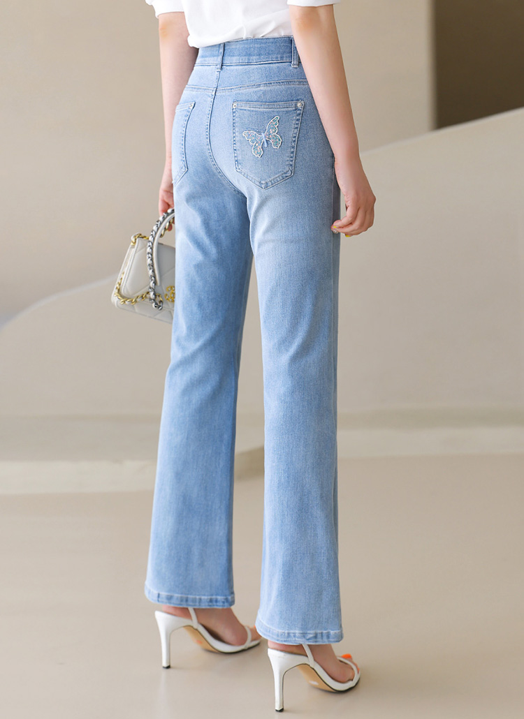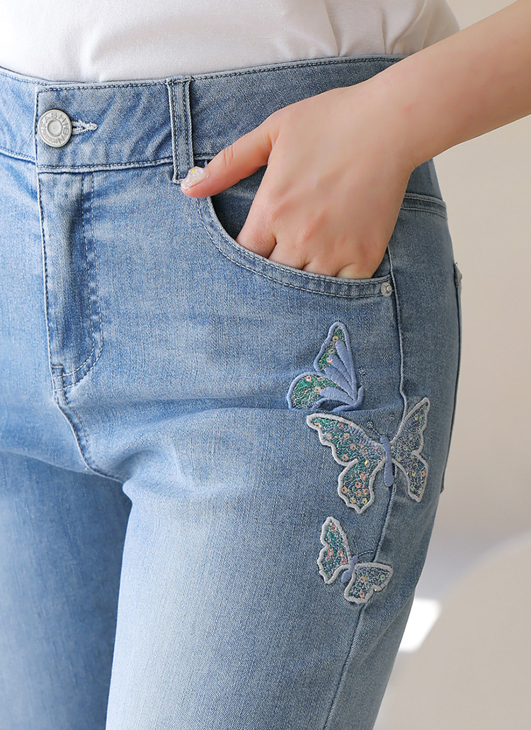 글램 버터플라이 펄 스팽글 자수 포인트 슬림 부츠컷 팬츠