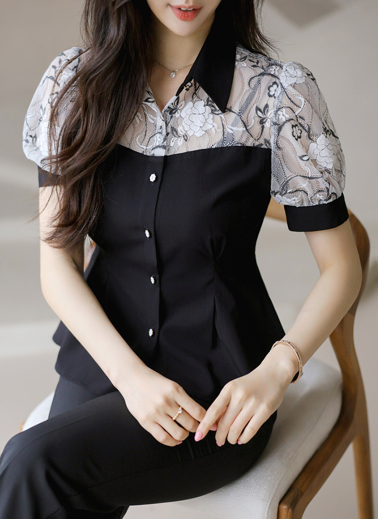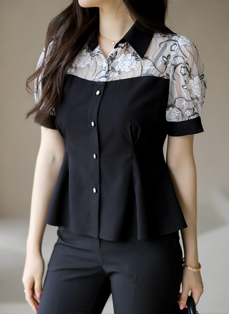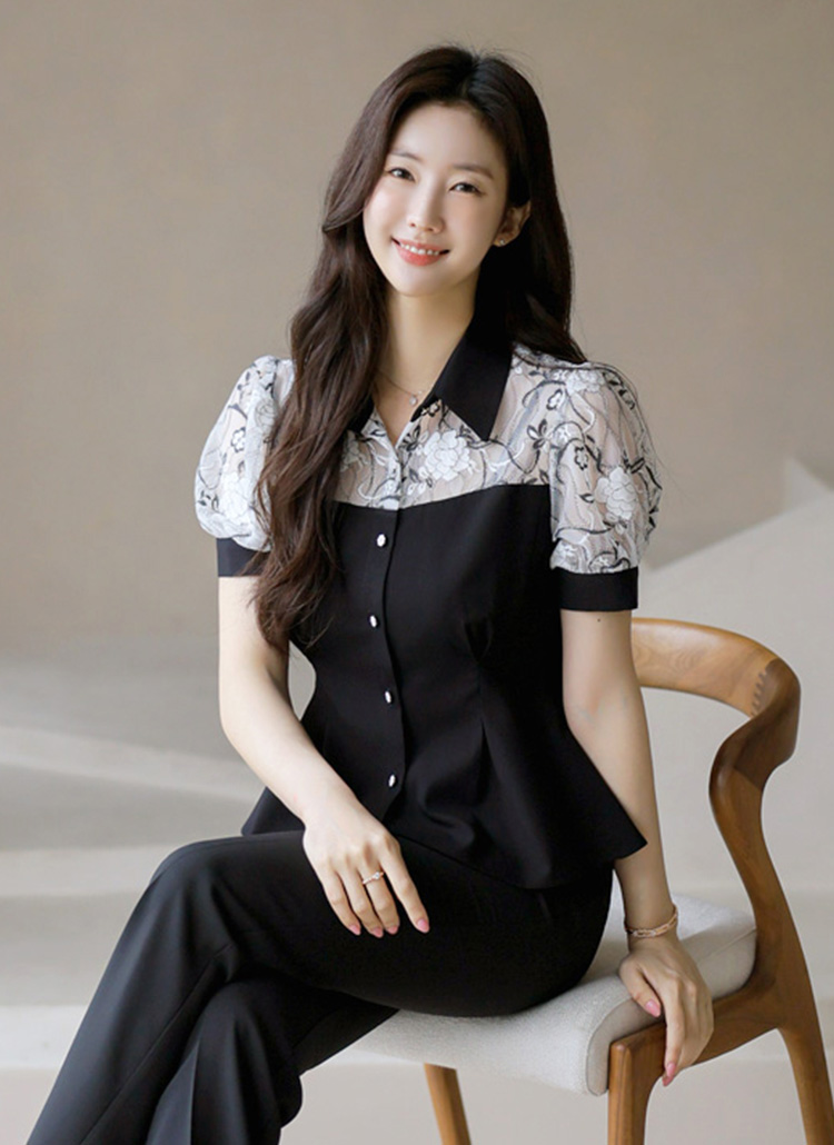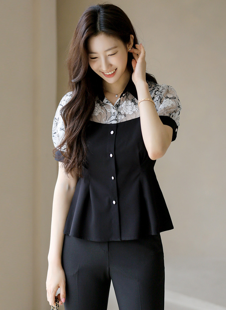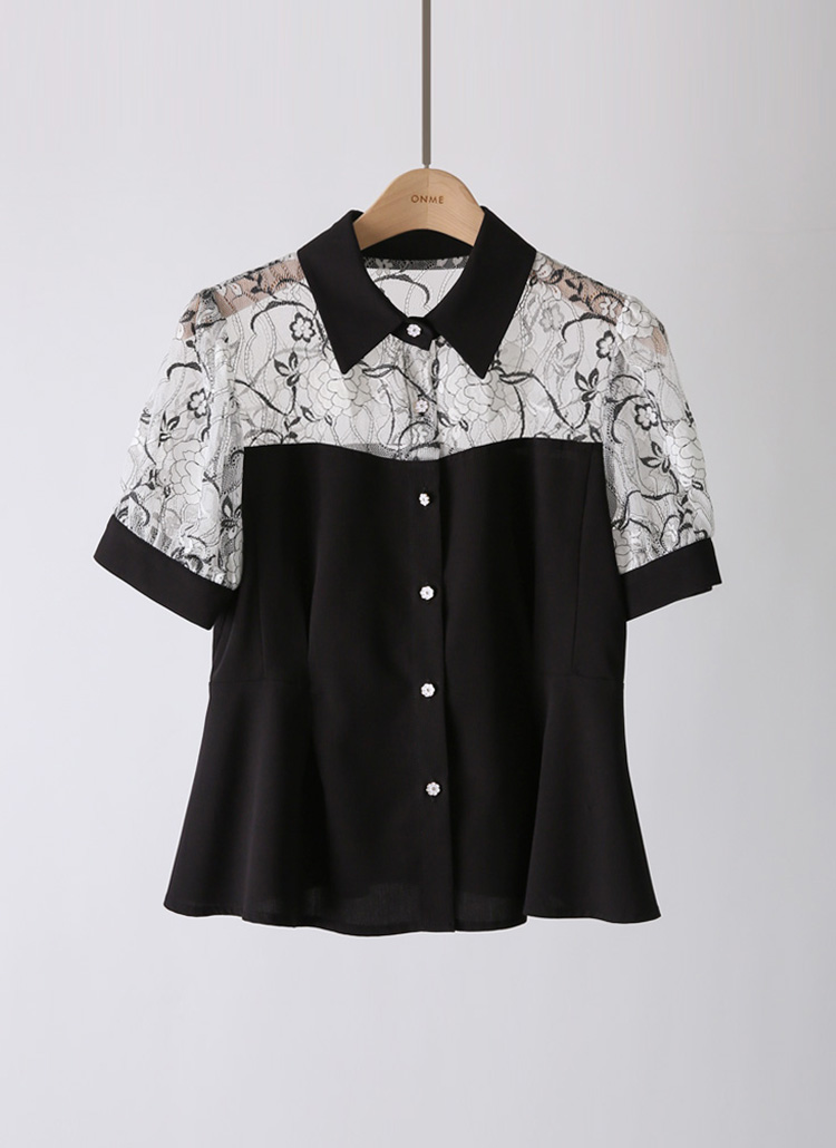 [LouisAngel] 뷔스티에 플라워 레이스 배색 페플럼 카라 블라우스