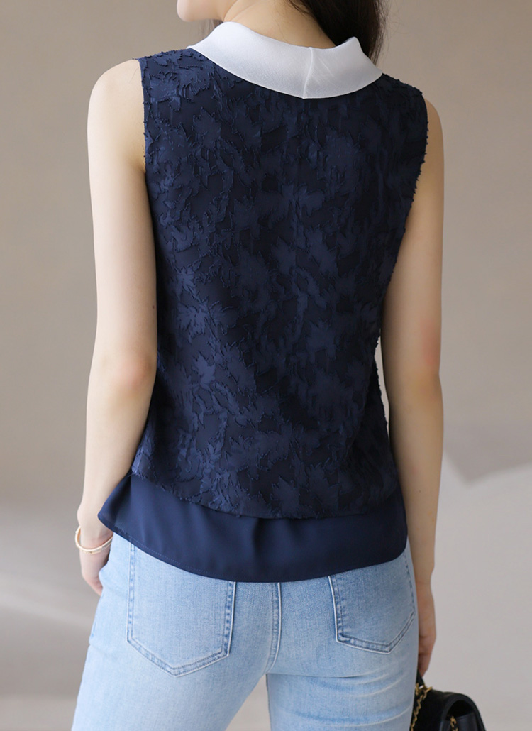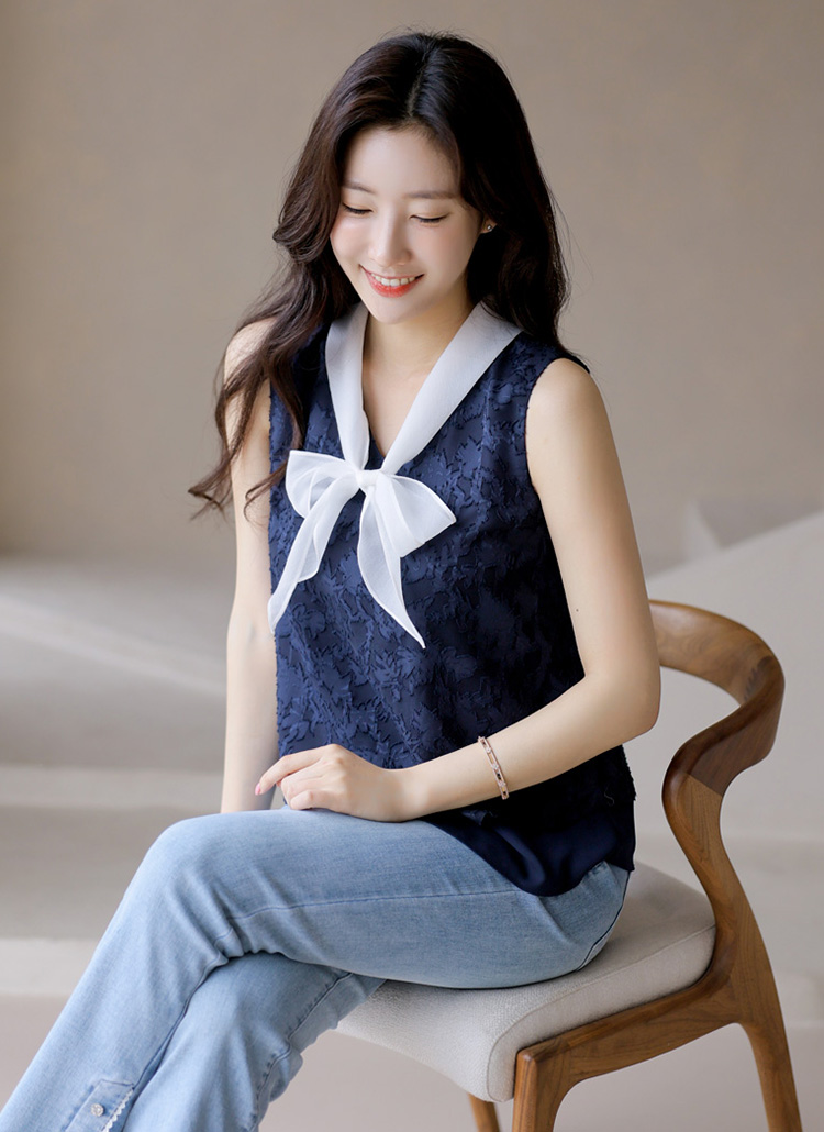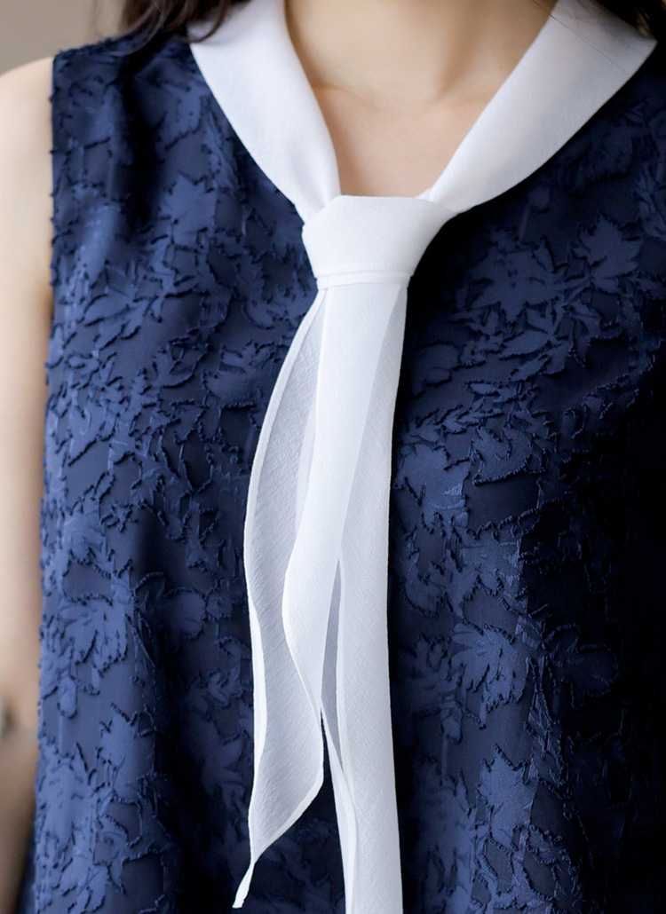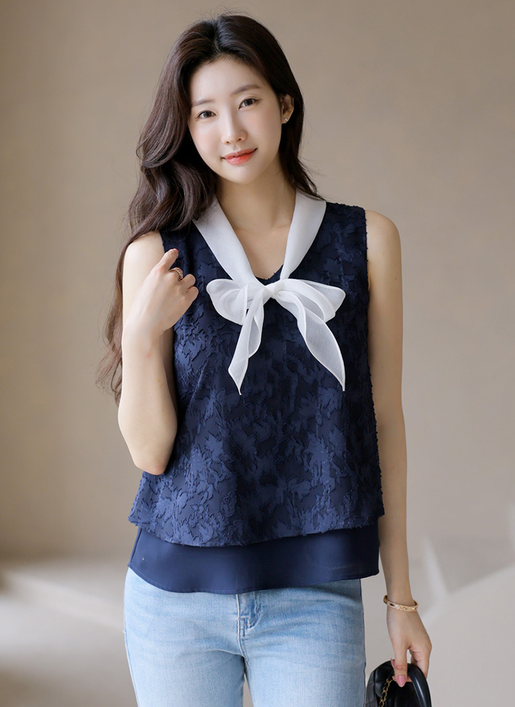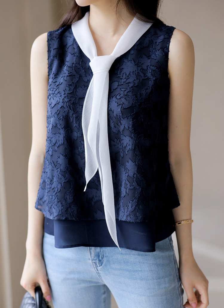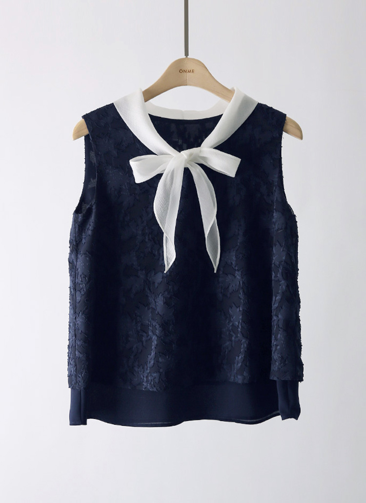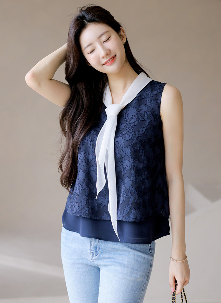 [LouisAngel] 클로이 리프 프린지 쟈가드 쉬폰 레이어드 리본 넥 나시 블라우스