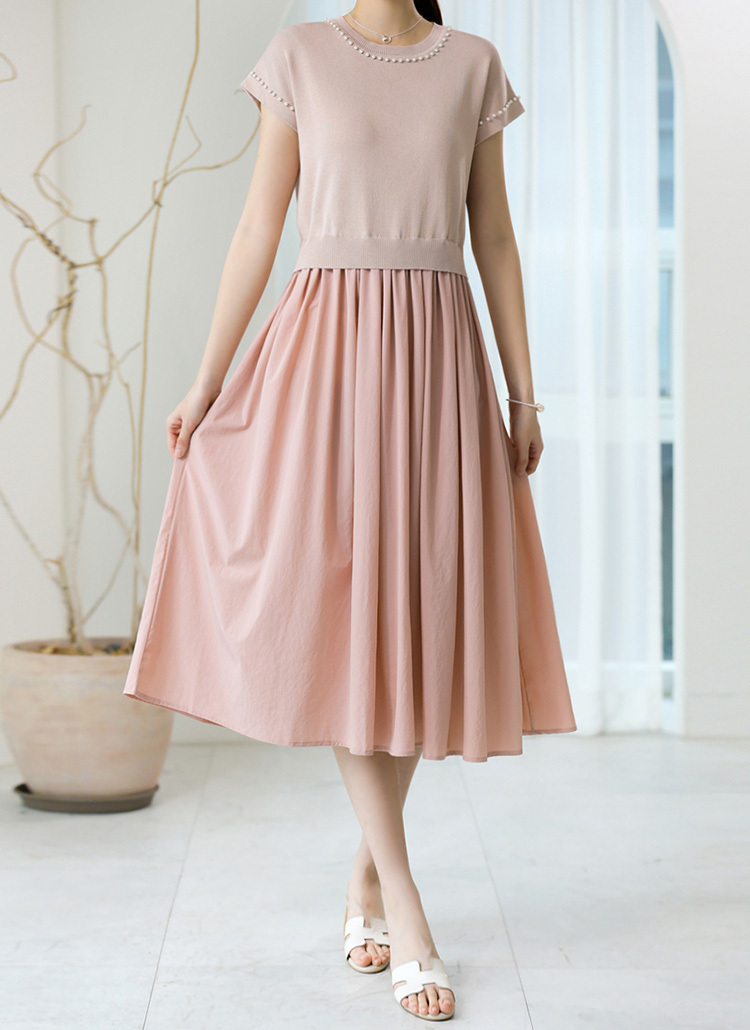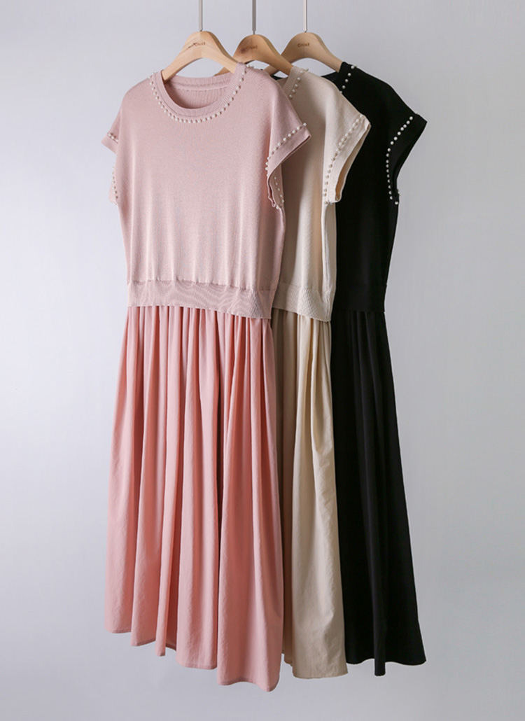 세리아 진주 라인 니트 배색 A라인 롱 플레어 원피스