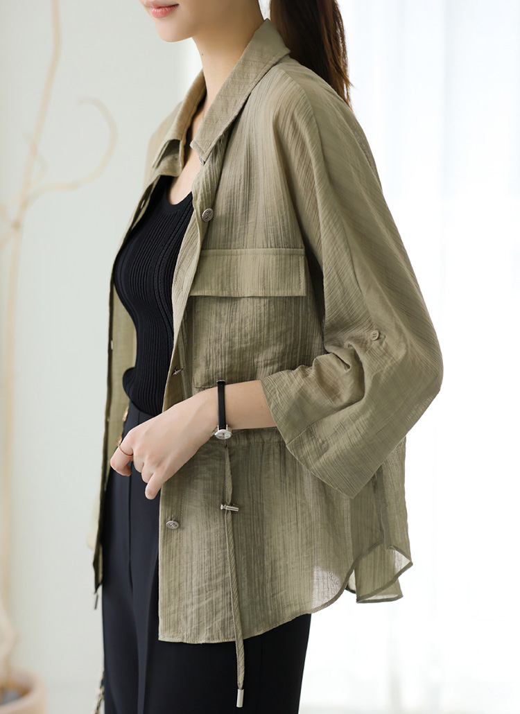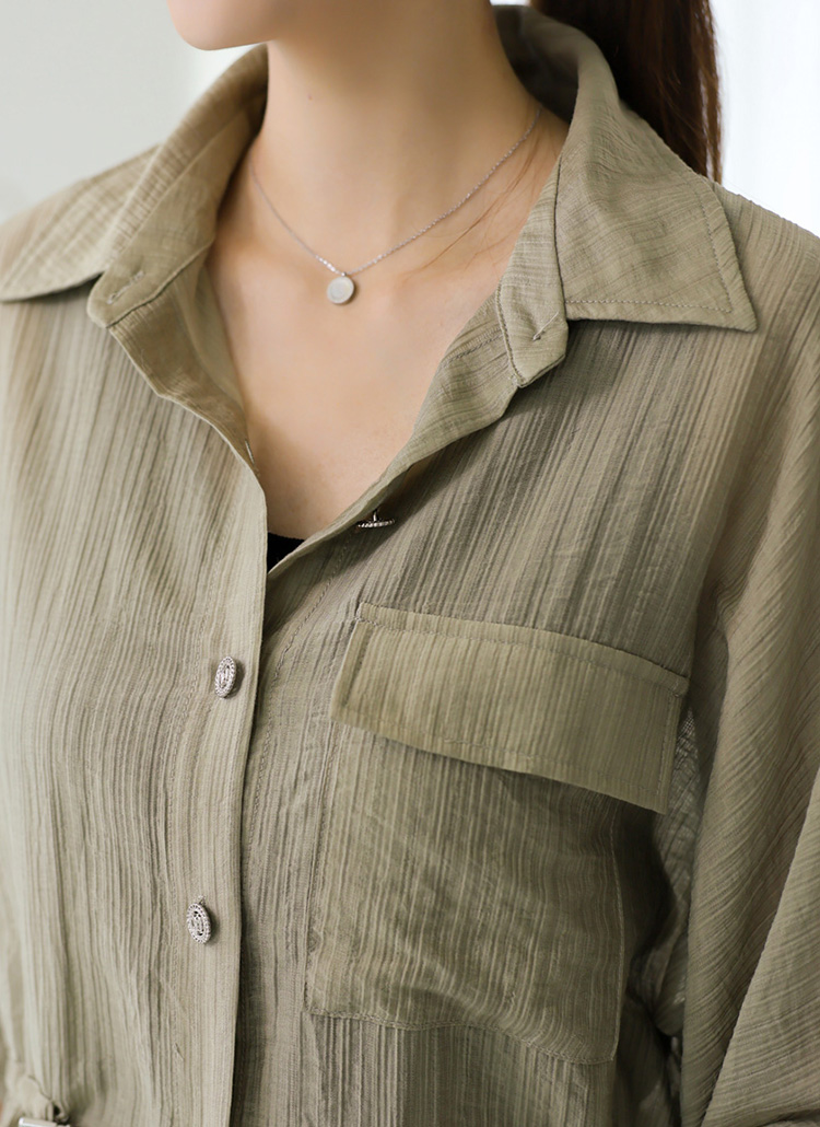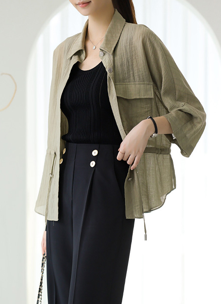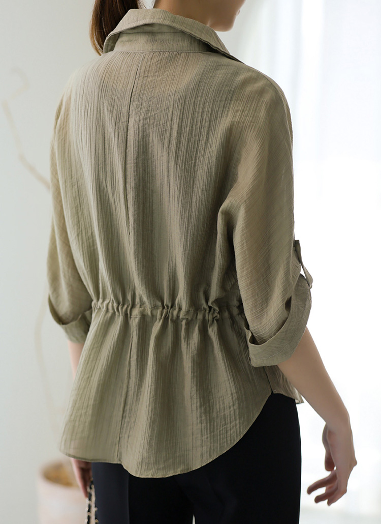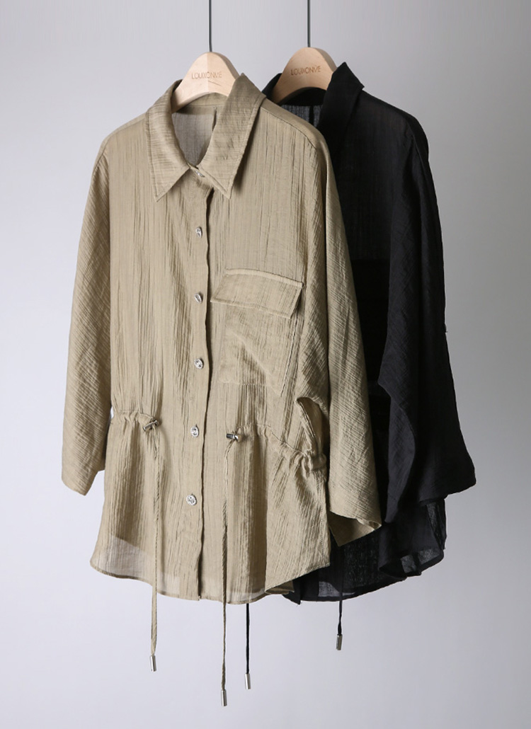 뉴트 허리 스트링 소매 롤업 시스루 텐셀 요루 소재 셔츠 블라우스