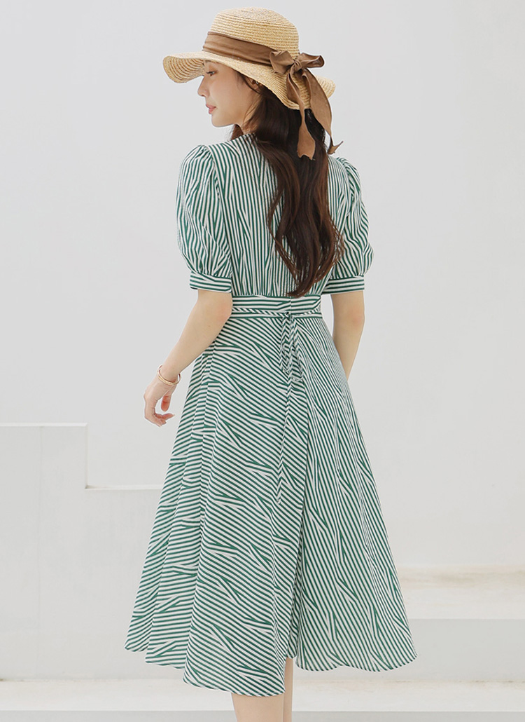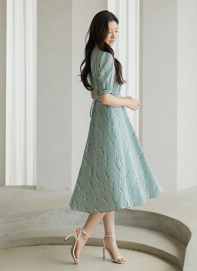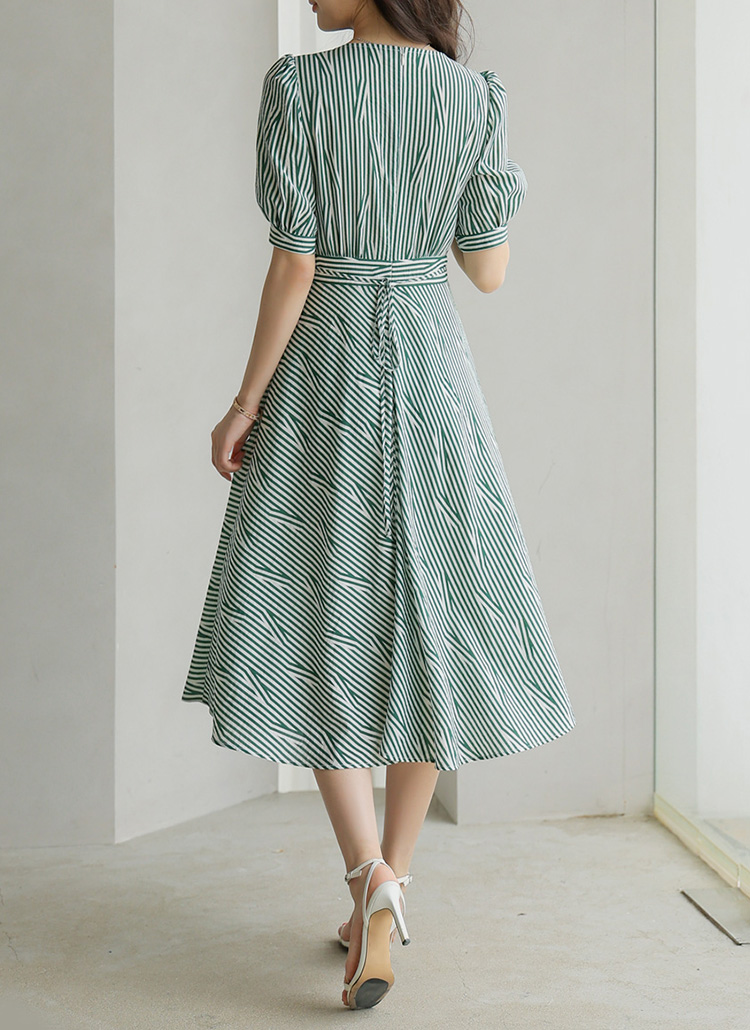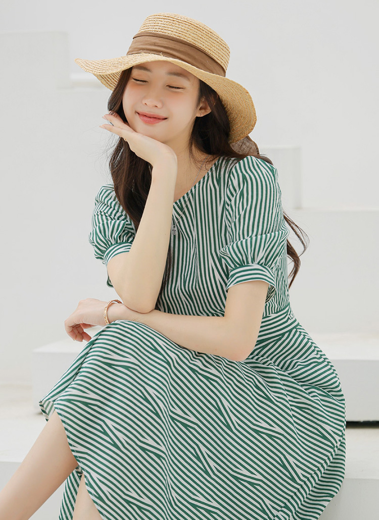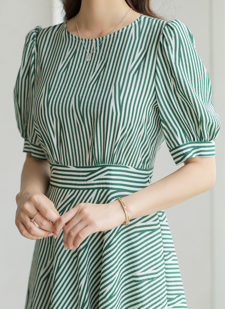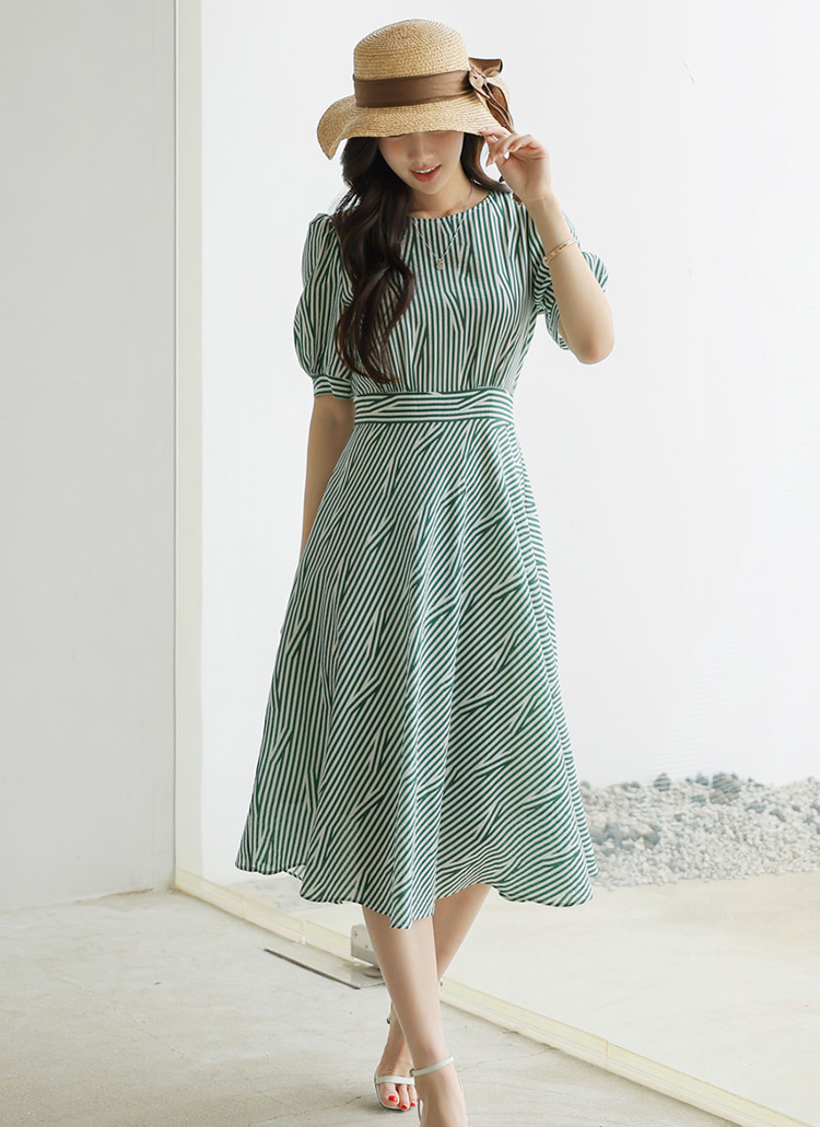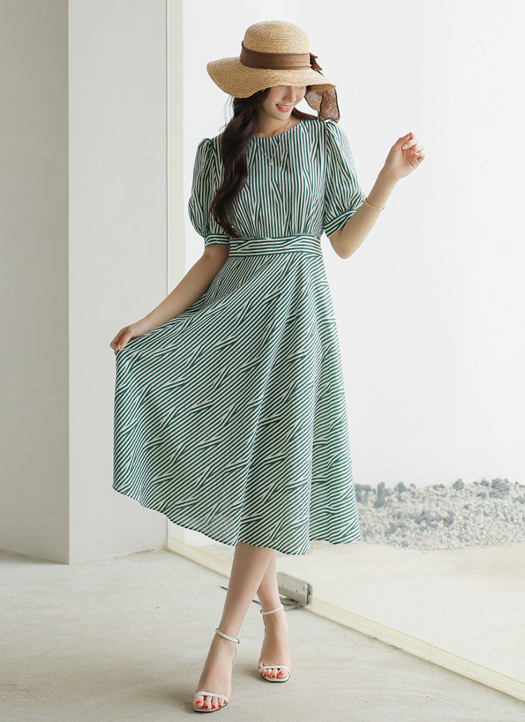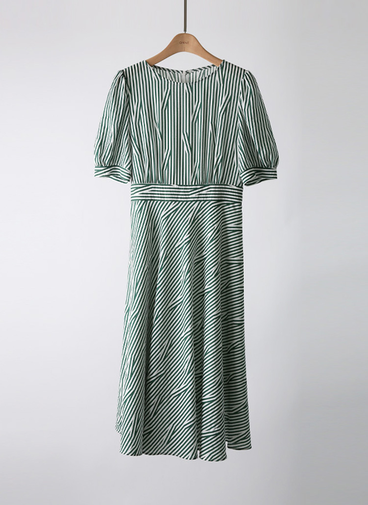[LouisAngel] 그리너리 퍼프소매 스트라이프 플레어 원피스