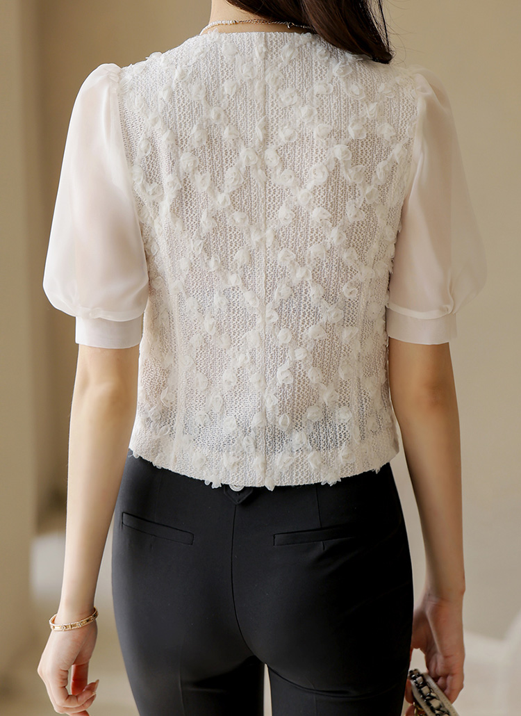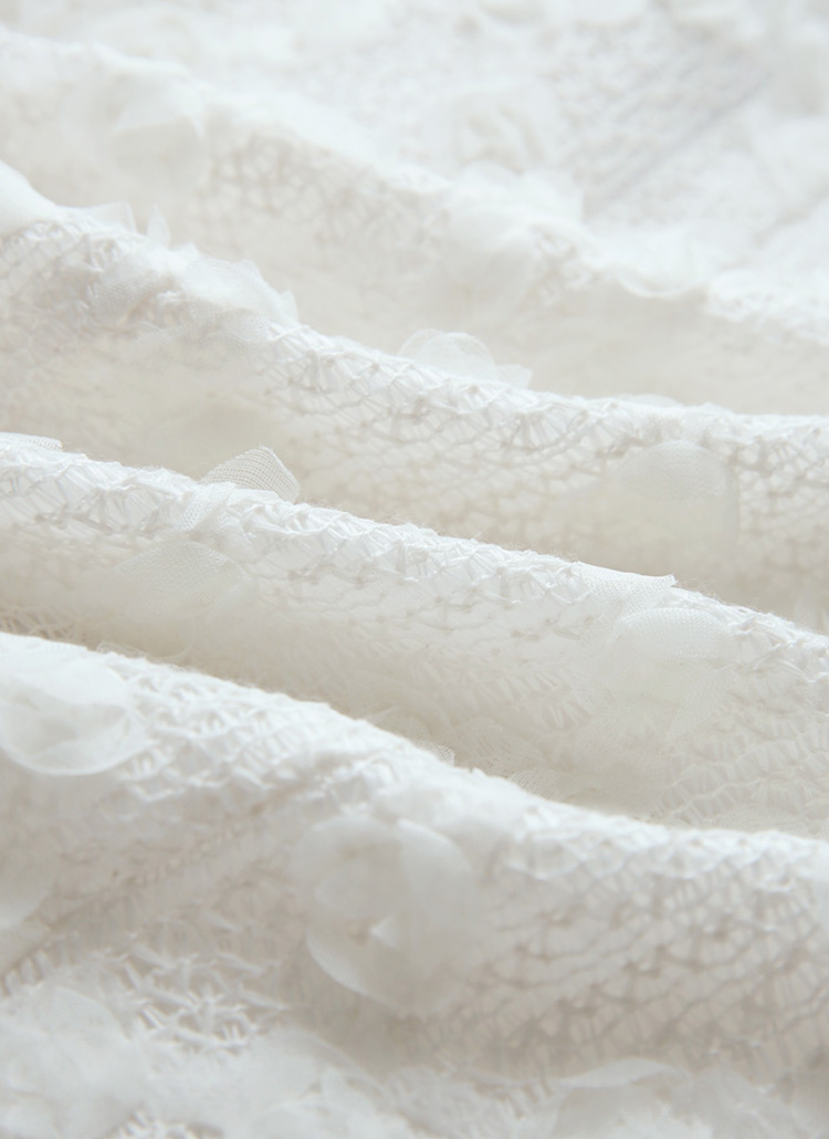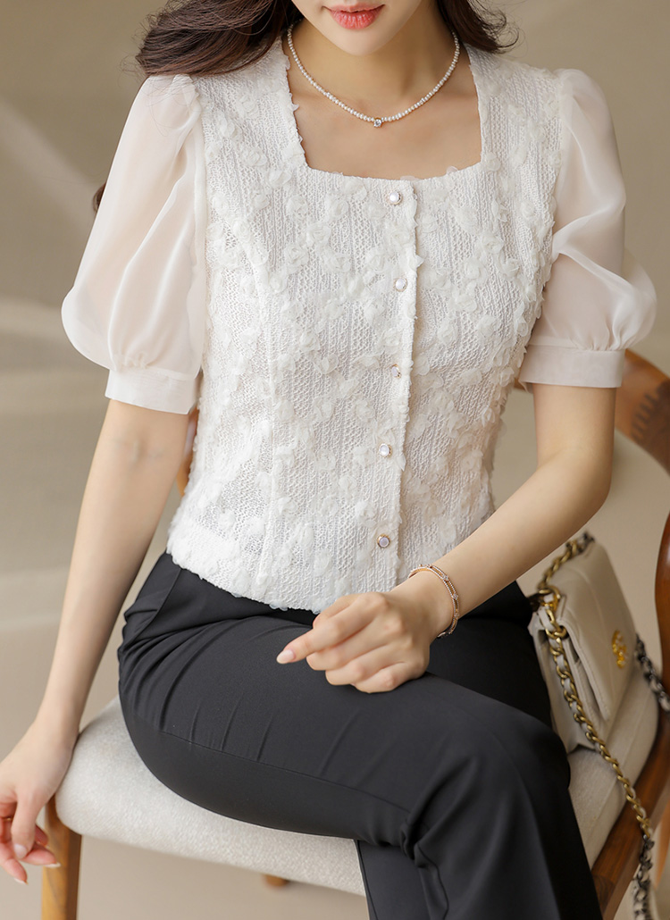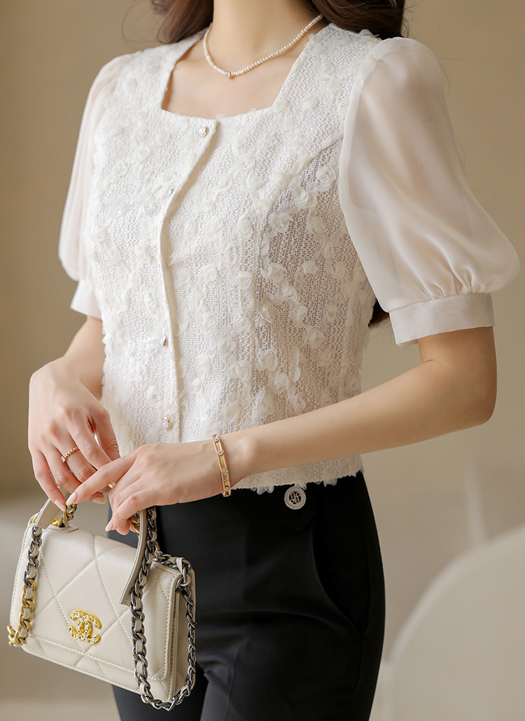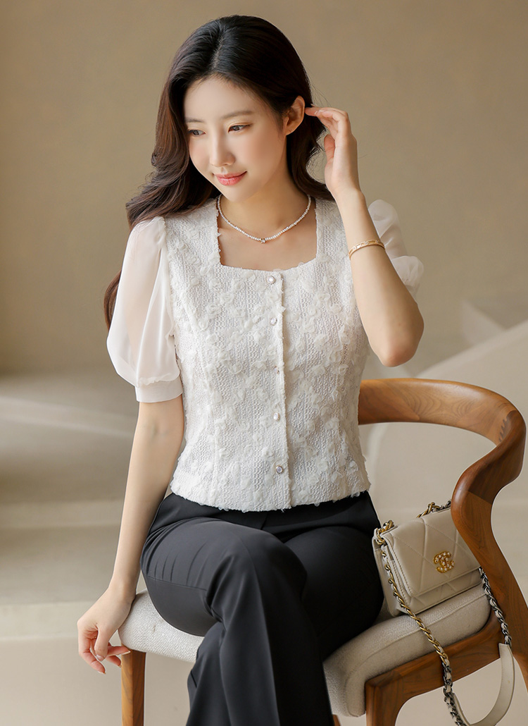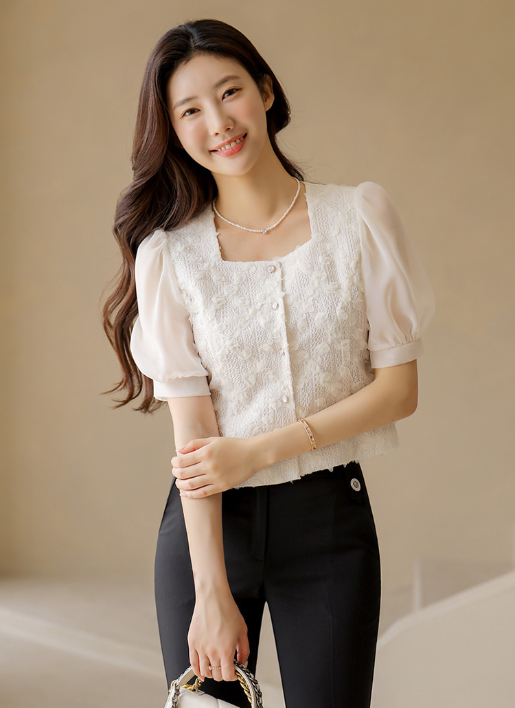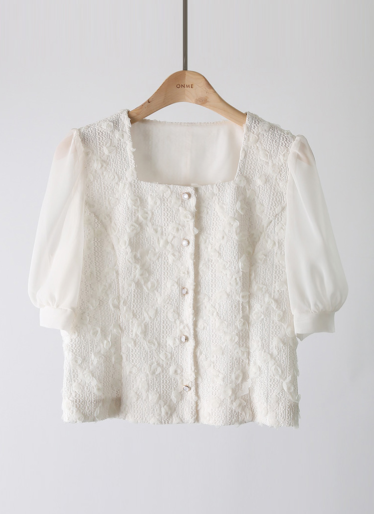 [LouisAngel] 크림 플라워 쟈가드 쉬폰 퍼프소매 스퀘어넥 블라우스 자켓