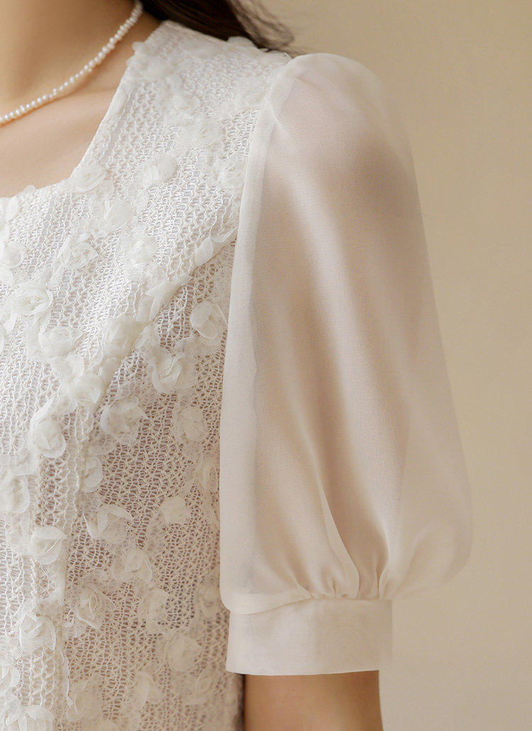 쉬폰소재의 시스루 퍼프 소매로 여리한 무드를 선사해주고