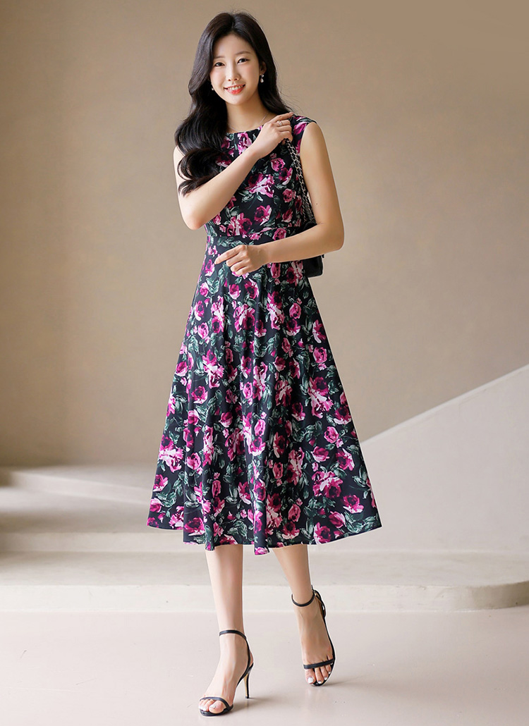 [LouisAngel] 썸머 플라워 패턴 찰랑 드롭숄더 나시 플레어 훌 원피스