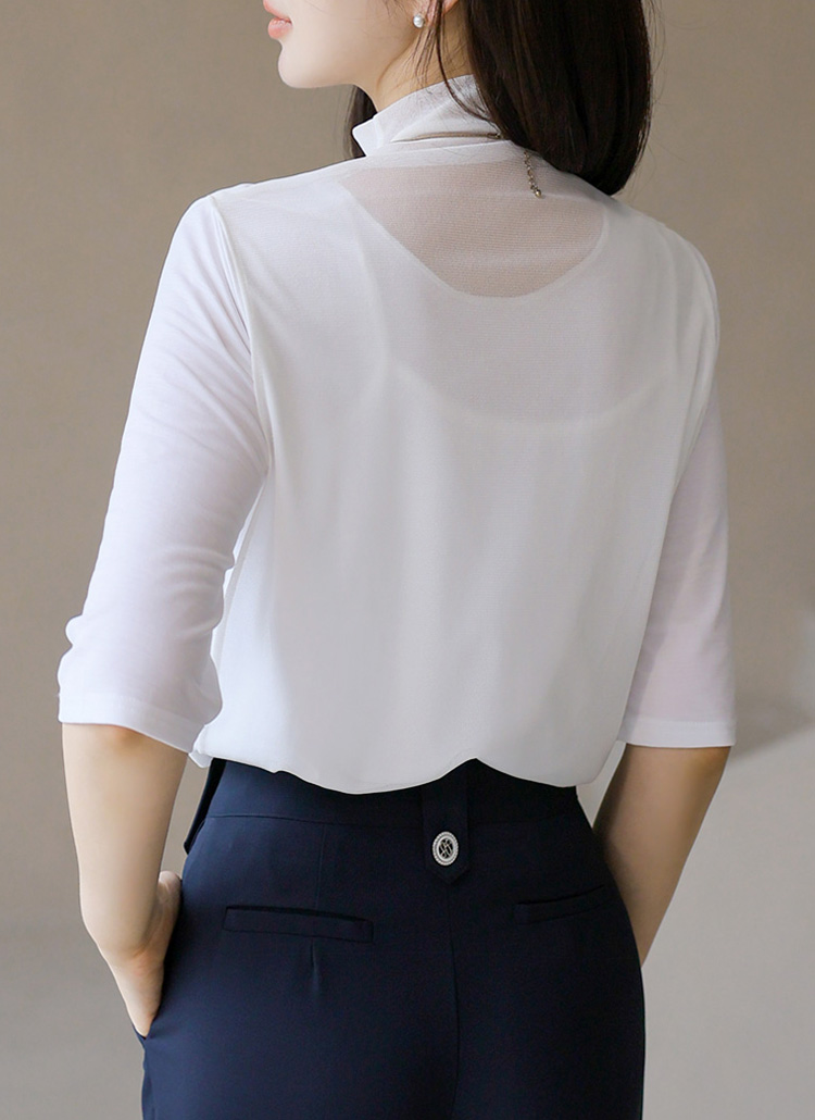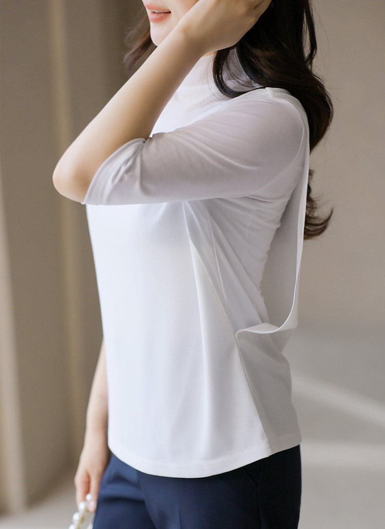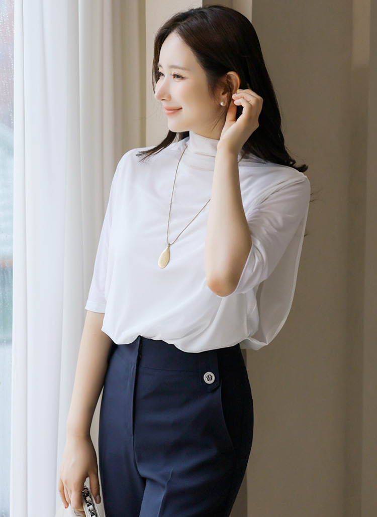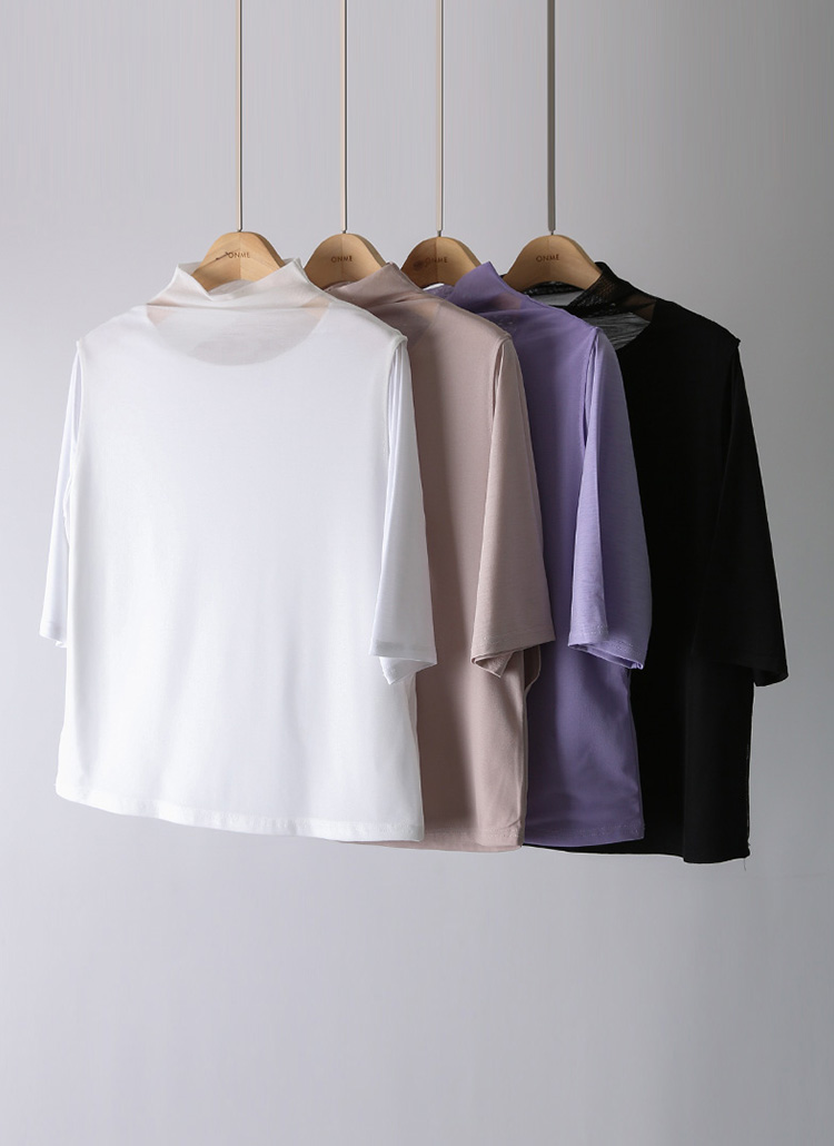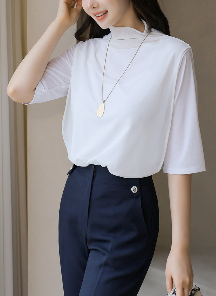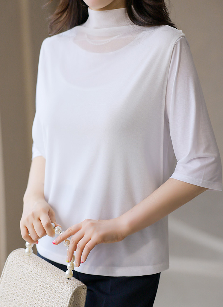 디엔트 찰랑 텐션 이중 망사 레이어드 반하이넥 5부 소매 티셔츠