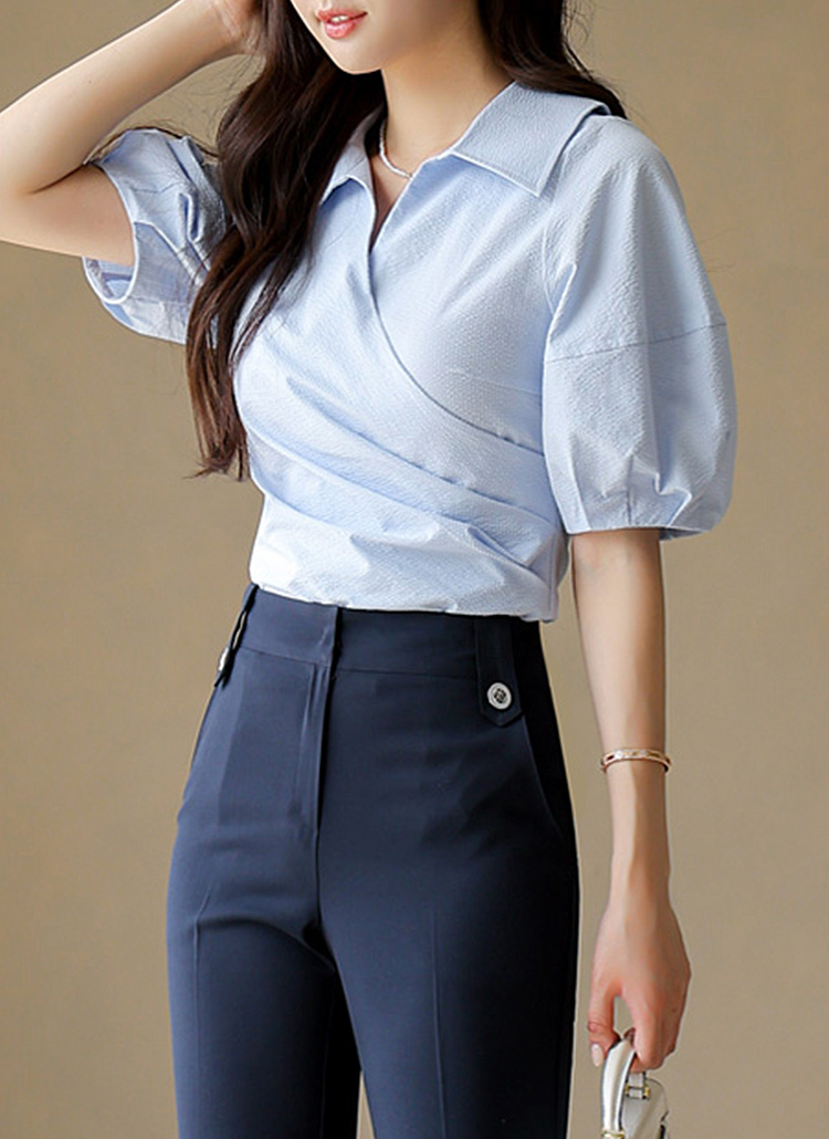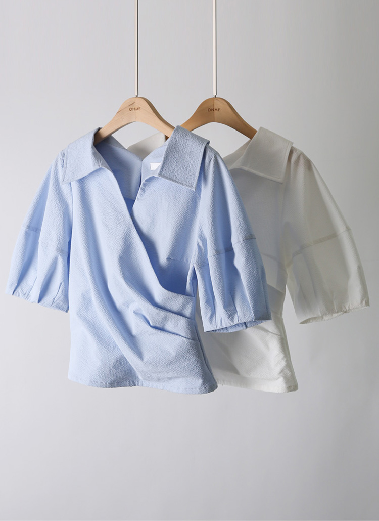 루리엘 시어서커 랩 카라 핀턱 슬림라인 퍼프소매 블라우스