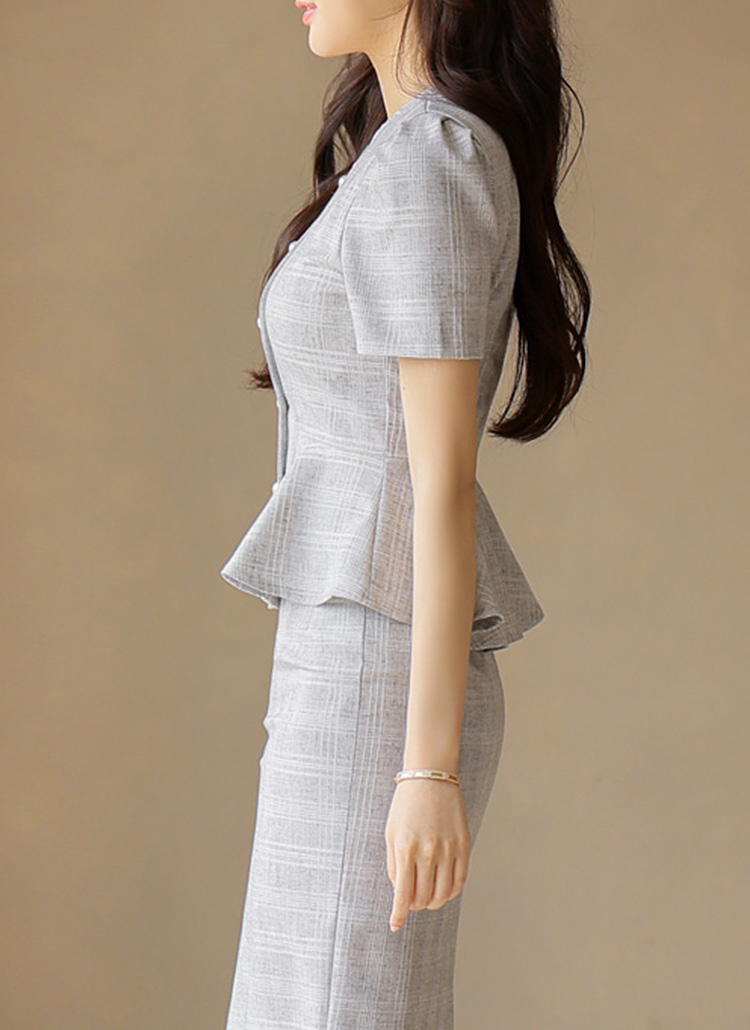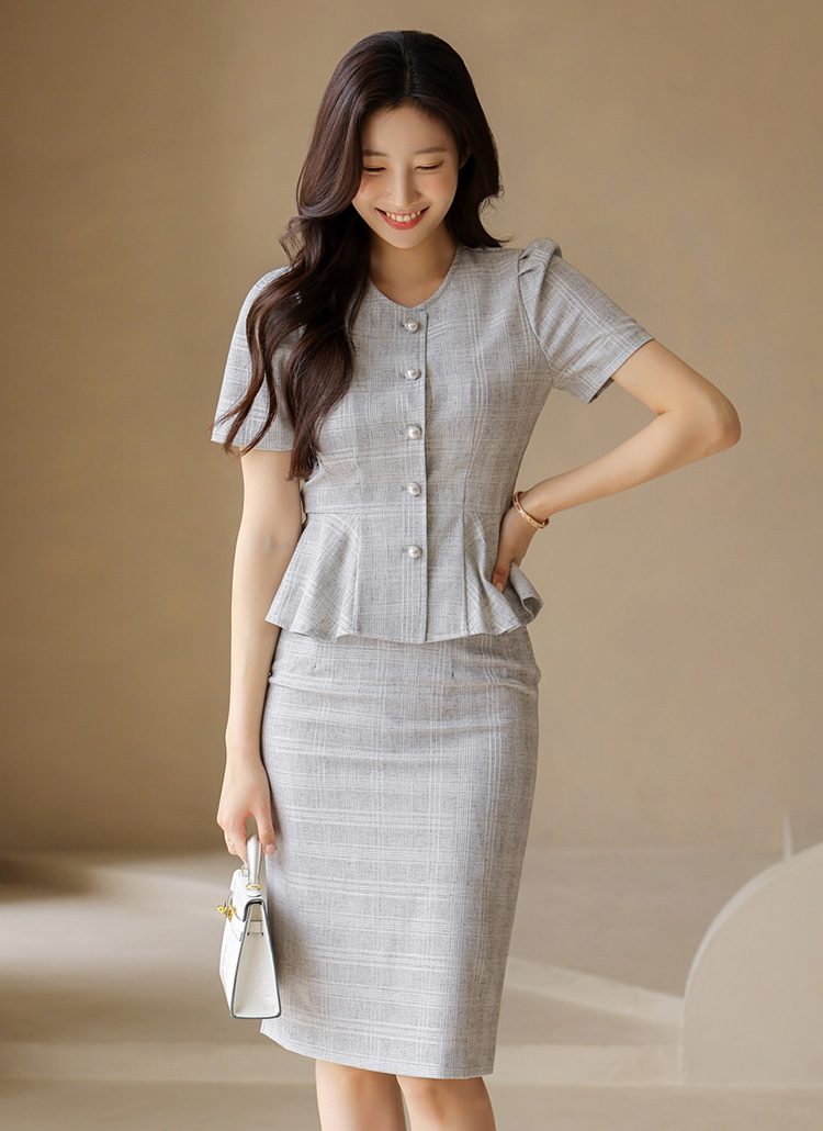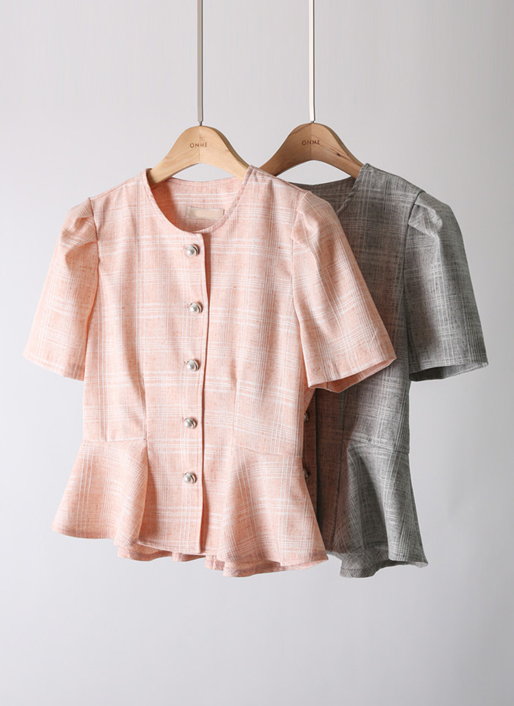 썸머 체크 페플럼 페미닌라인 진주버튼 퍼프소매 자켓