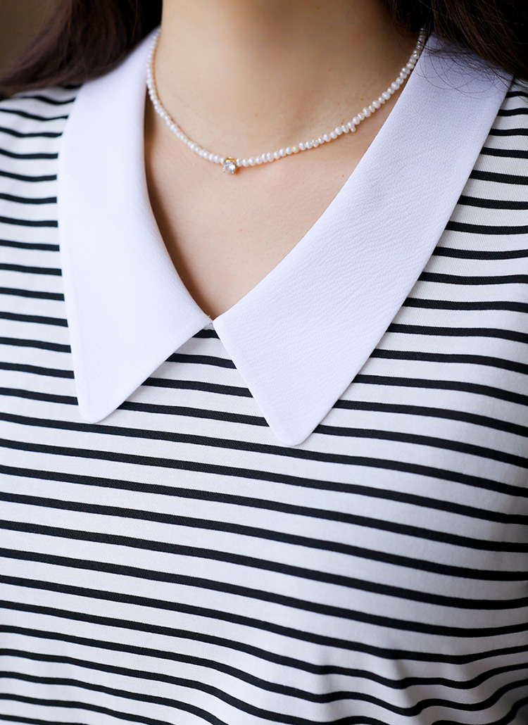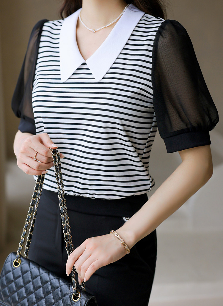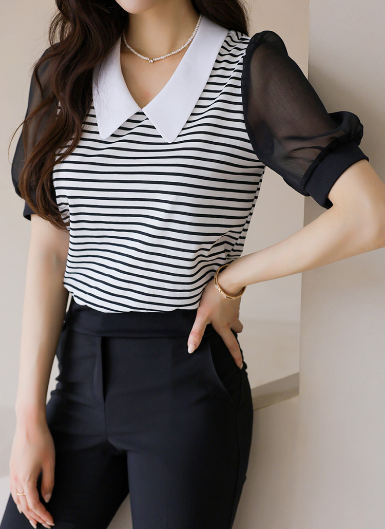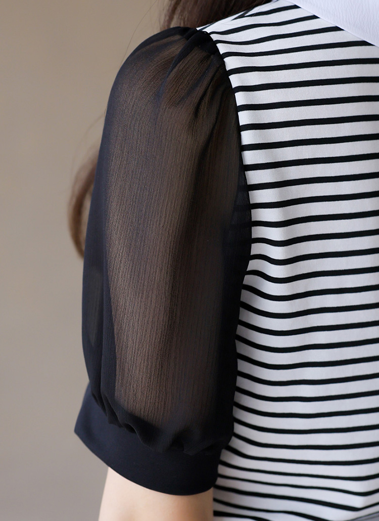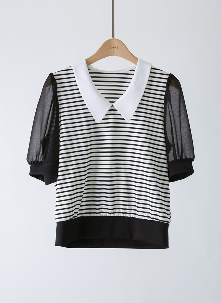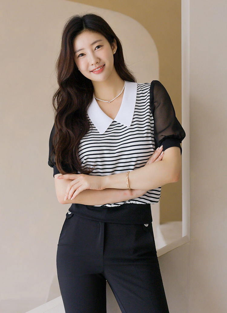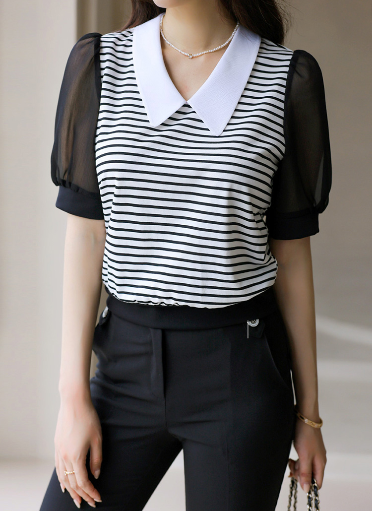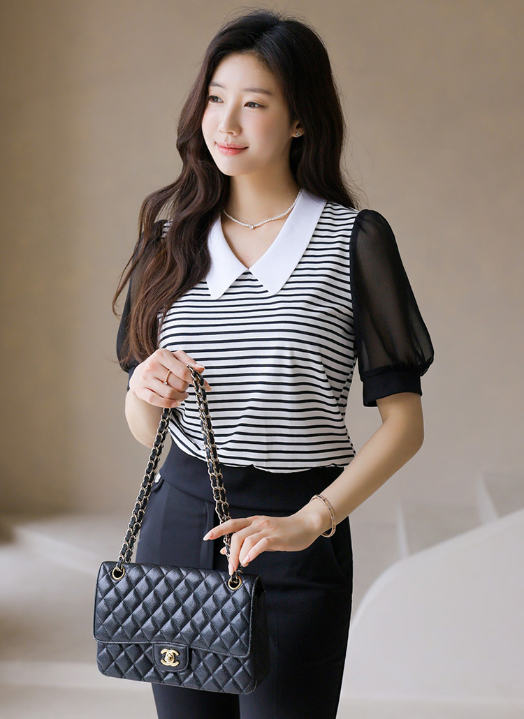 [LouisAngel] 뮤레아 쉬폰 퍼프소매 카라 스트라이프 블라우스 티
