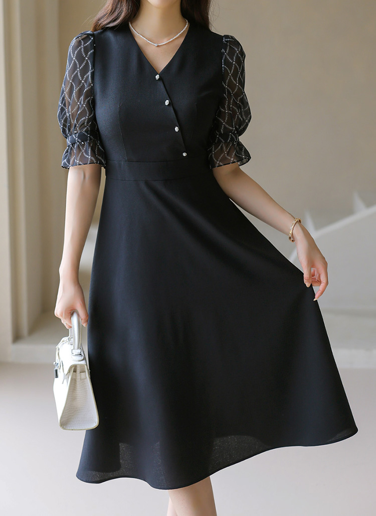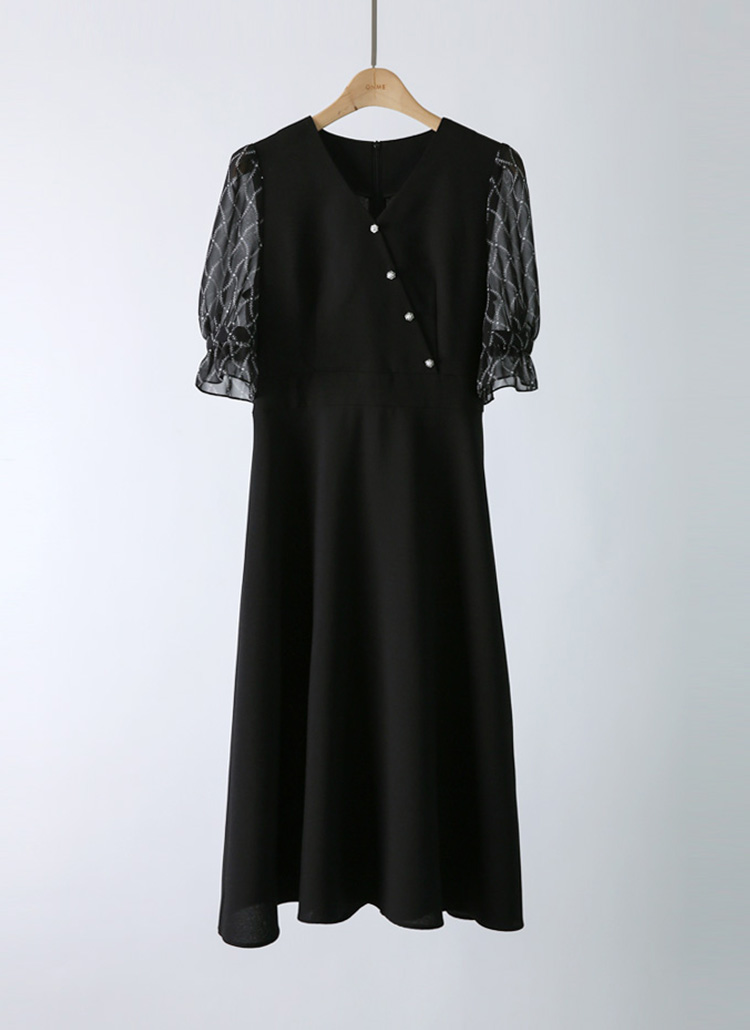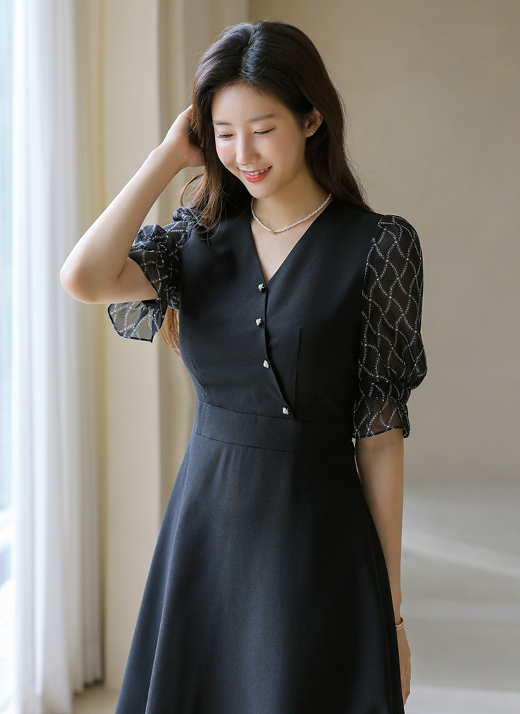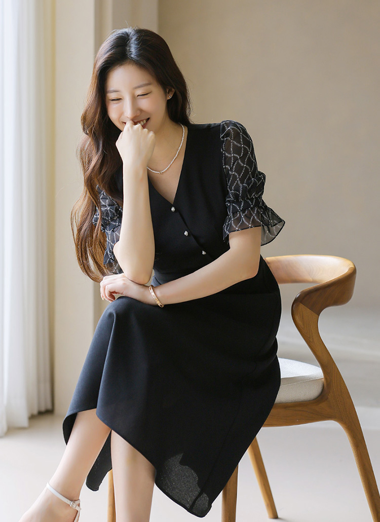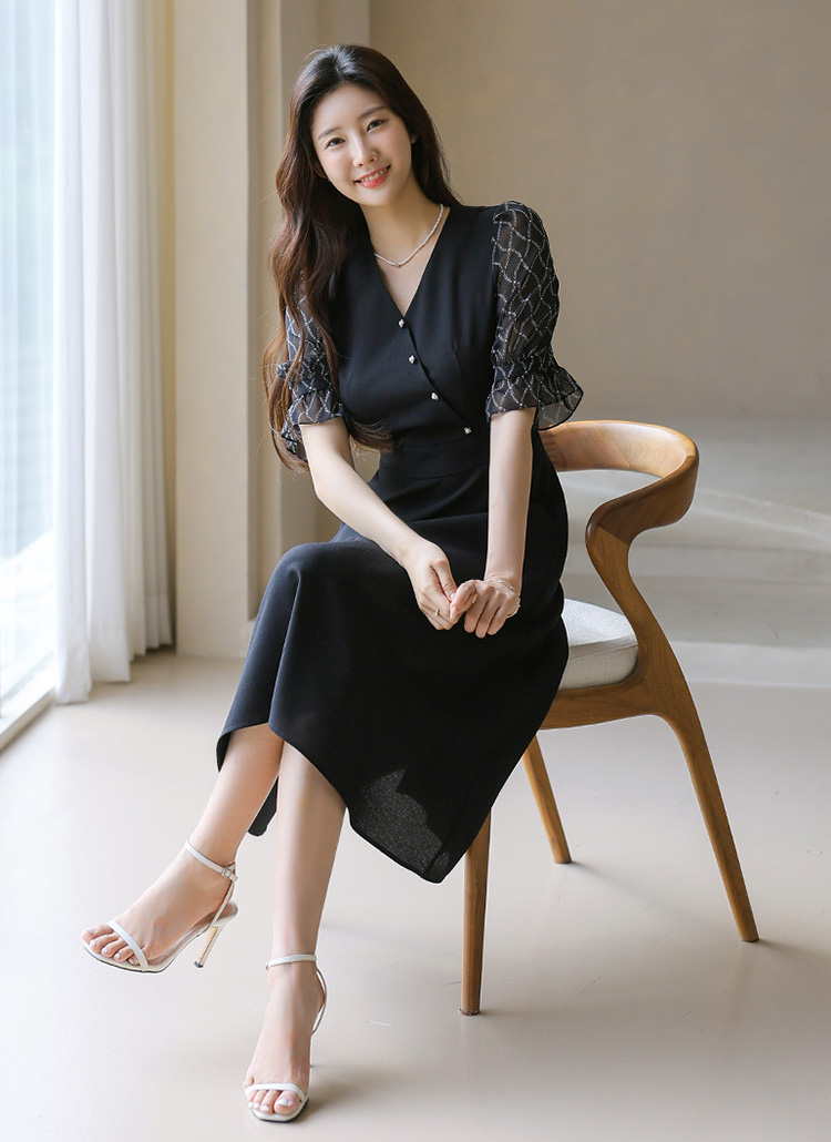 [LouisAngel] 쉐인 체인 쉬폰 퍼프소매 랩 버튼 플레어 원피스