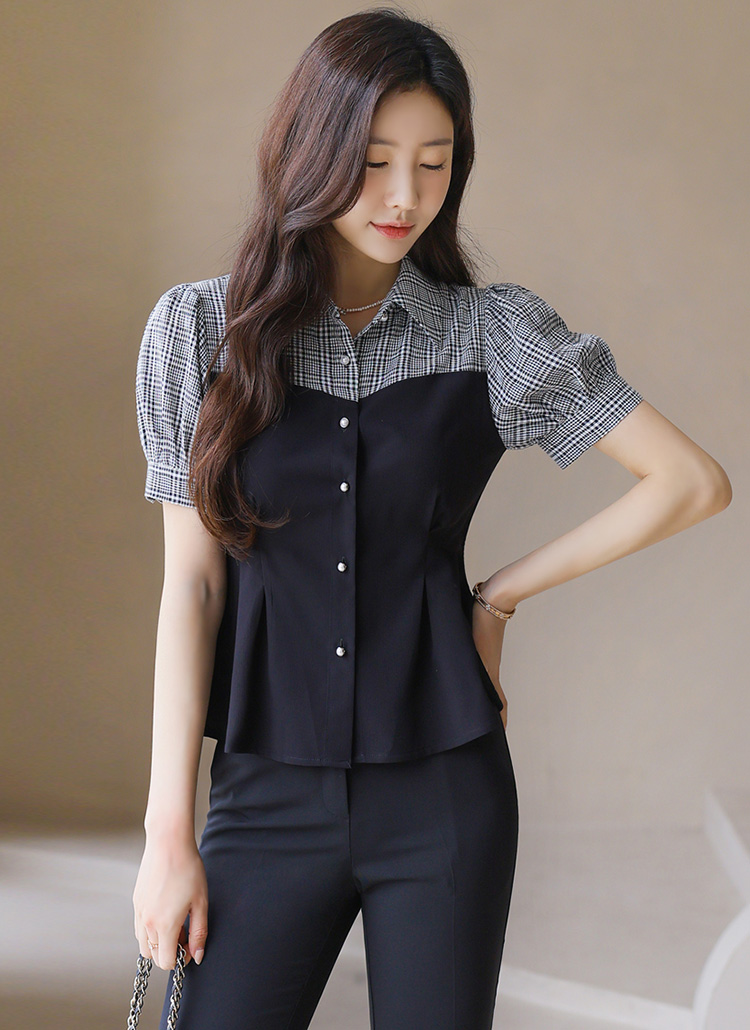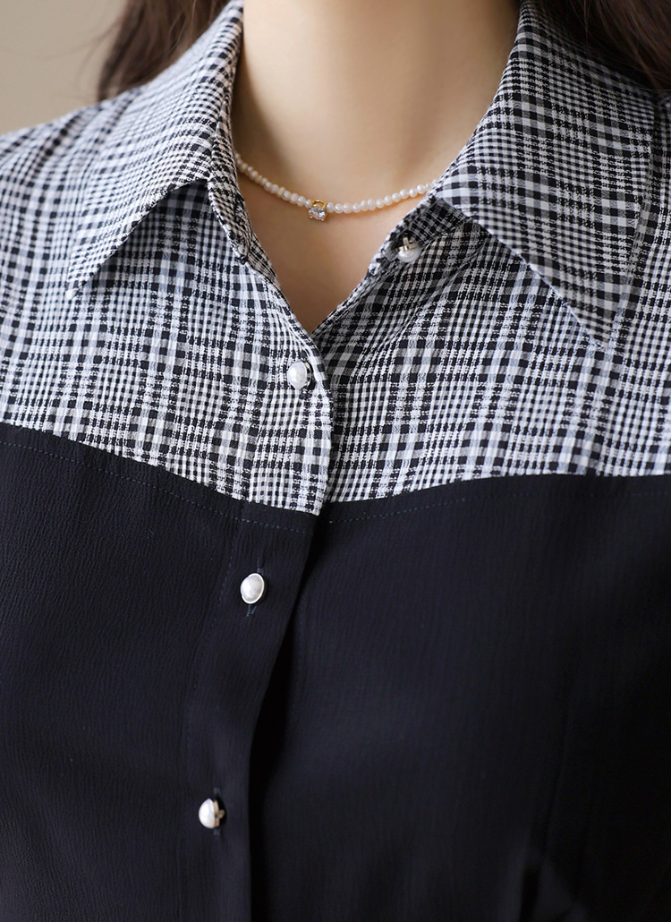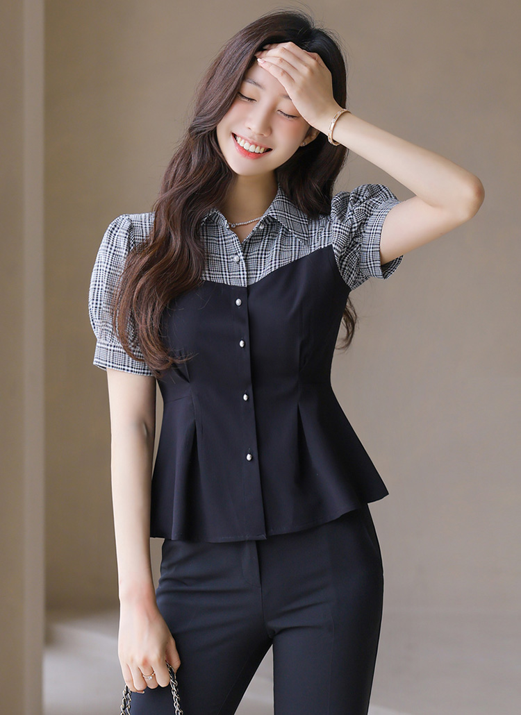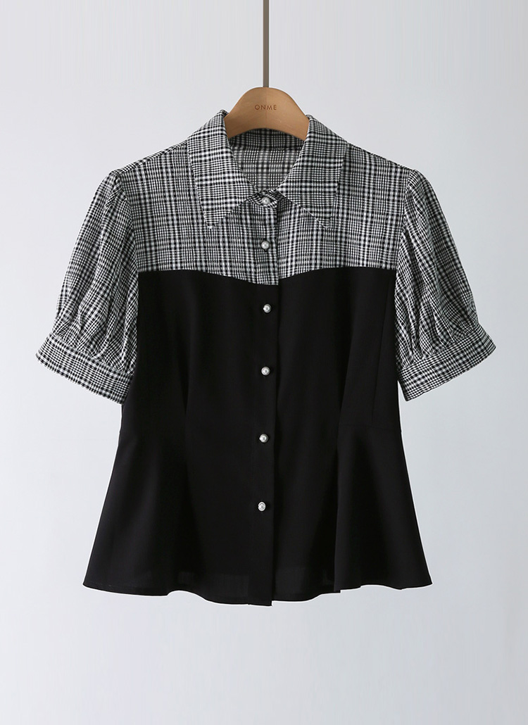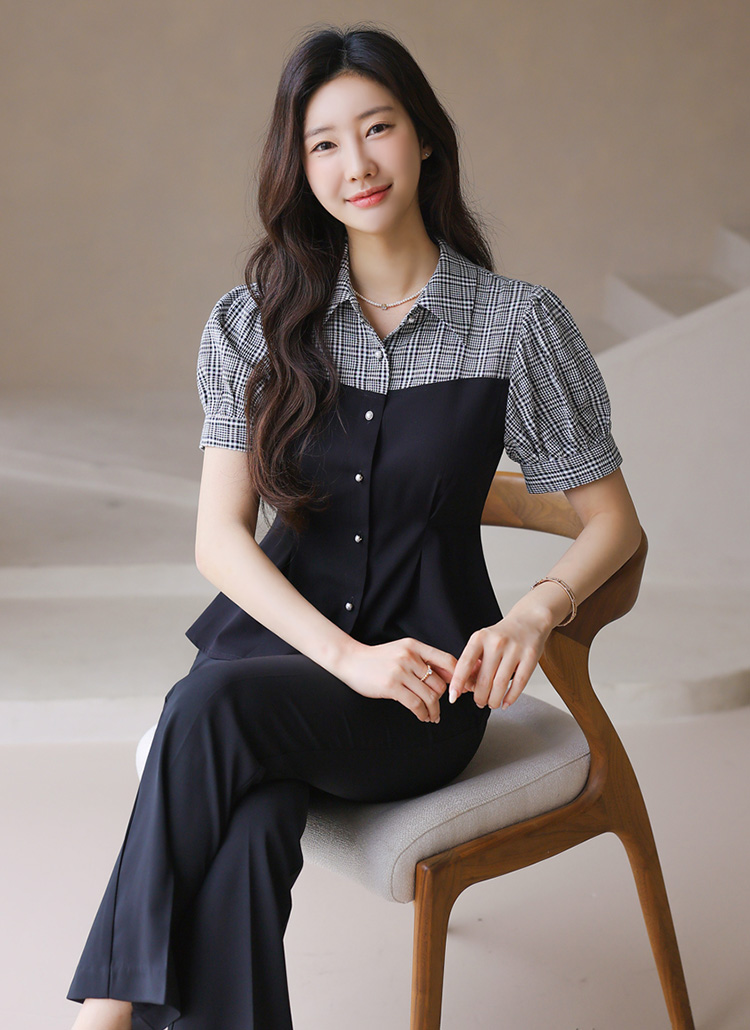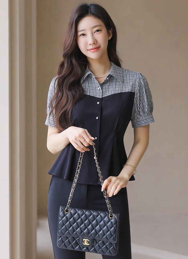 [LouisAngel] 델로아 체크배색 텐션 핀턱 페플럼 블라우스
