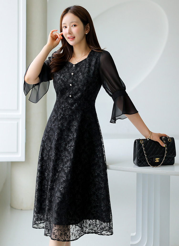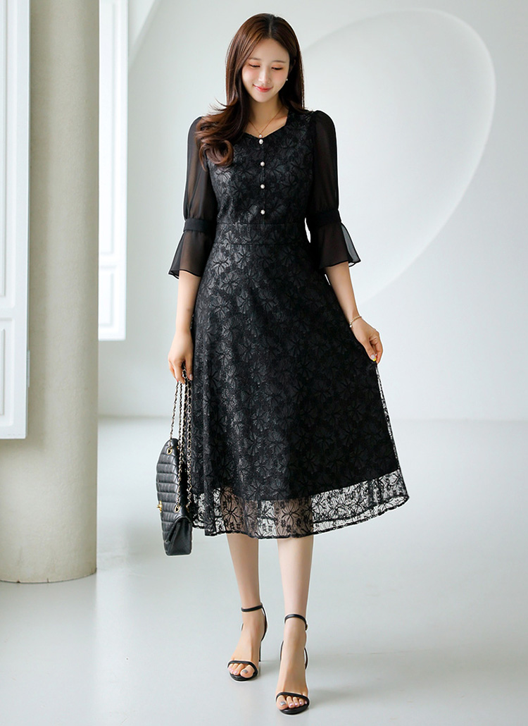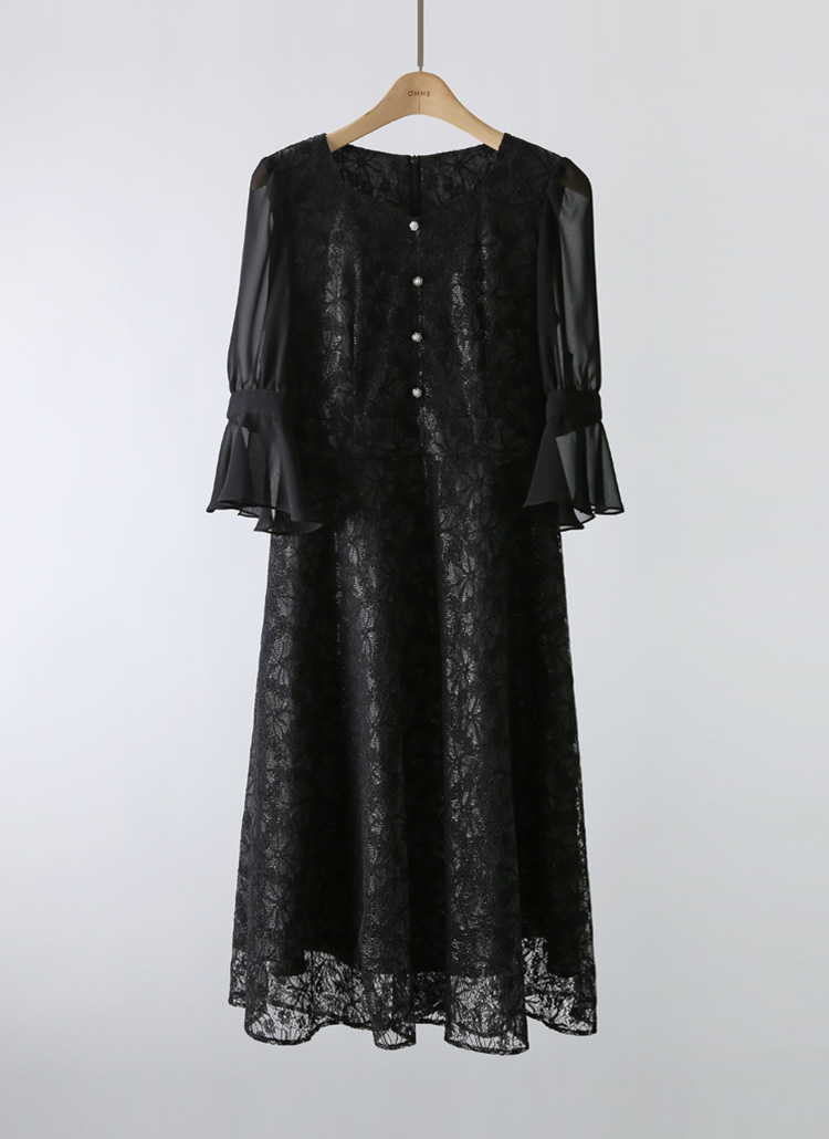 [LouisAngel] 클로렐 샤인 펄 믹스 쉬폰 벨 소매 여신무드 A라인 플레어 롱 원피스