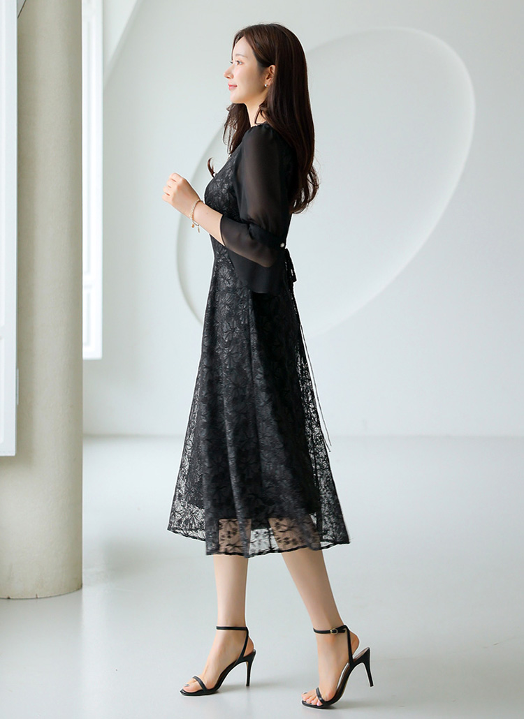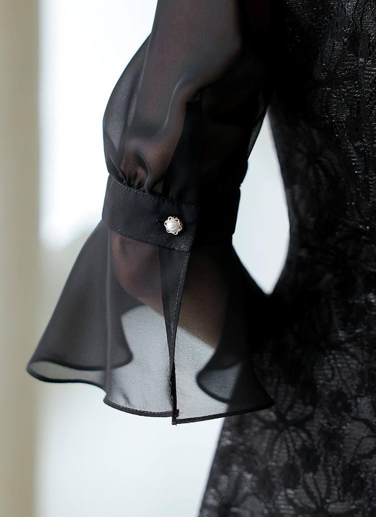 쉬폰 벨 소매 배색 디자인으로 손짓 하나하나까지 더 우아하게 표현되며