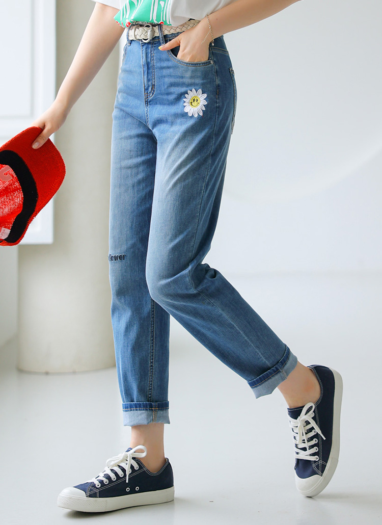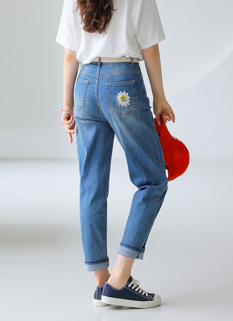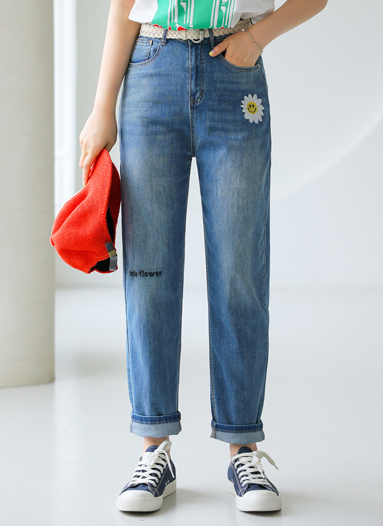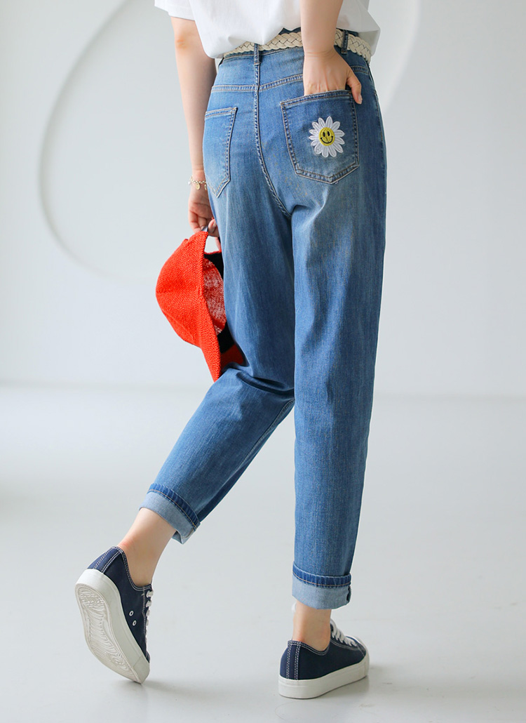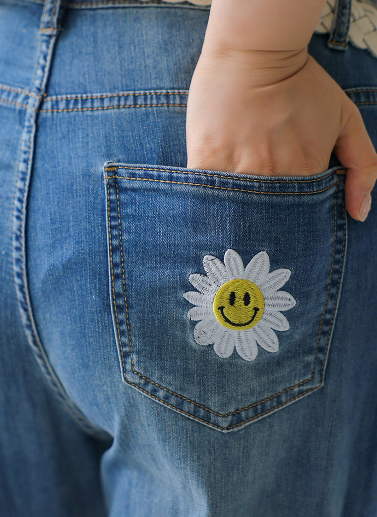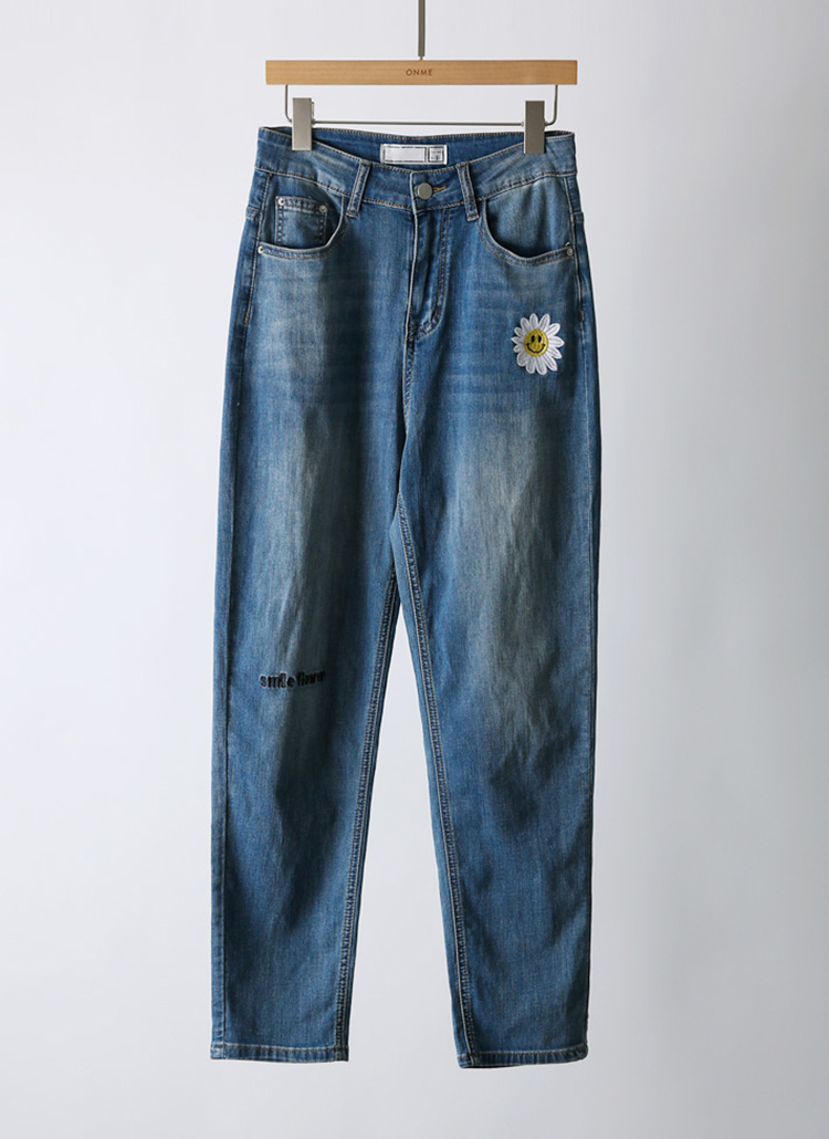 선샤인 스마일 플라워 자수 디테일 세미 배기 데님 팬츠
