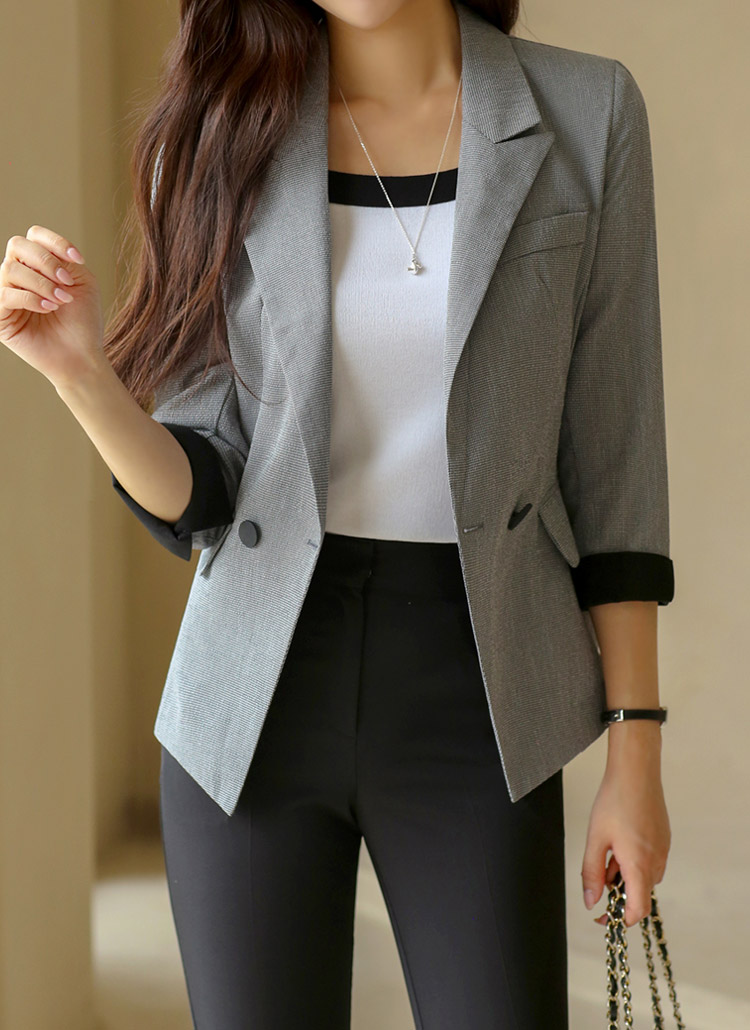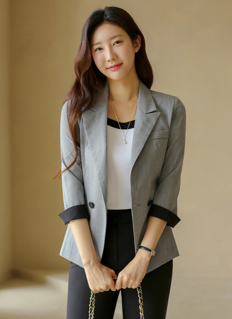 타이니 사각 패턴 배색 롤업 7부 소매 페미닌 슬림라인 자켓