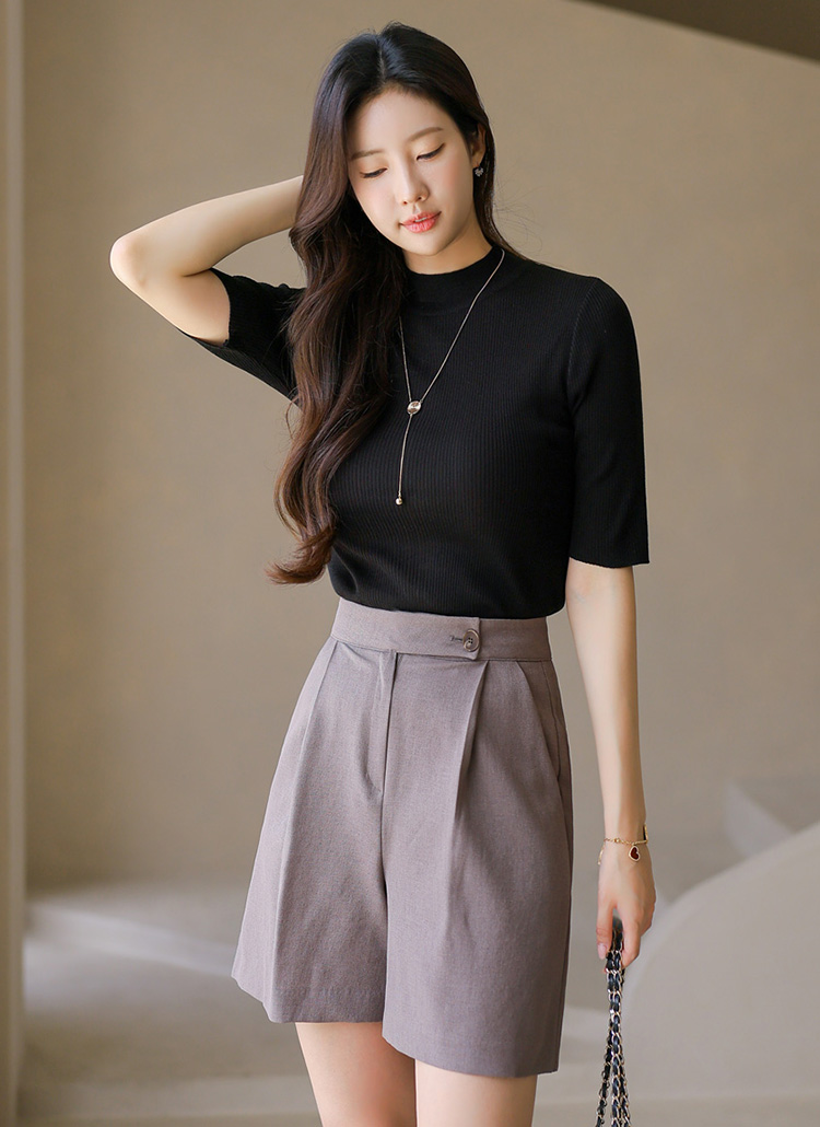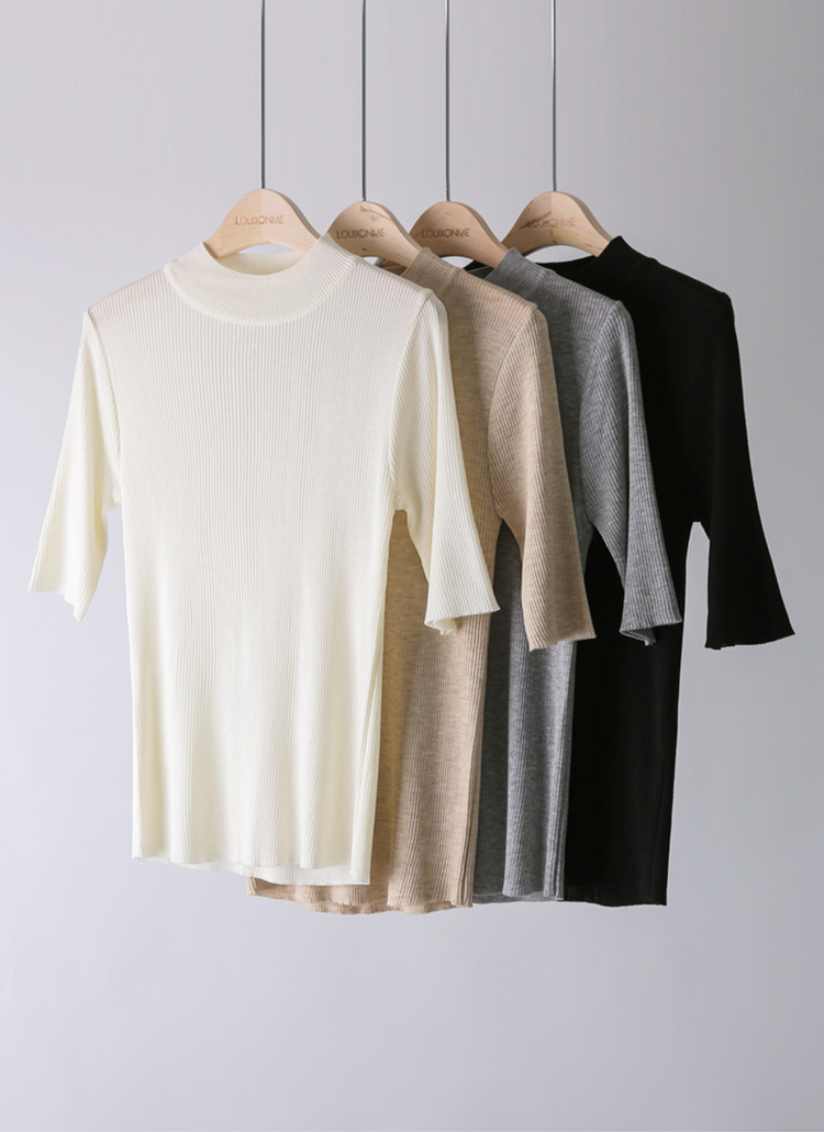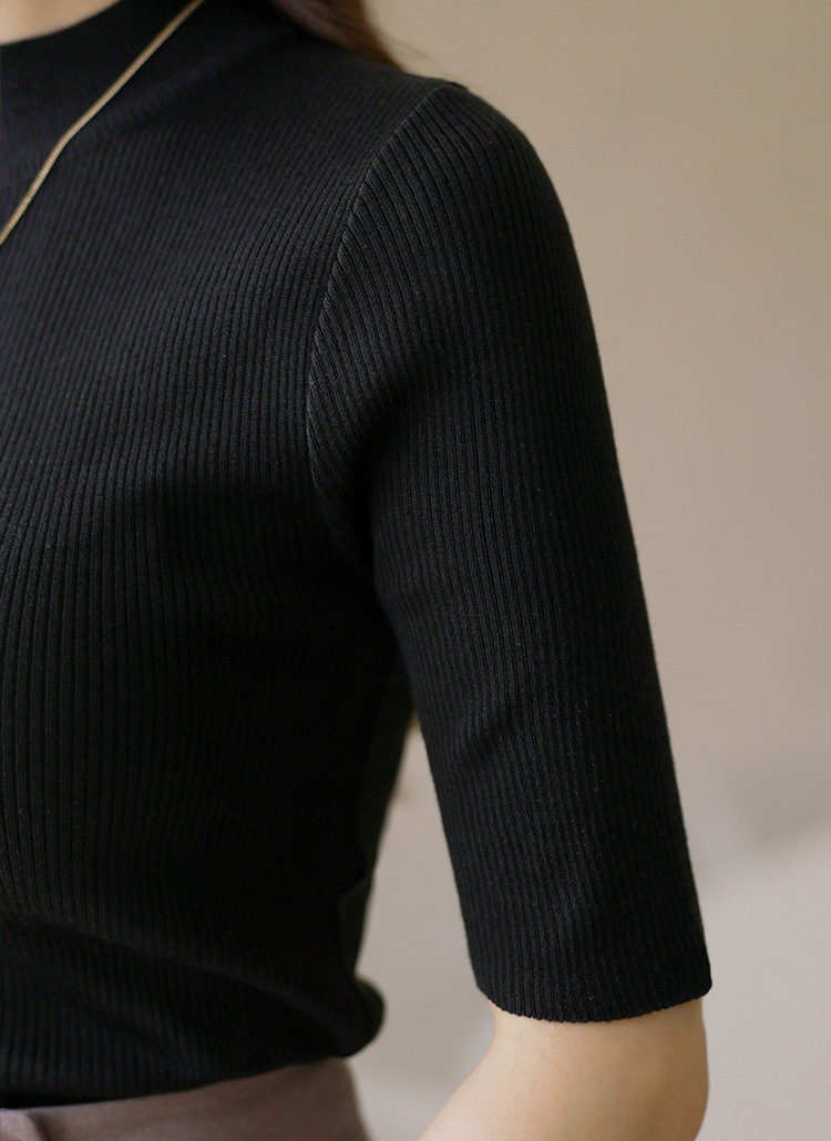 이엘드 심플 베이직 반하이넥 5부소매 슬림 골지 니트