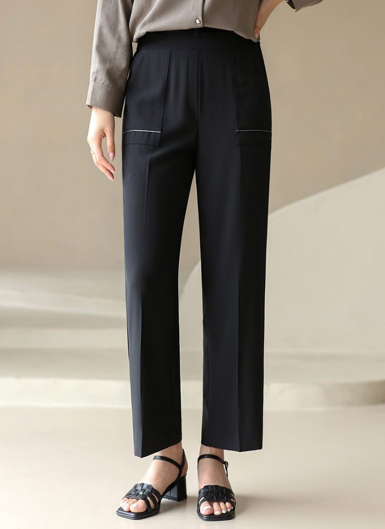 퓨리엔 배색 라인 포켓 옆트임 뒷밴딩 일자와이드 슬랙스