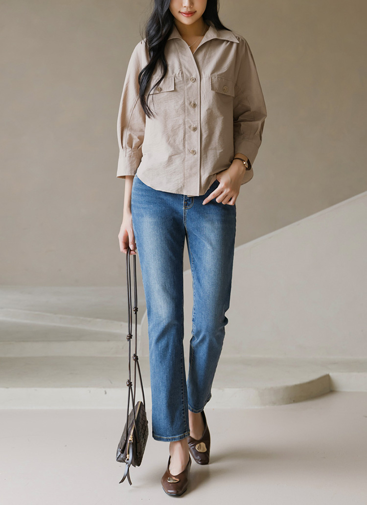 퍼프소매 실루엣의 7부 소매가 여성스러운 분위기를 연출해주어요