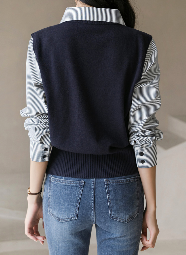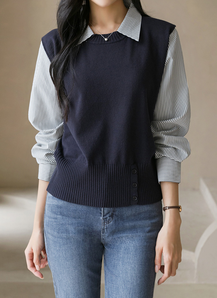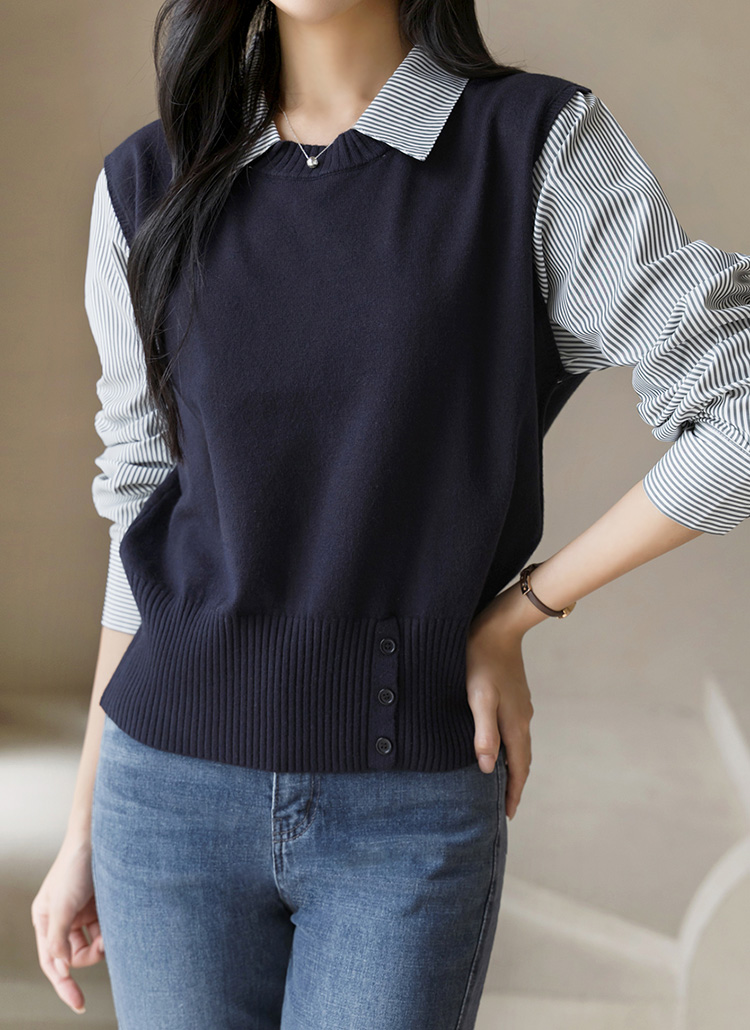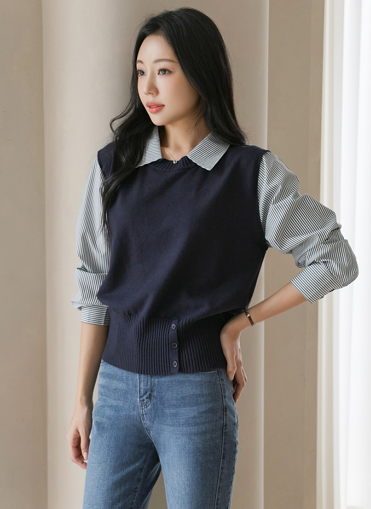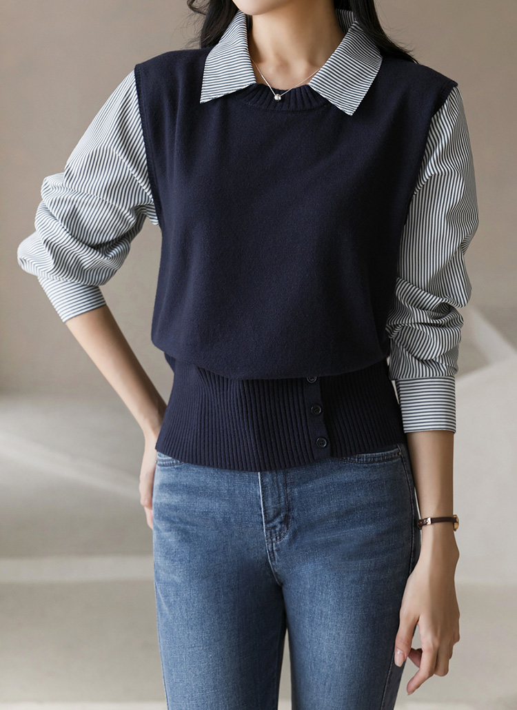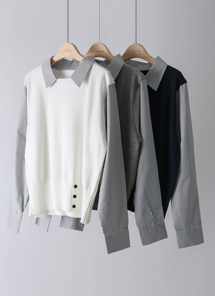 [Theonme] 퓨엘 스트라이프 셔츠 레이어드 버튼 시보리 니트