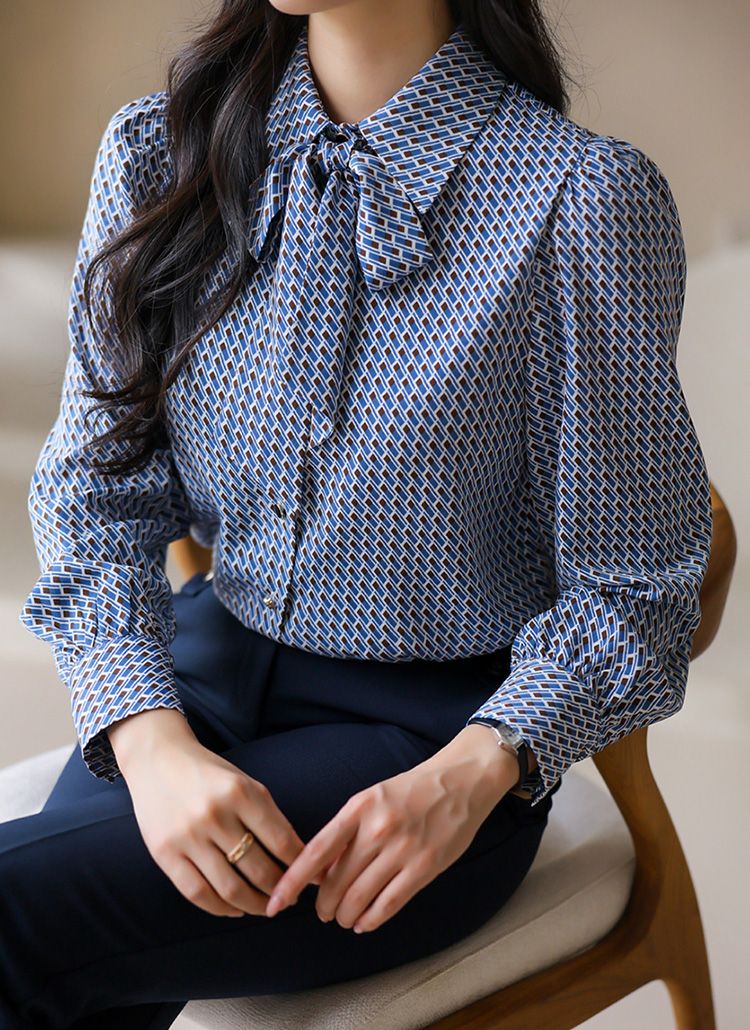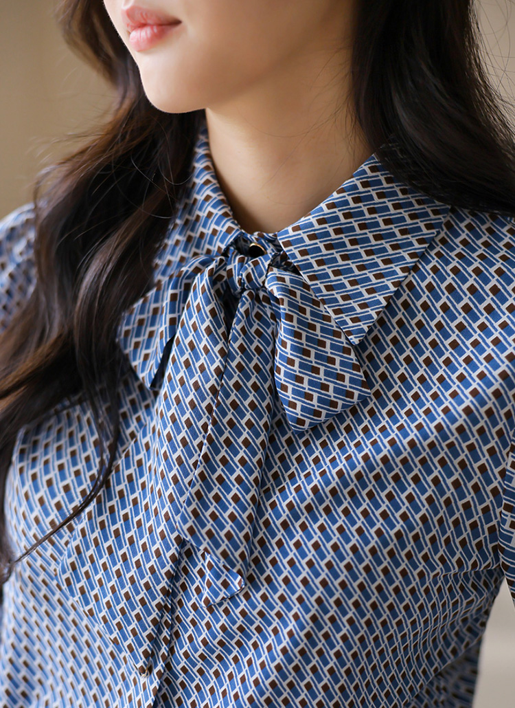 [LouisAngel] 그리드 컬러 매치 기하학 패턴 리본 타이SET 카라 블라우스