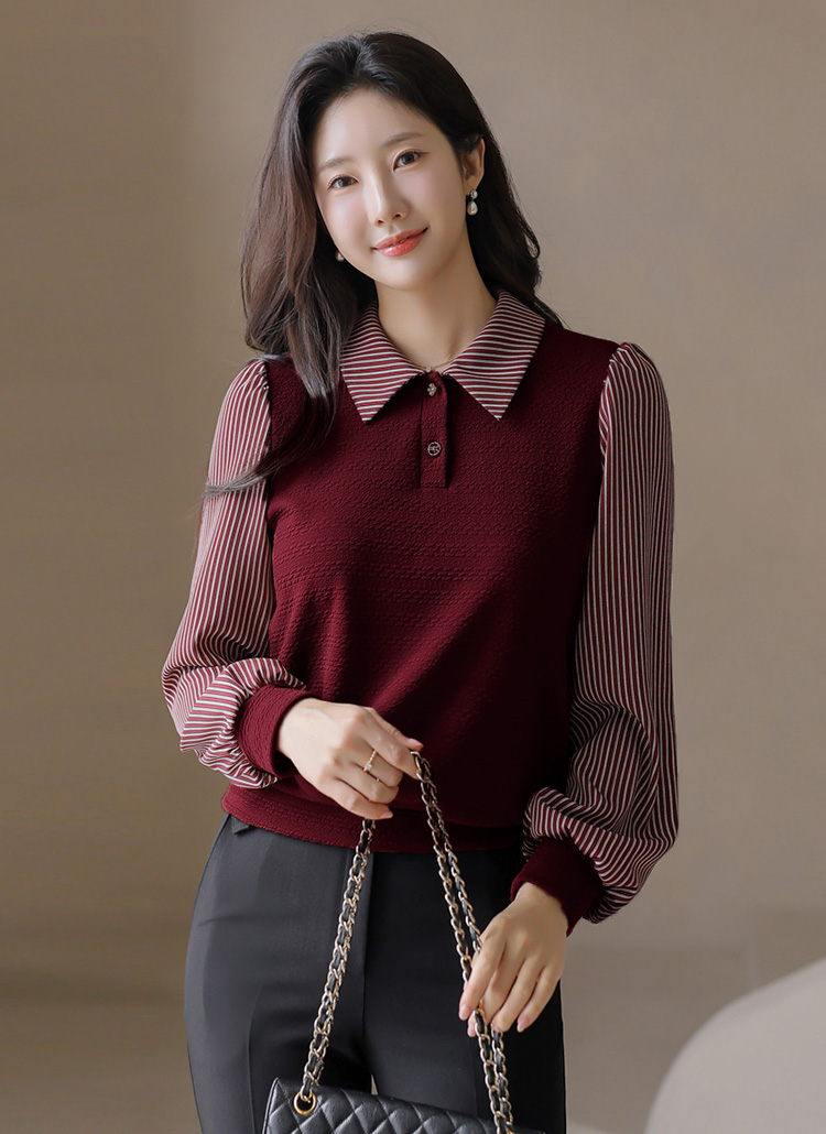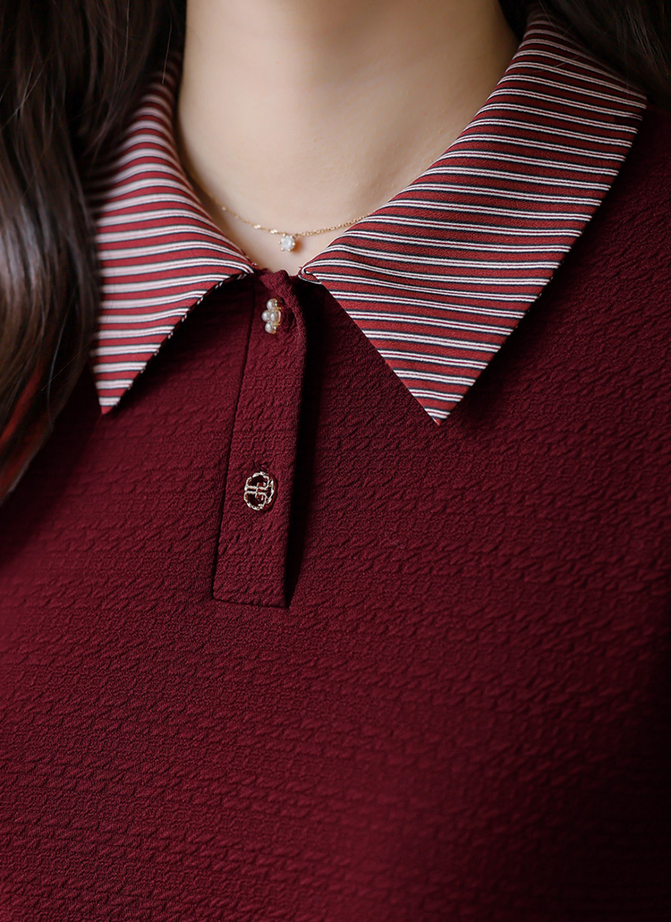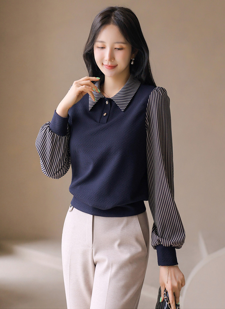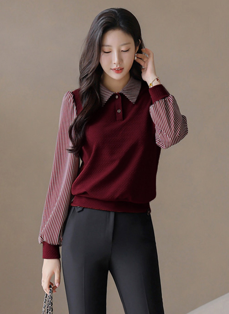 [LouisAngel] 델리안 스트라이프 배색 카라 에스닉 쟈가드 블라우스 티