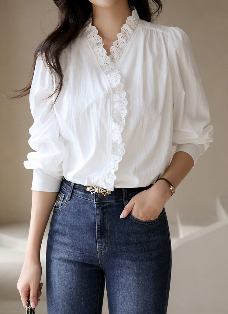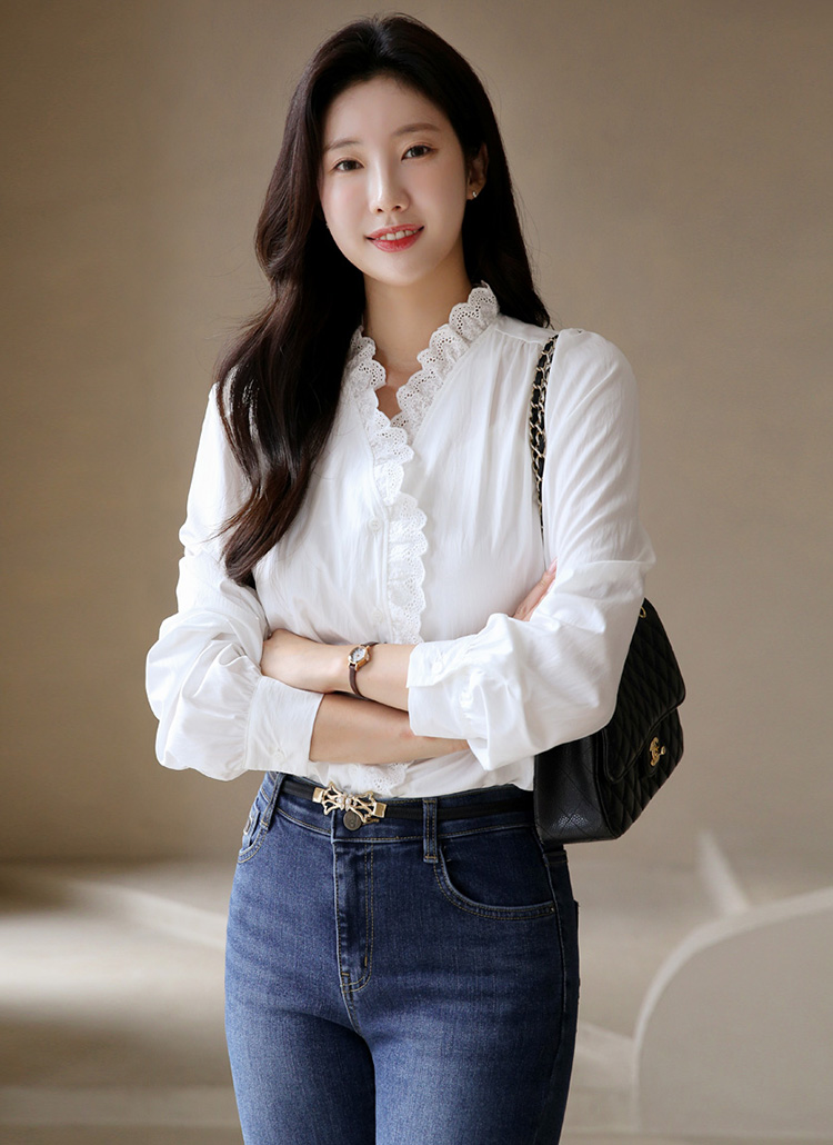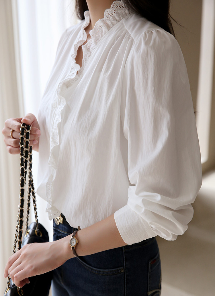 러플 레이스 디테일이 넥라인과 버튼라인을 따라 장식되어