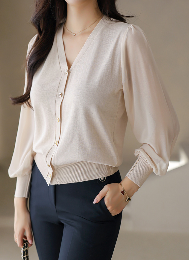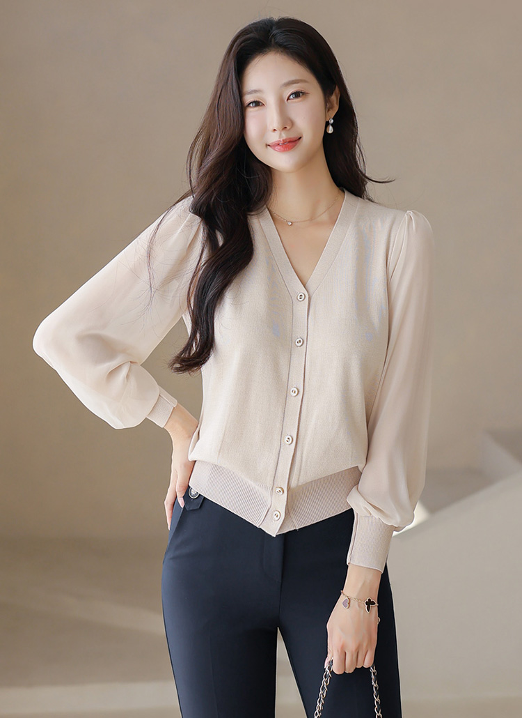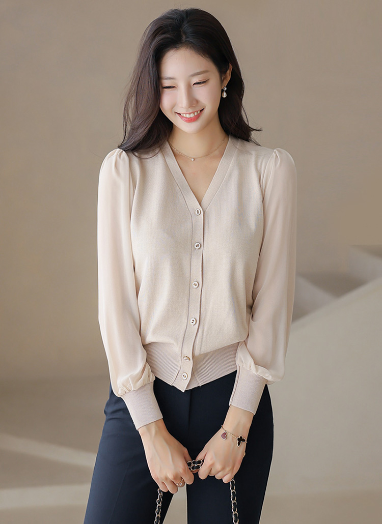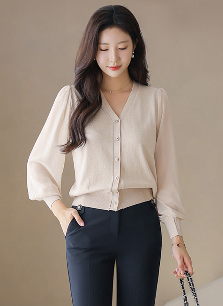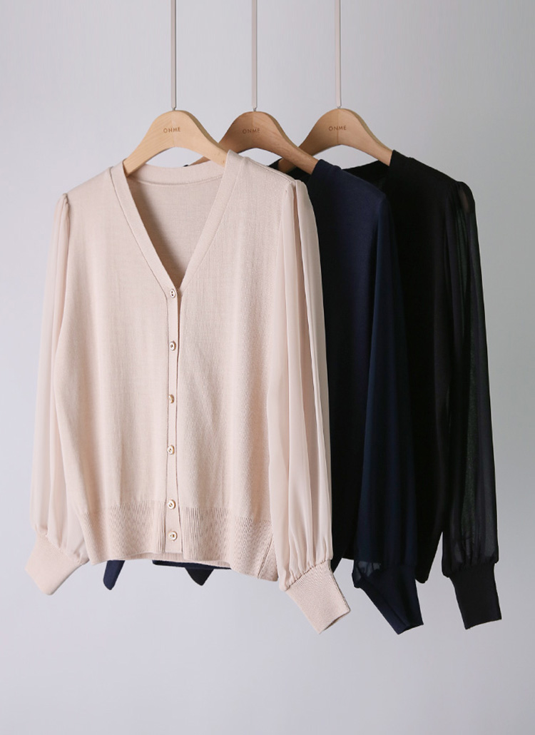 세린드 셔링 쉬폰 소매 배색 니트 블라우스 가디건