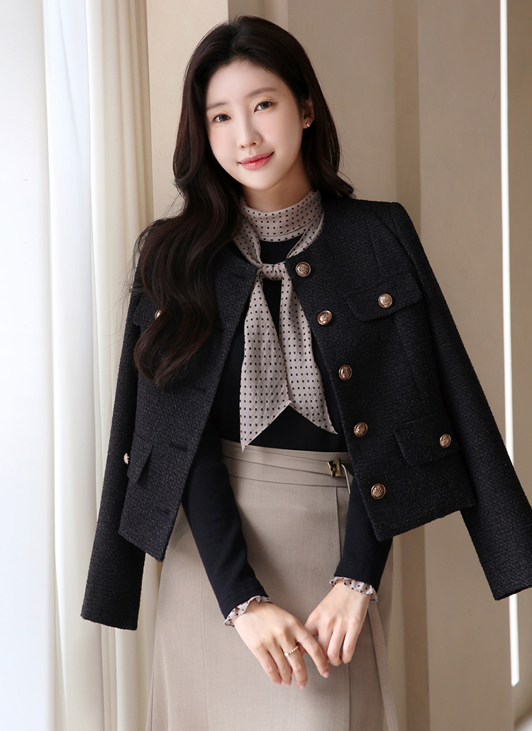 넥라인과 소매에 도트 레이어드로 러블리한 무드를 연출하는