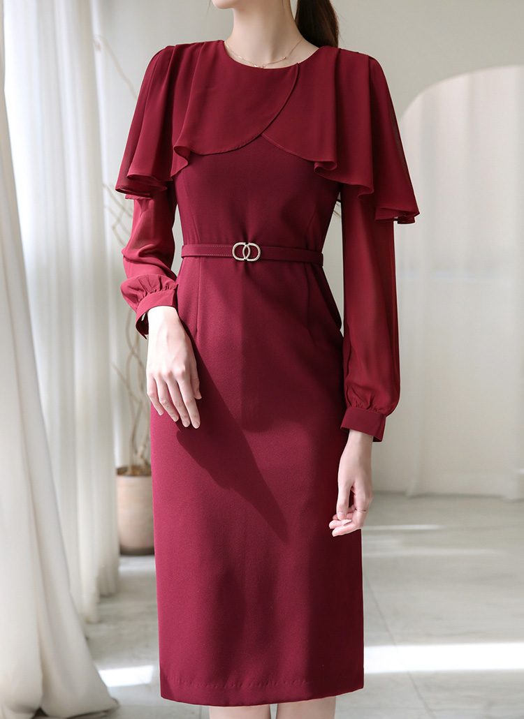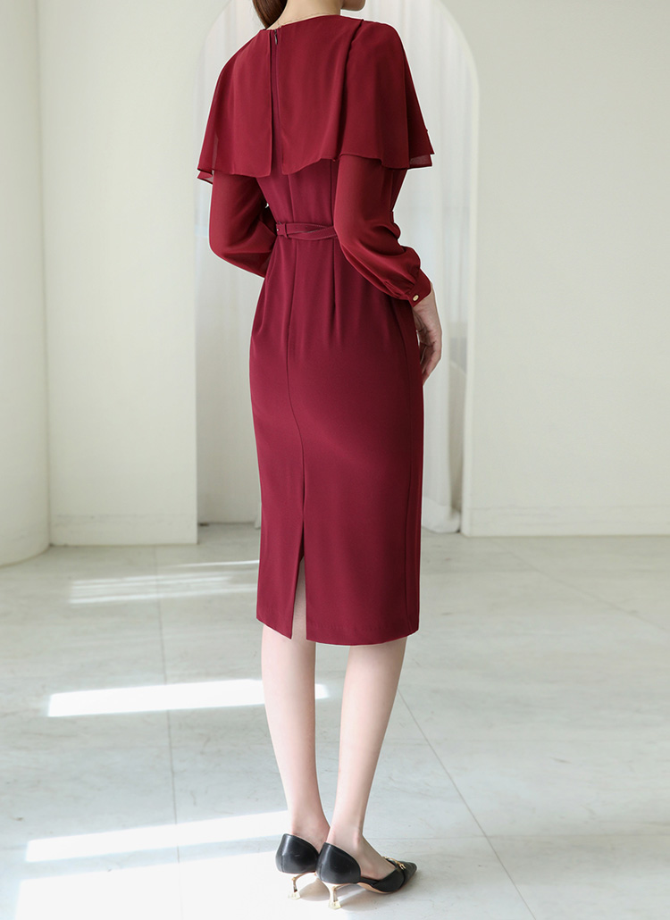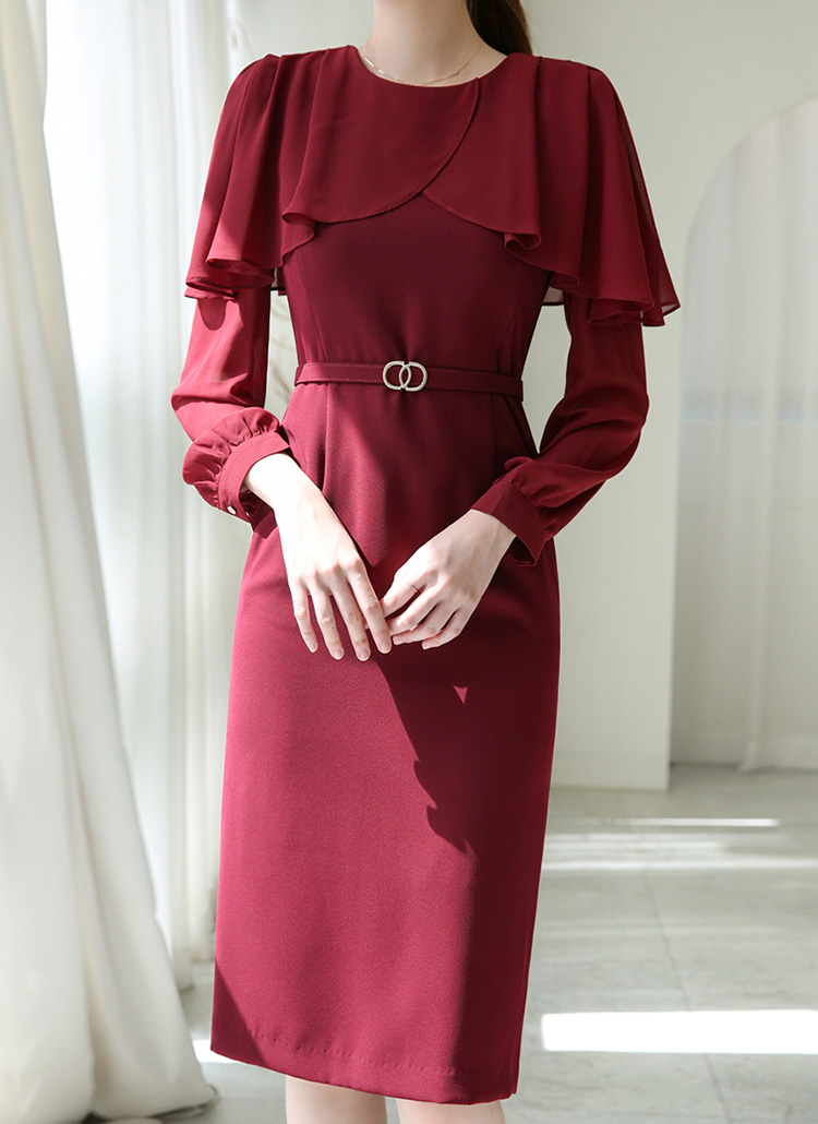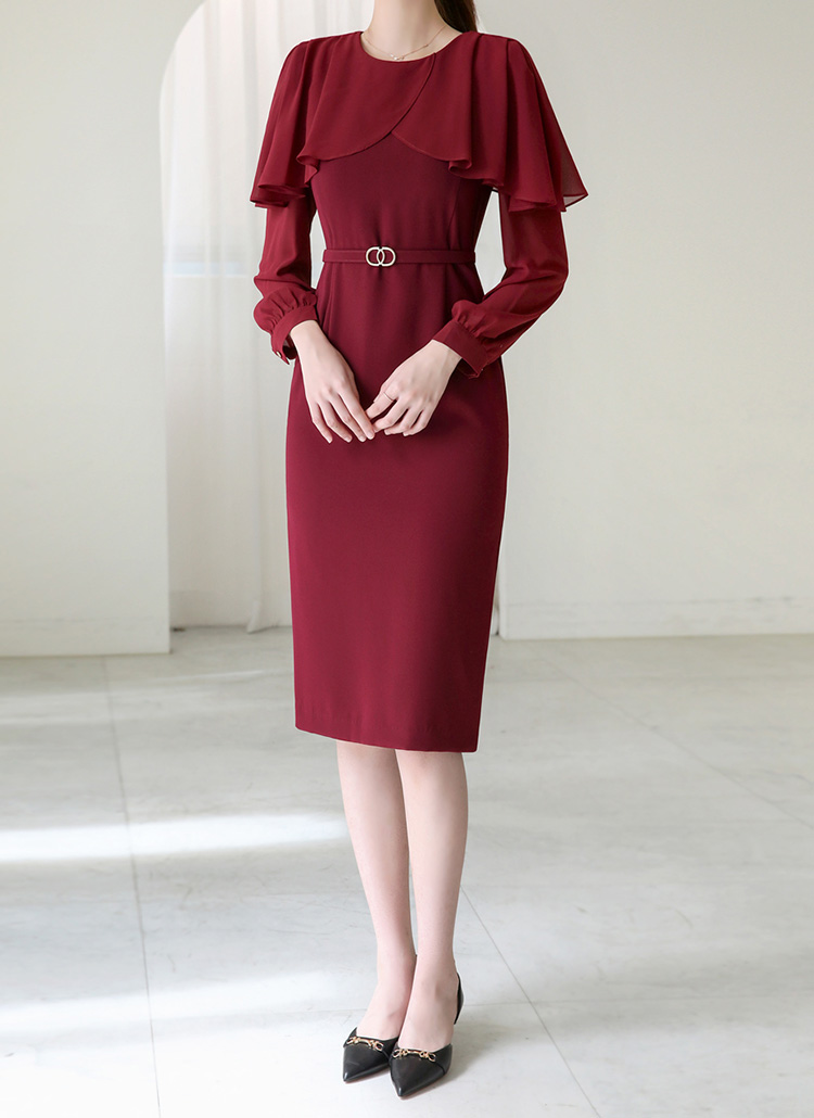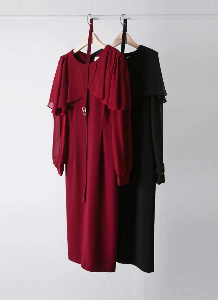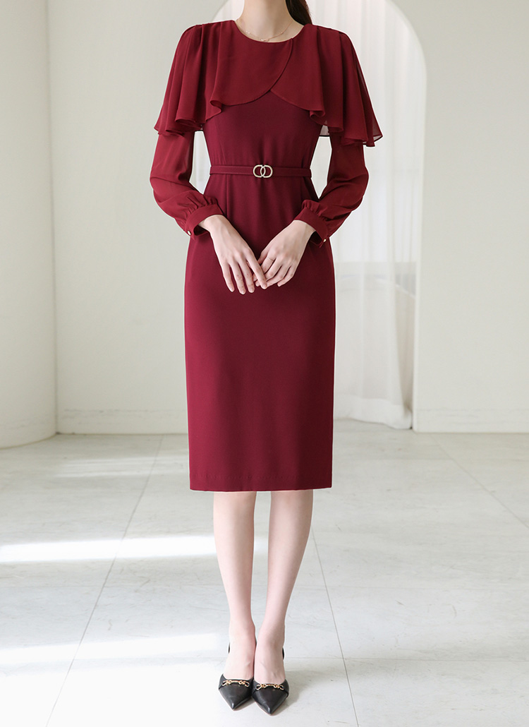 아네사 랩 셔링 쉬폰 케이프 배색 벨트SET 럭셔리 H라인 원피스
