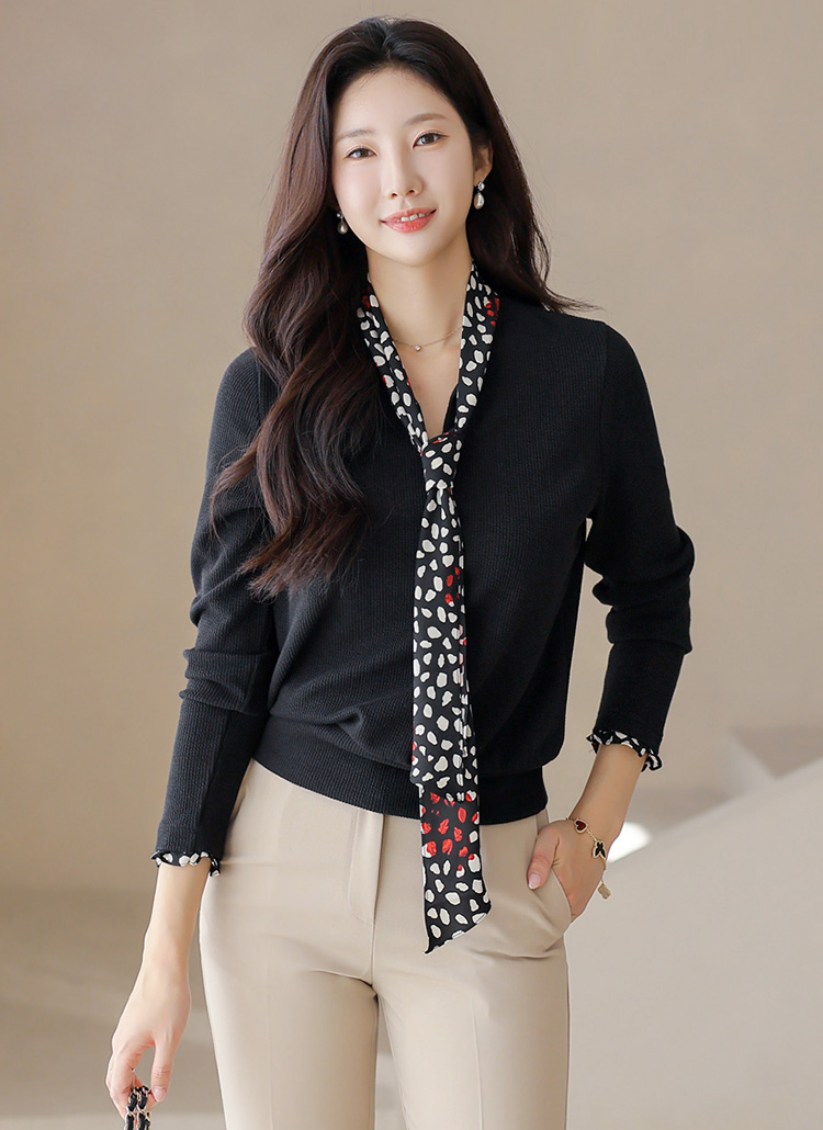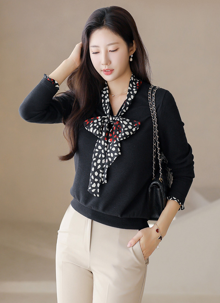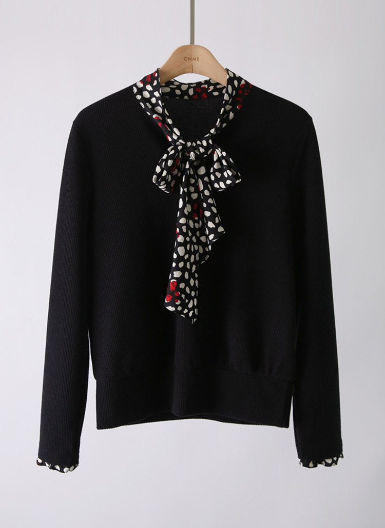 [LouisAngel] 베르나 포인트 리본 스카프 넥 톡톡 골지 블라우스 티