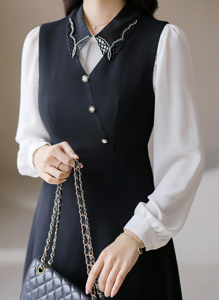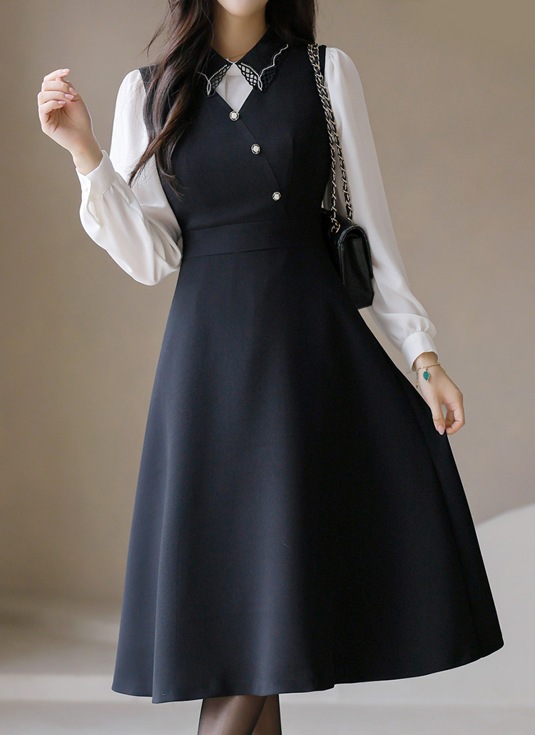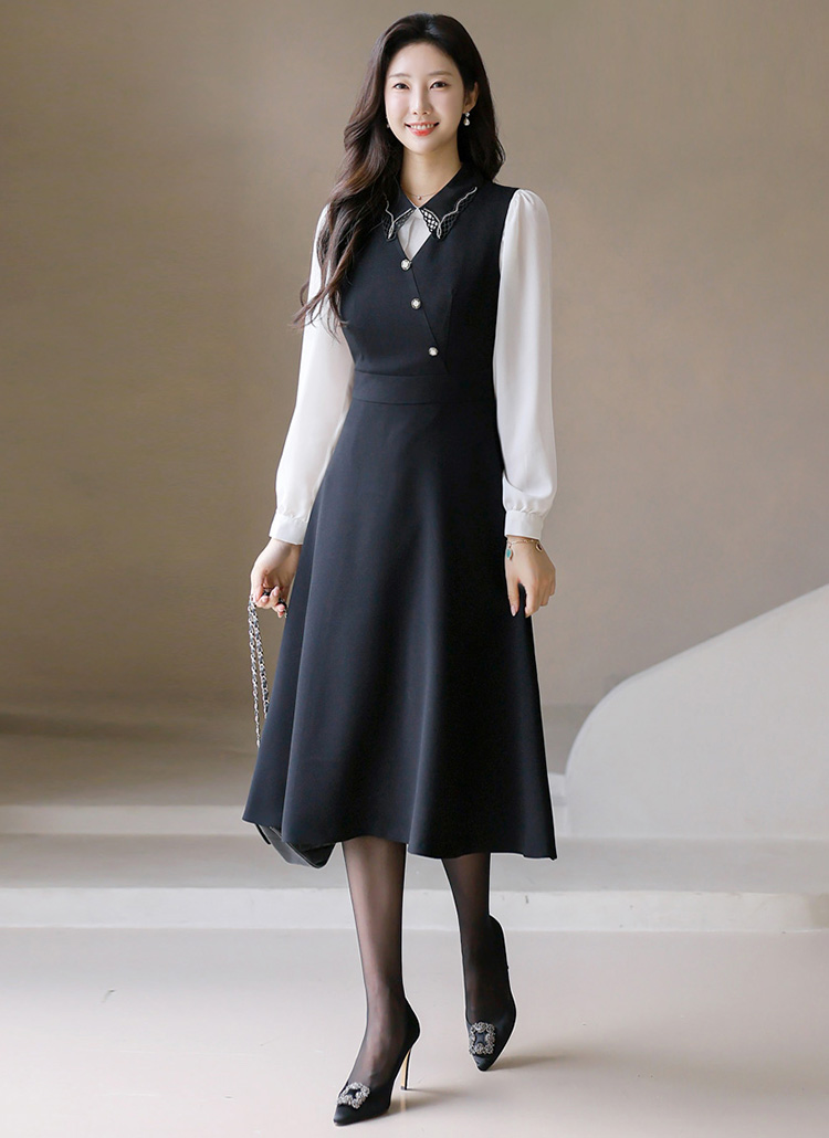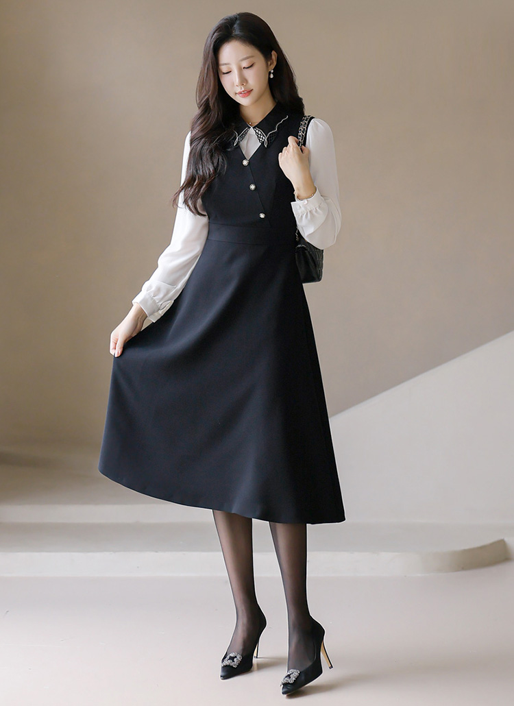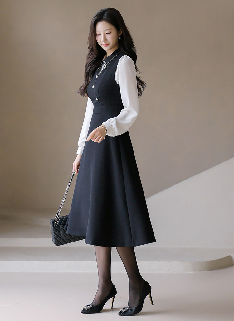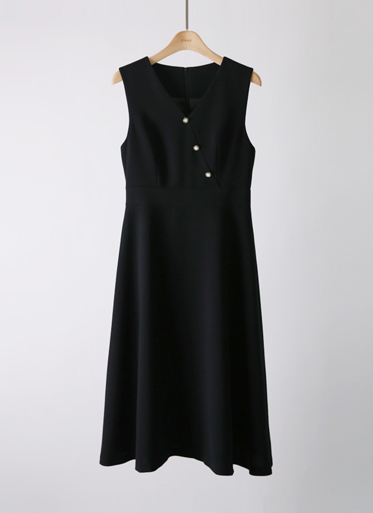[LouisAngel] 플라나 랩 디자인 진주 버튼 A라인 플레어 뷔스티에 롱 원피스