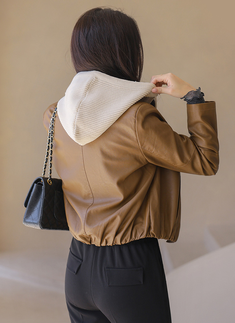 리디블 니트 후드 배색 모던 블루종 레더 자켓