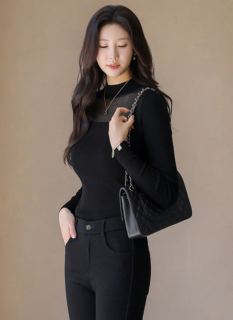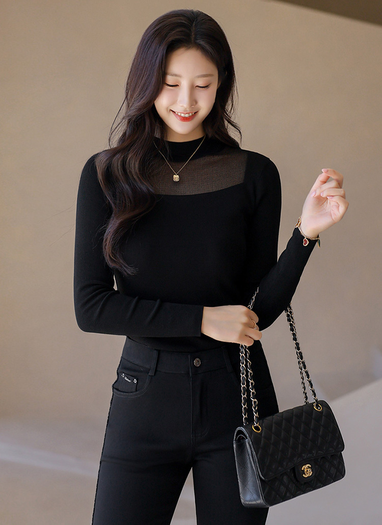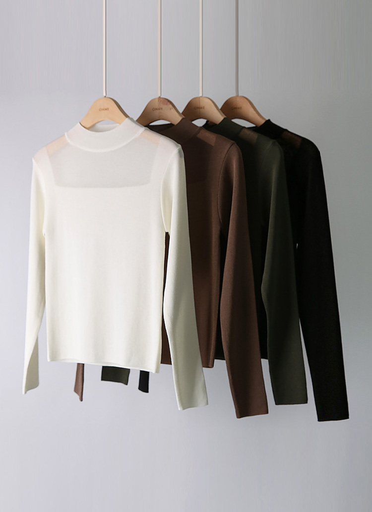 멜로어 소프트 레이온 스퀘어 시스루 배색 반하이넥 니트